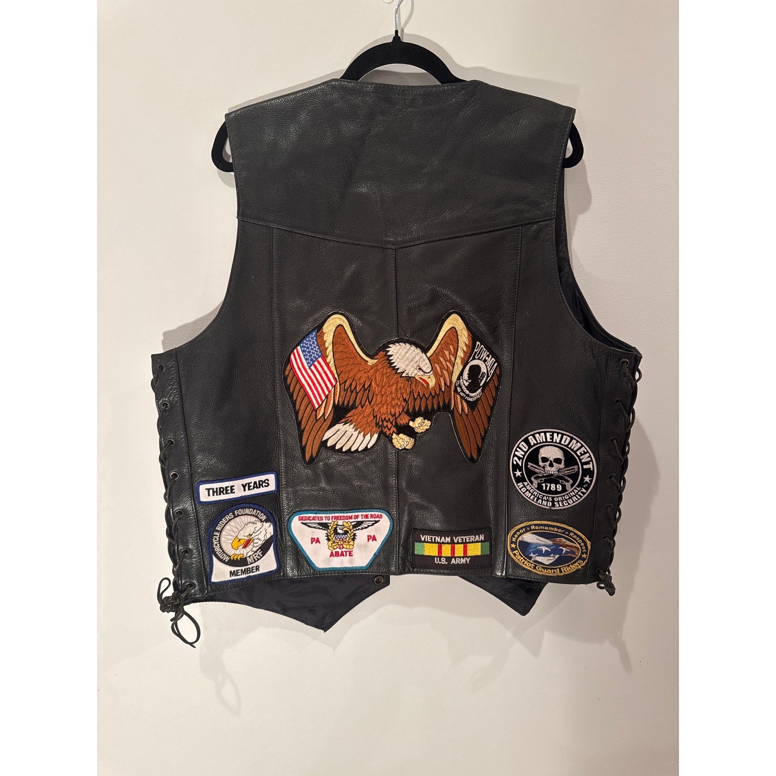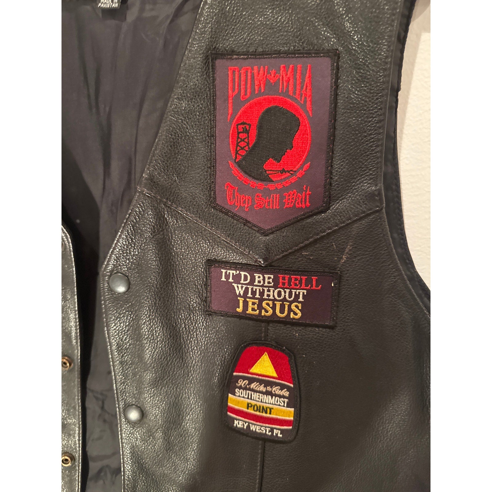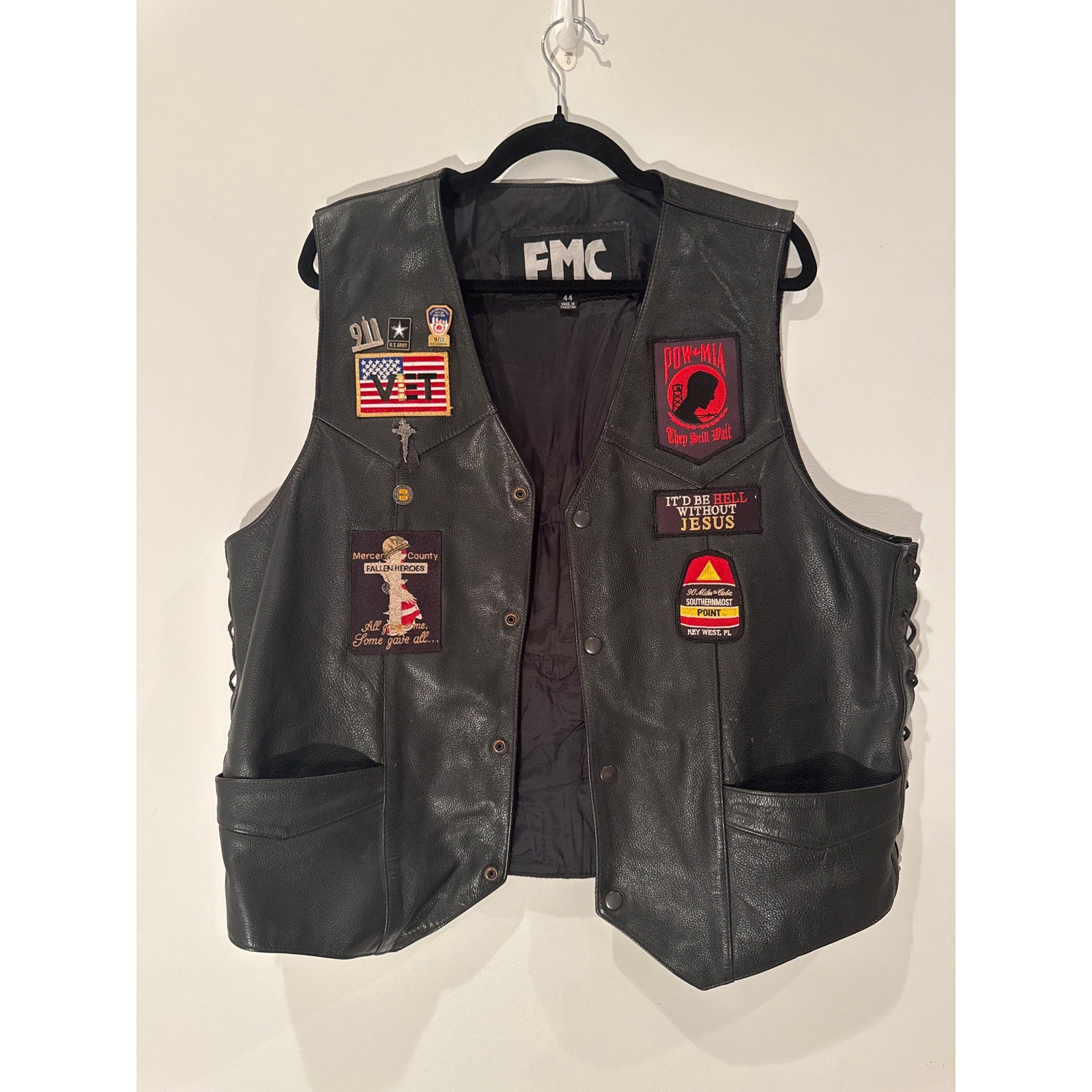 Pre-owned FMC black leather motorcycle vest in excellent condition. Size 44. Features side lace-up detailing and several sewn-on patches including military, biker, and Christian-themed graphics. No major wear or damage. All buttons and laces intact. A standout piece for collectors or riders. From a smoke-free home.
