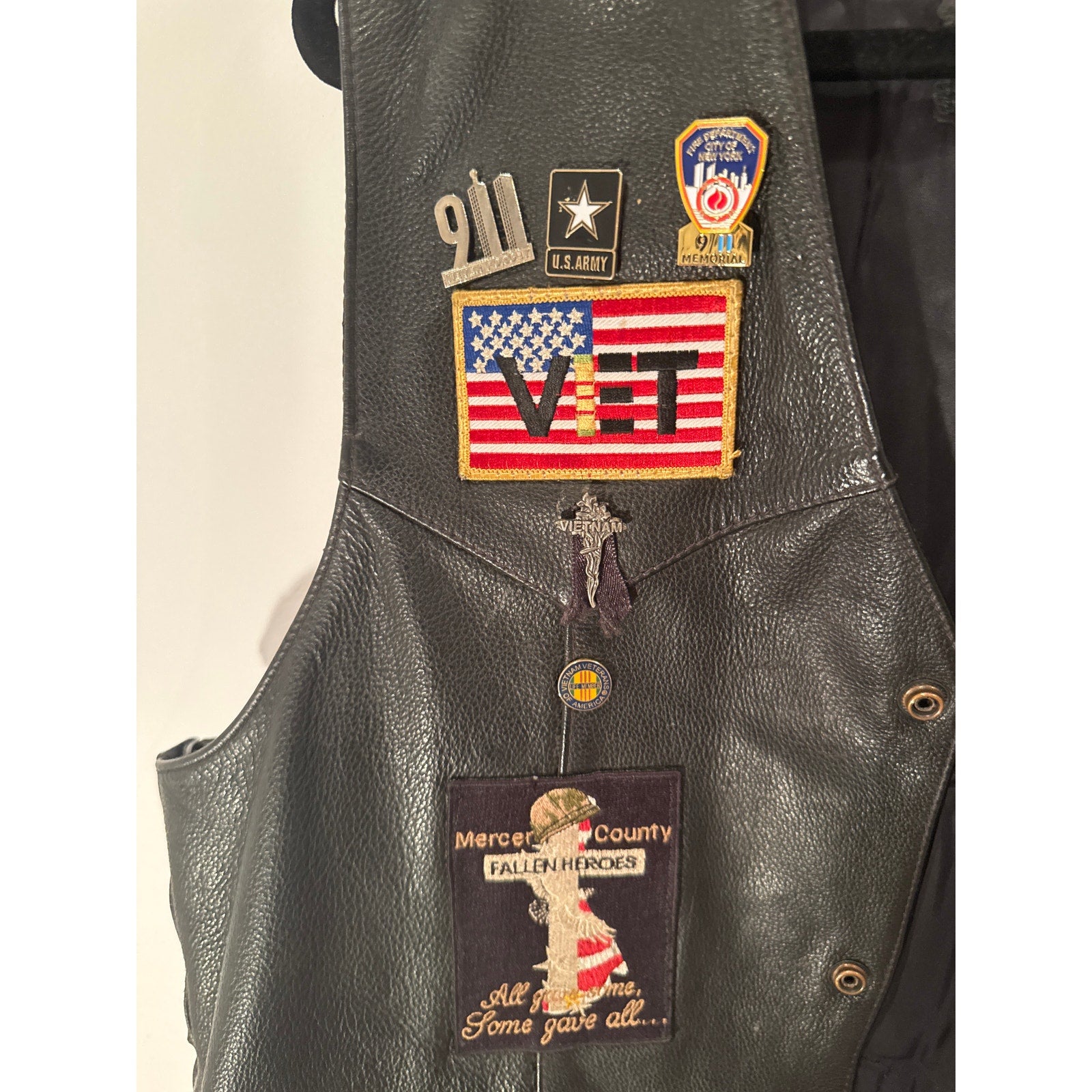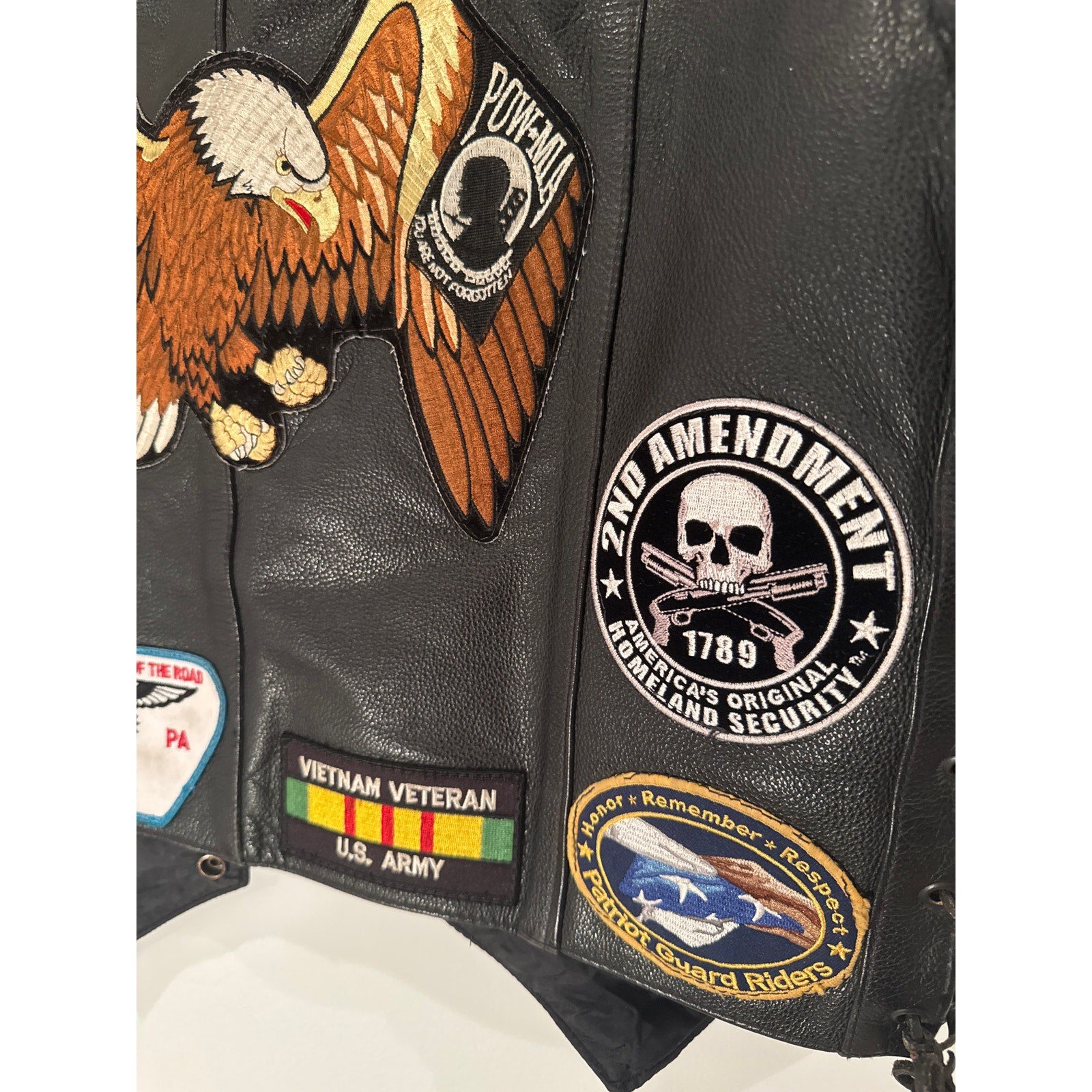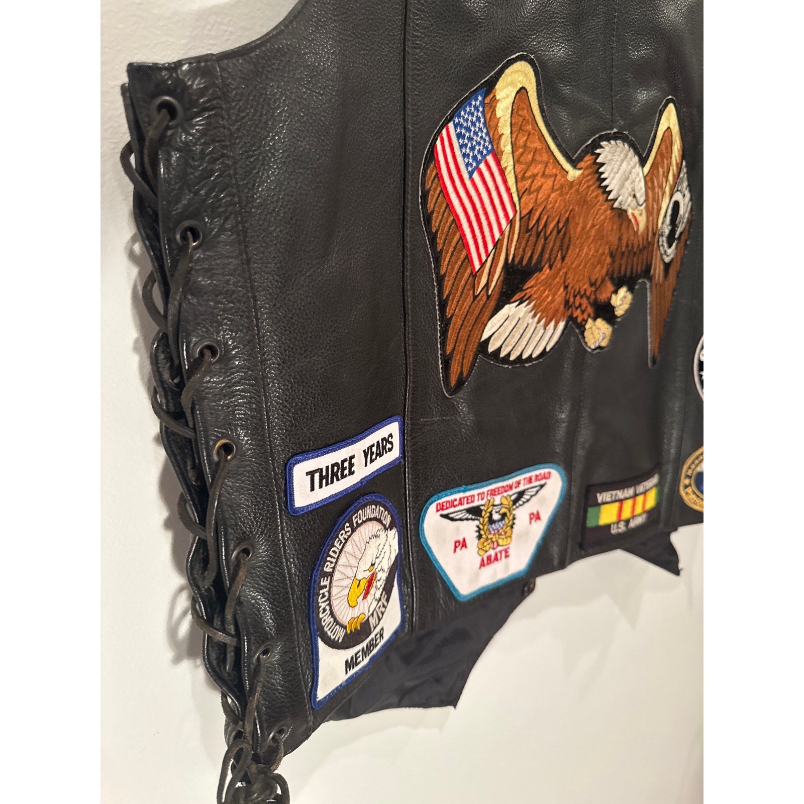 Pre-owned FMC black leather motorcycle vest in excellent condition. Size 44. Features side lace-up detailing and several sewn-on patches including military, biker, and Christian-themed graphics. No major wear or damage. All buttons and laces intact. A standout piece for collectors or riders. From a smoke-free home.