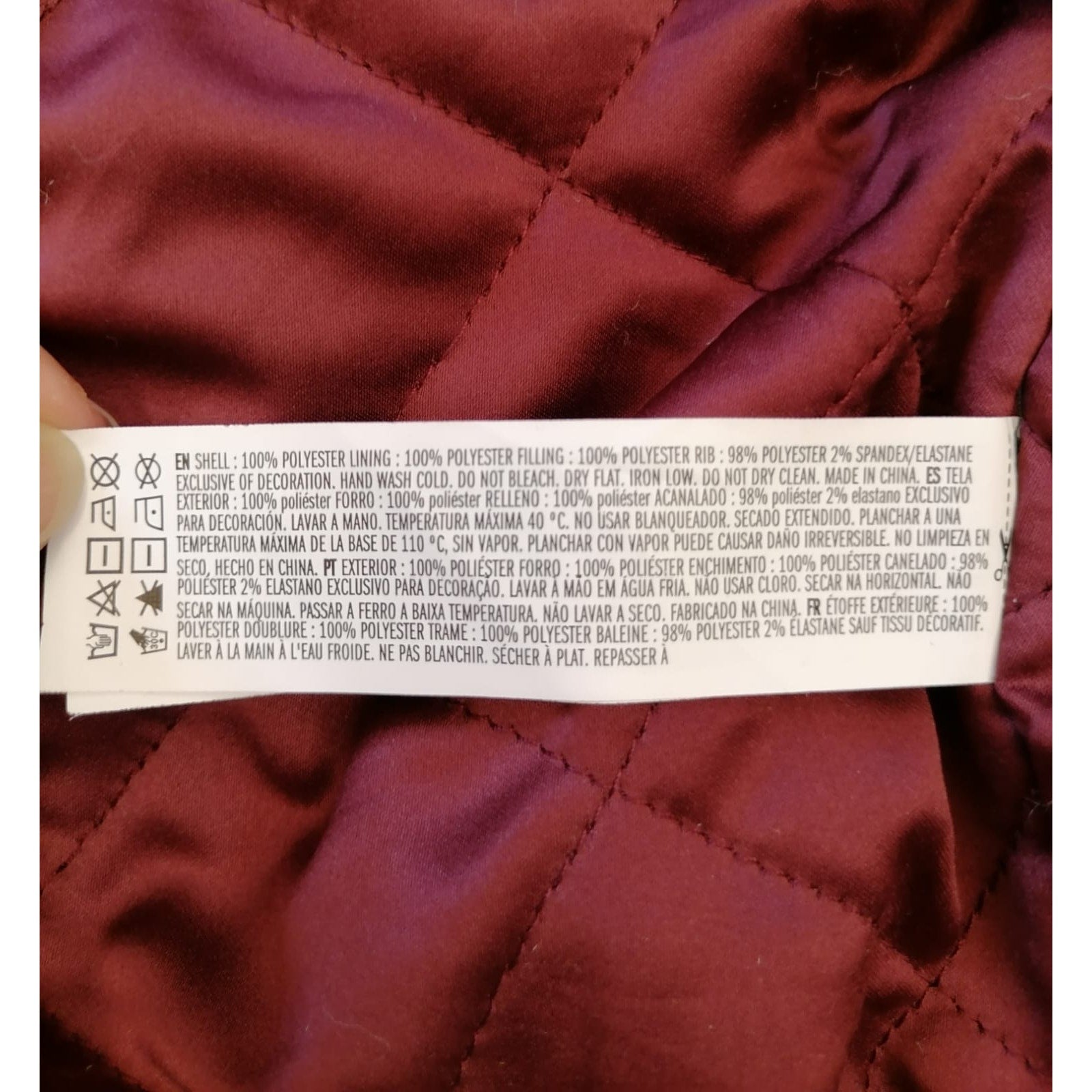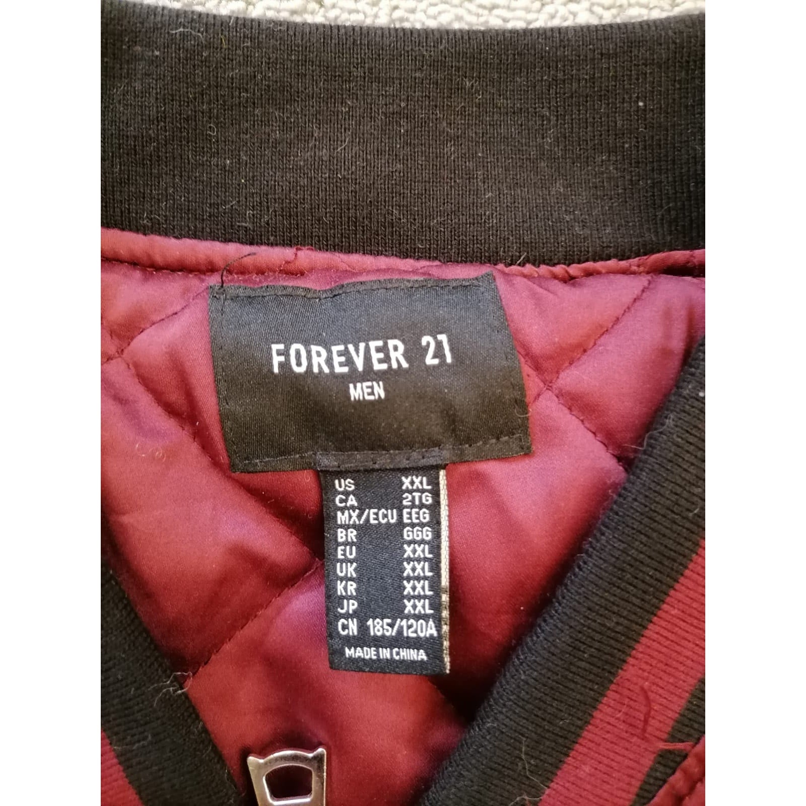 Two‑tone bomber jacket from Forever 21 (Men’s XXL) featuring rich burgundy body panels with contrasting black sleeves and striped rib-knit collar, cuffs, and hem; quilted lining and full-length zipper closure offer both style and warmth. Classic streetwear-inspired silhouette with subtle sheen.