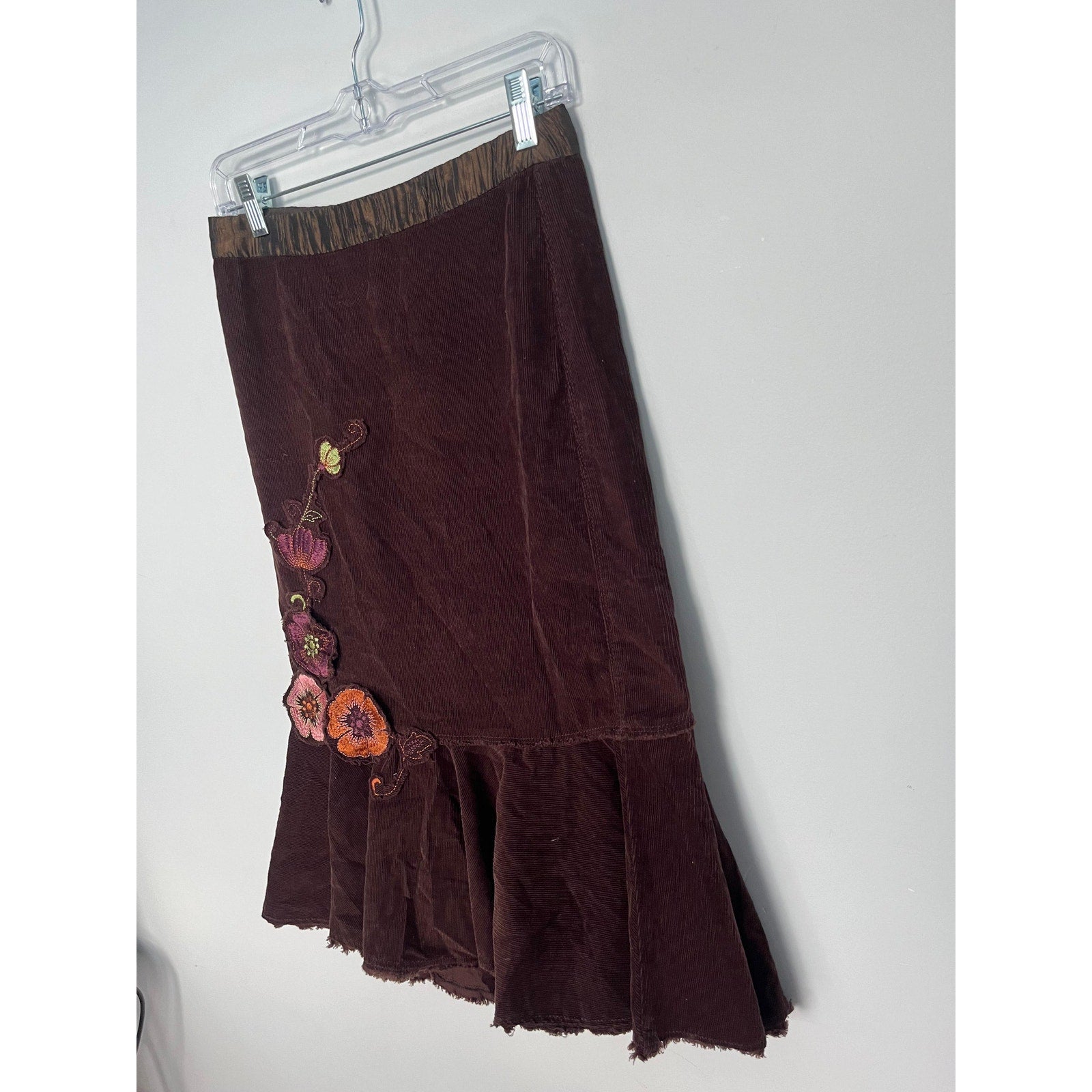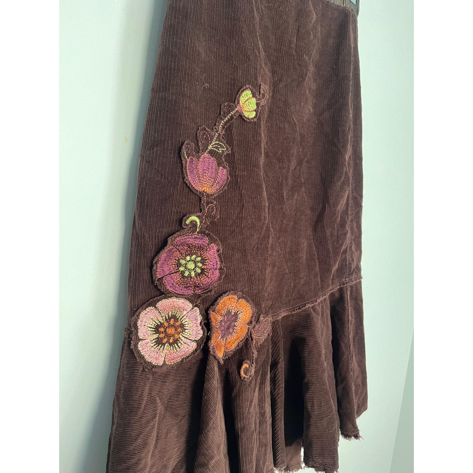 Boho-style brown corduroy skirt with vibrant embroidered floral details and a flouncy raw-edge ruffle hem. Side zipper closure. Rich texture and retro vibes perfect for transitional seasons.