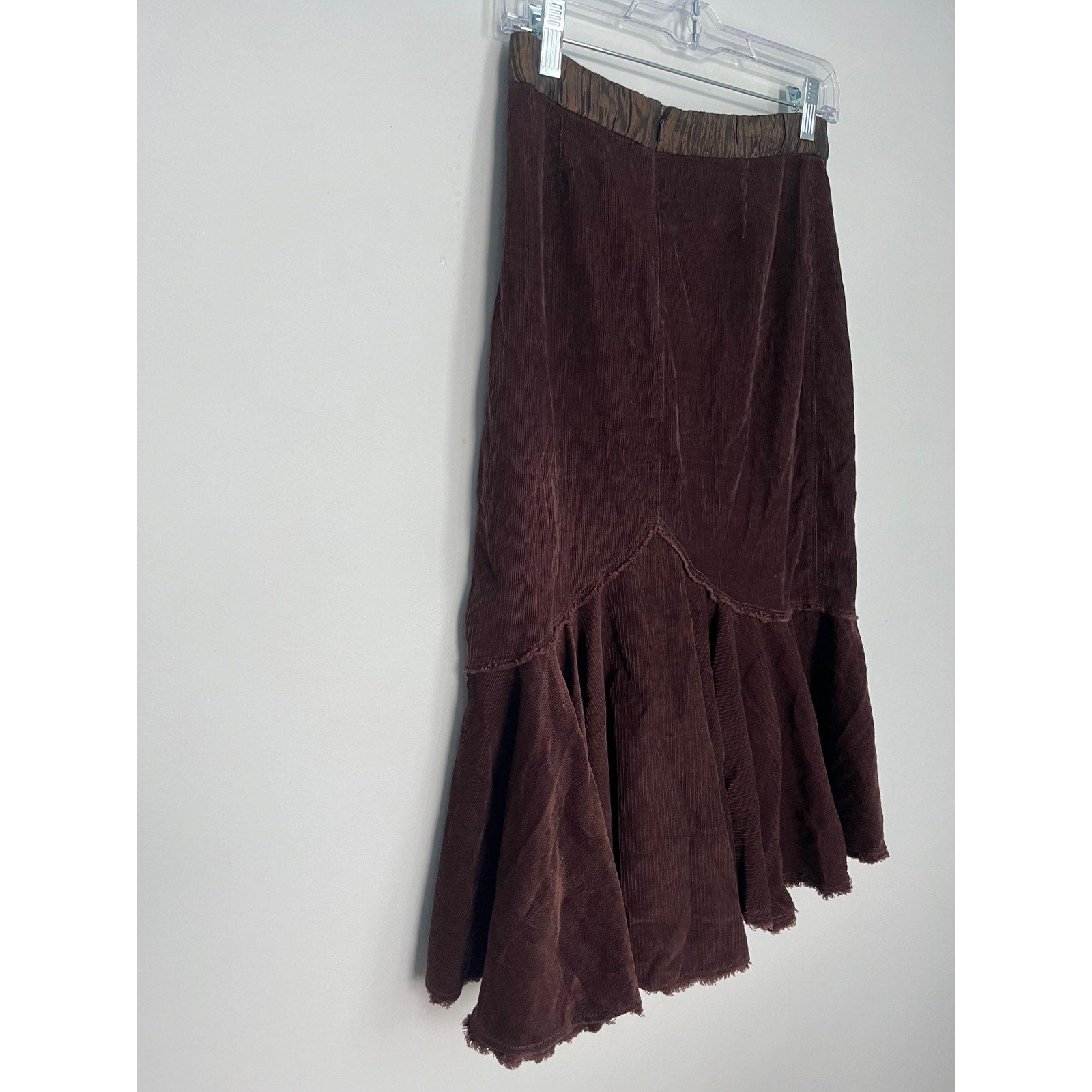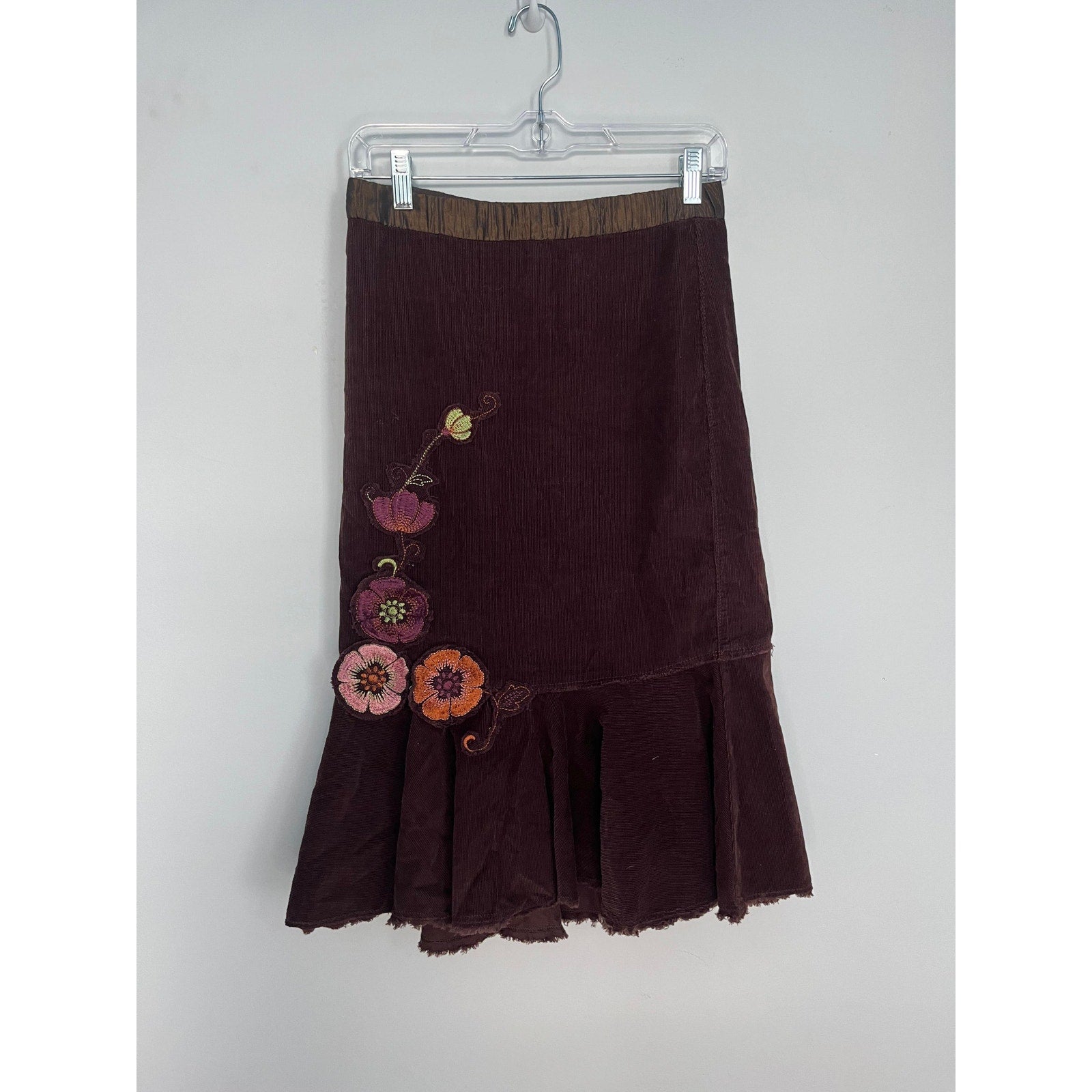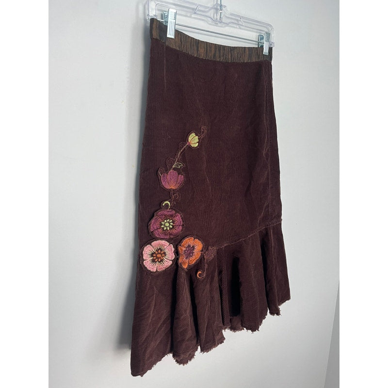 Free People Corduroy Skirt Women 0 Brown Floral Embroidered Ruffle Hem Boho