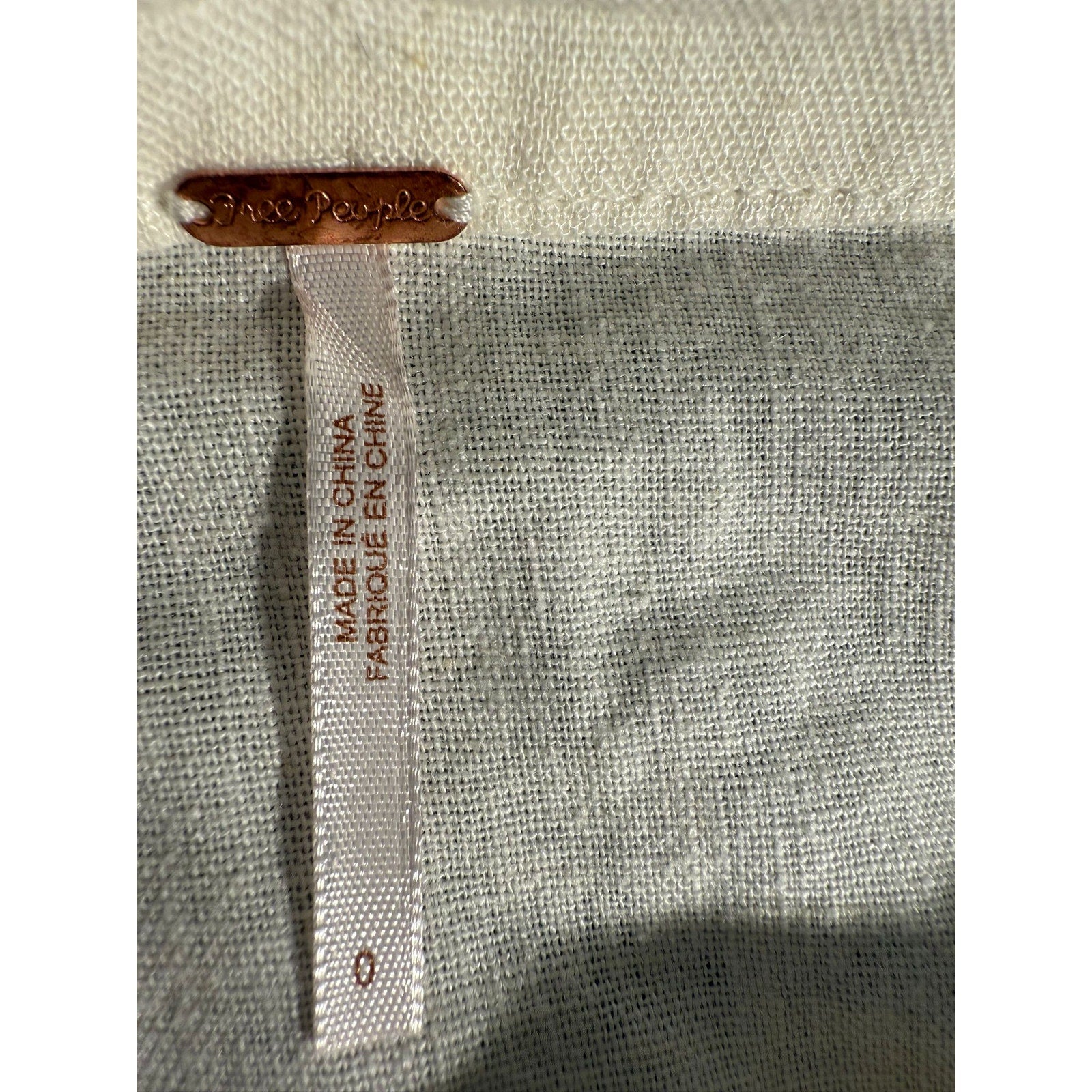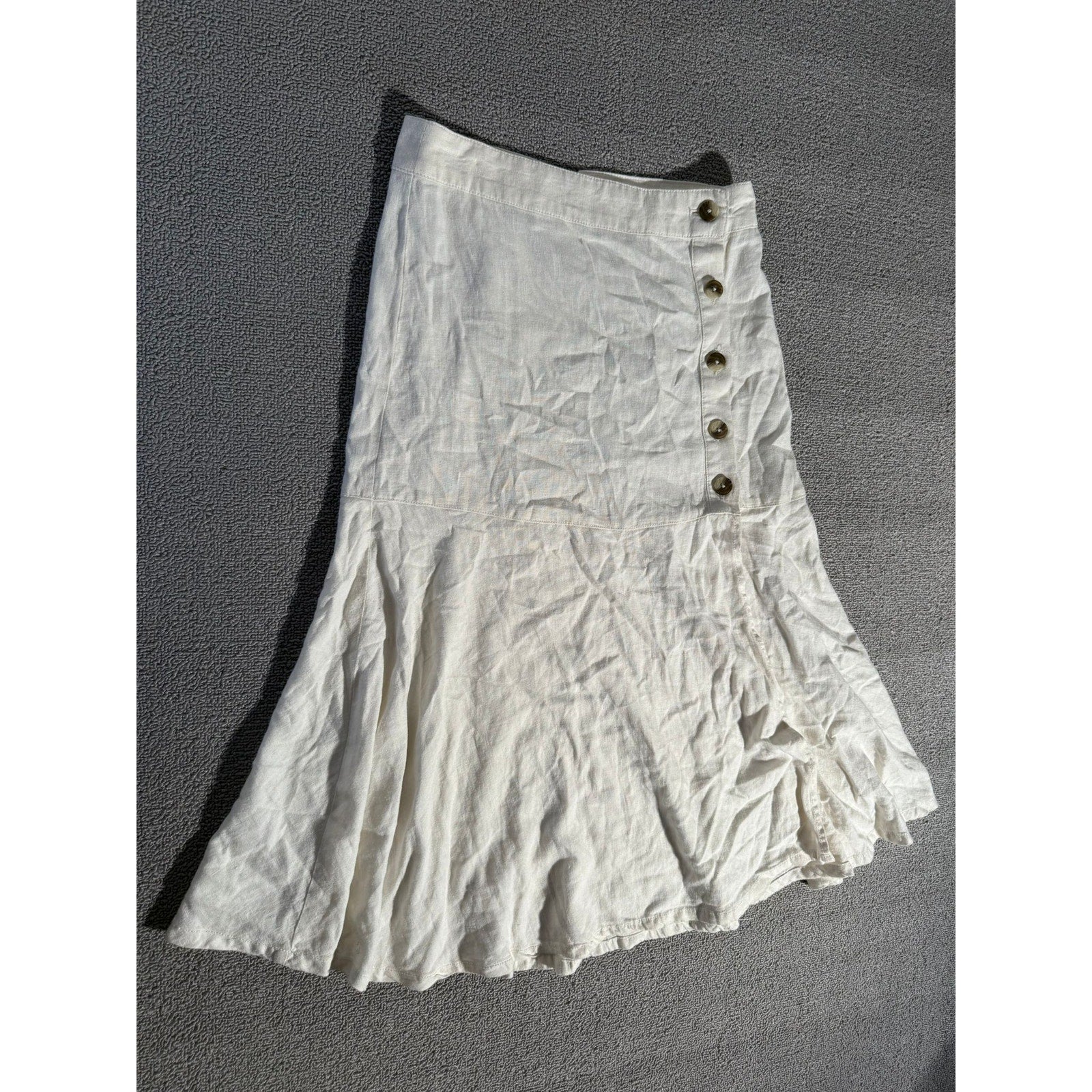 Soft white linen-blend skirt featuring a high-rise waist with a button-front closure and playful flounce hem, offering breezy movement and effortless boho flair.