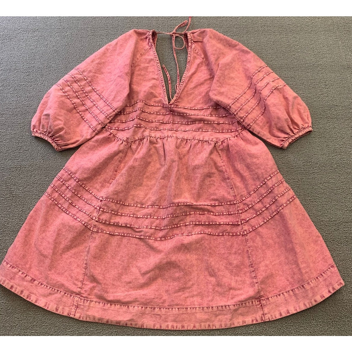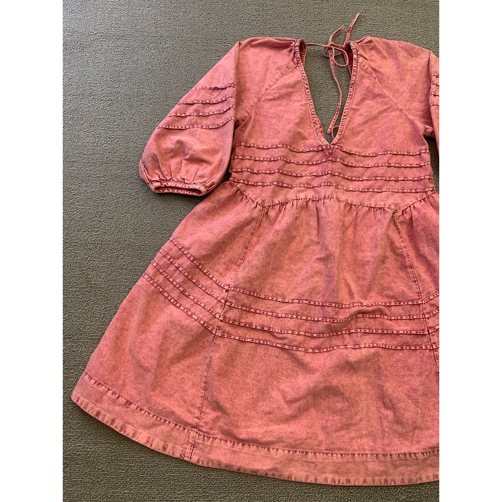 A feminine rose-pink babydoll mini dress from Free People featuring puffed elbow sleeves, deep V-neck with tie closure at the back, delicate pintuck detailing across the bodice and tiered skirt for a relaxed A-line fit. The soft washed cotton gives it a textured, bohemian vibe with plenty of drape and movement.