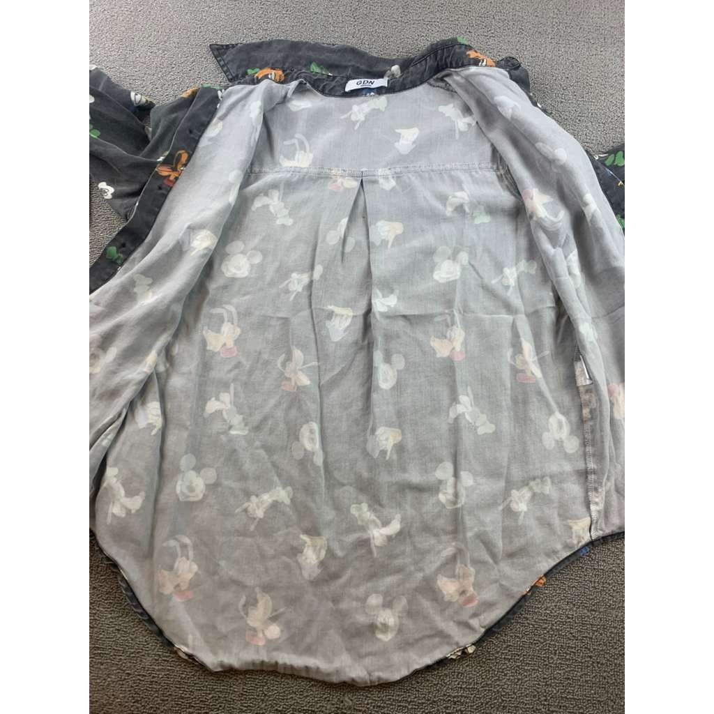 Washed black long sleeve button-down with allover Mickey Donald Goofy Pluto print, curved drop-tail hem and button cuffs. Soft twill hand; casual relaxed fit—great for streetwear or park days.