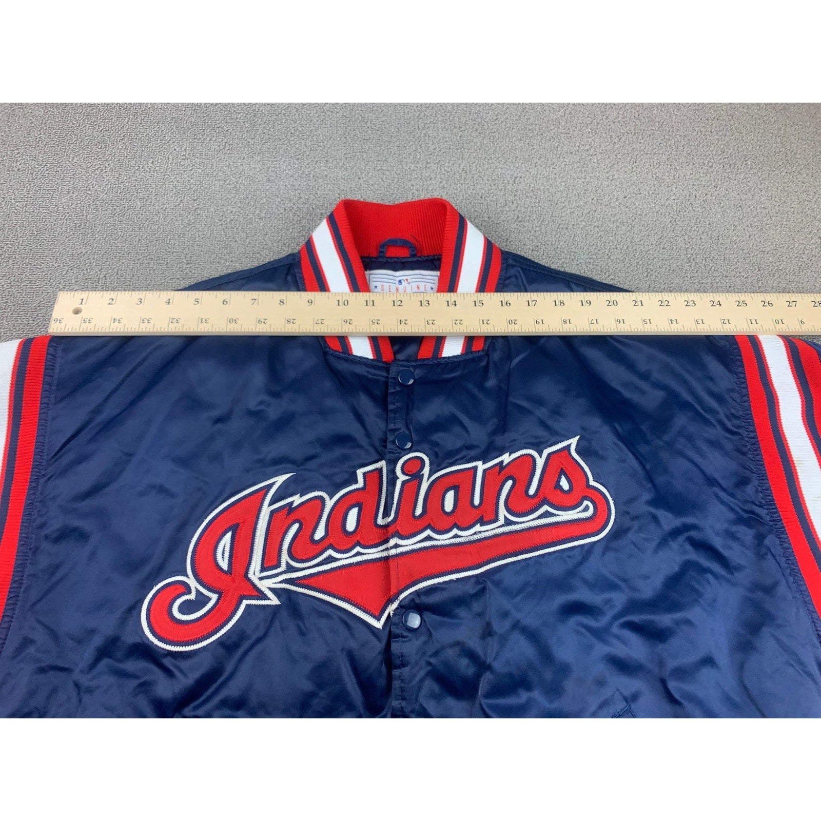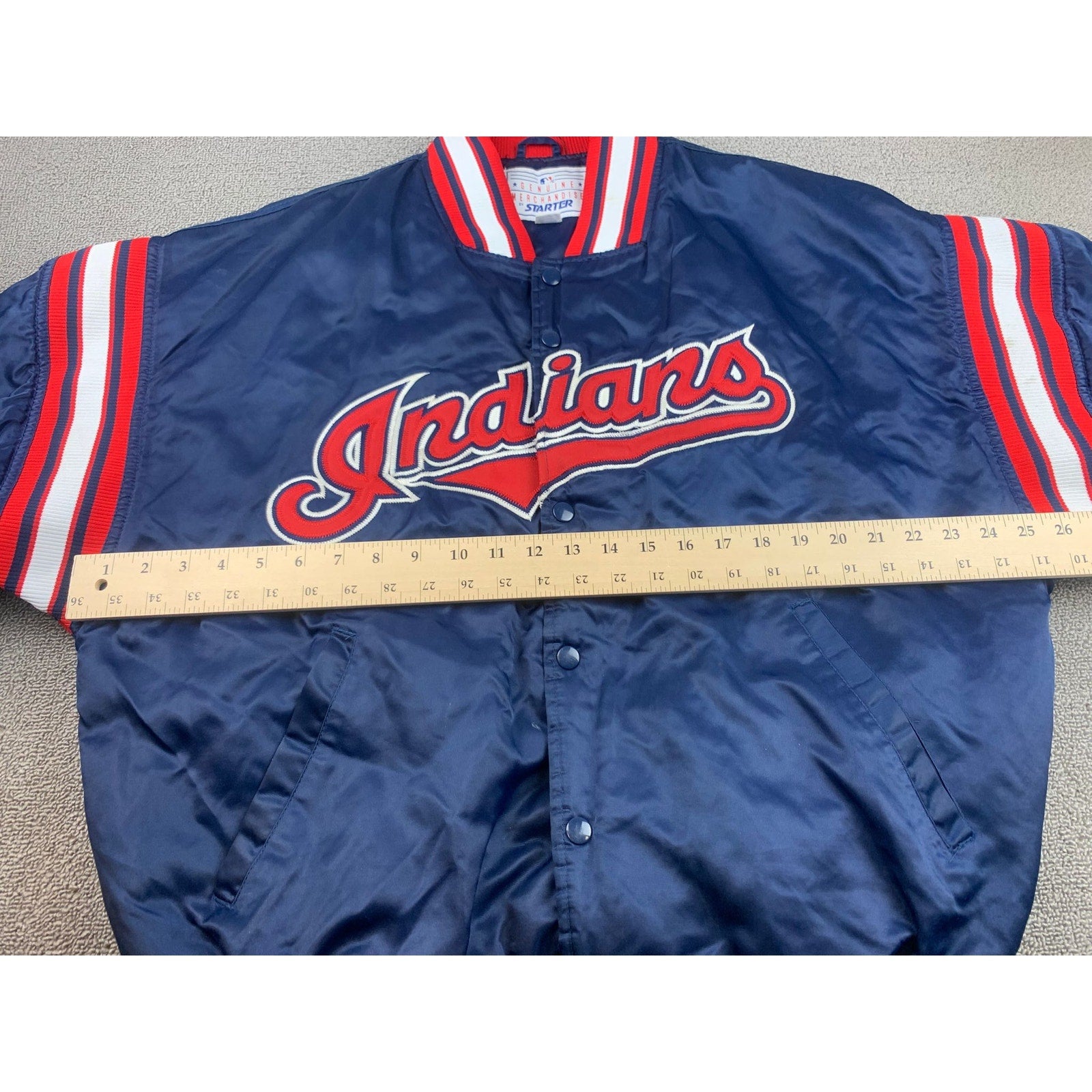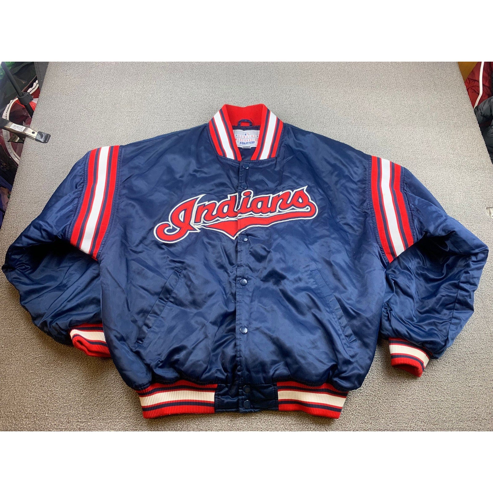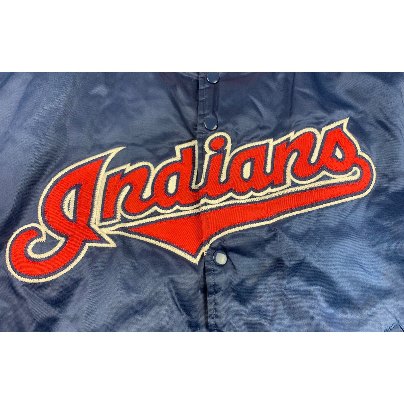 Authentic vintage Starter Cleveland Indians satin bomber, featuring classic navy shell with red and white striped rib-knit cuffs and collar, and prominently embroidered “Indians” script. Warm quilted lining and snap-front closure—ideal retro sportswear staple.