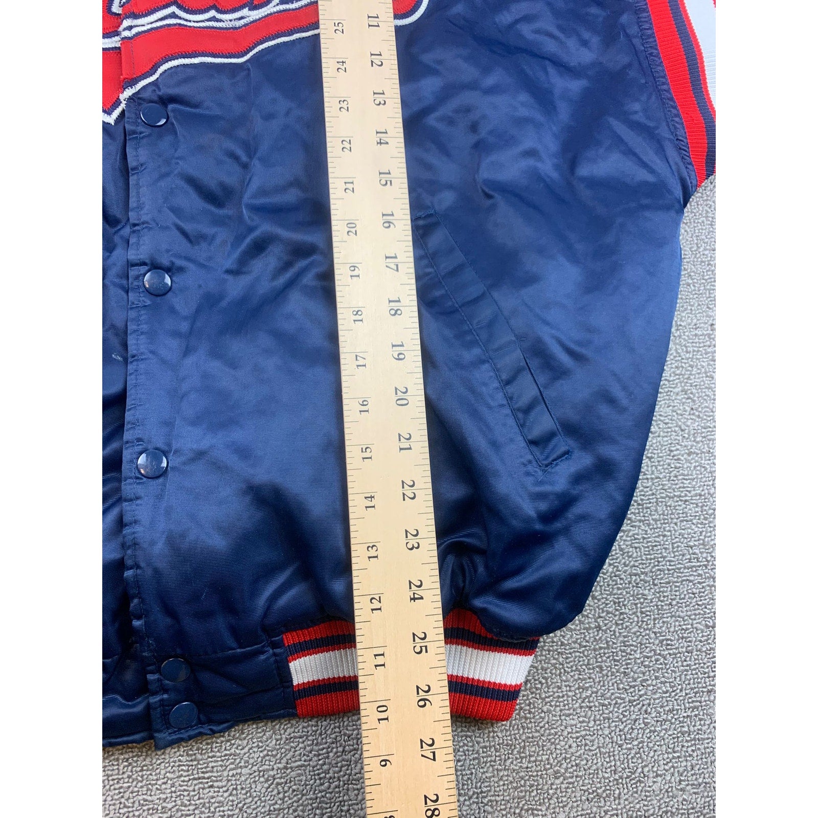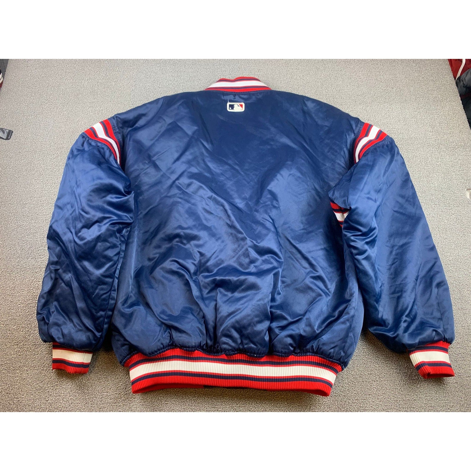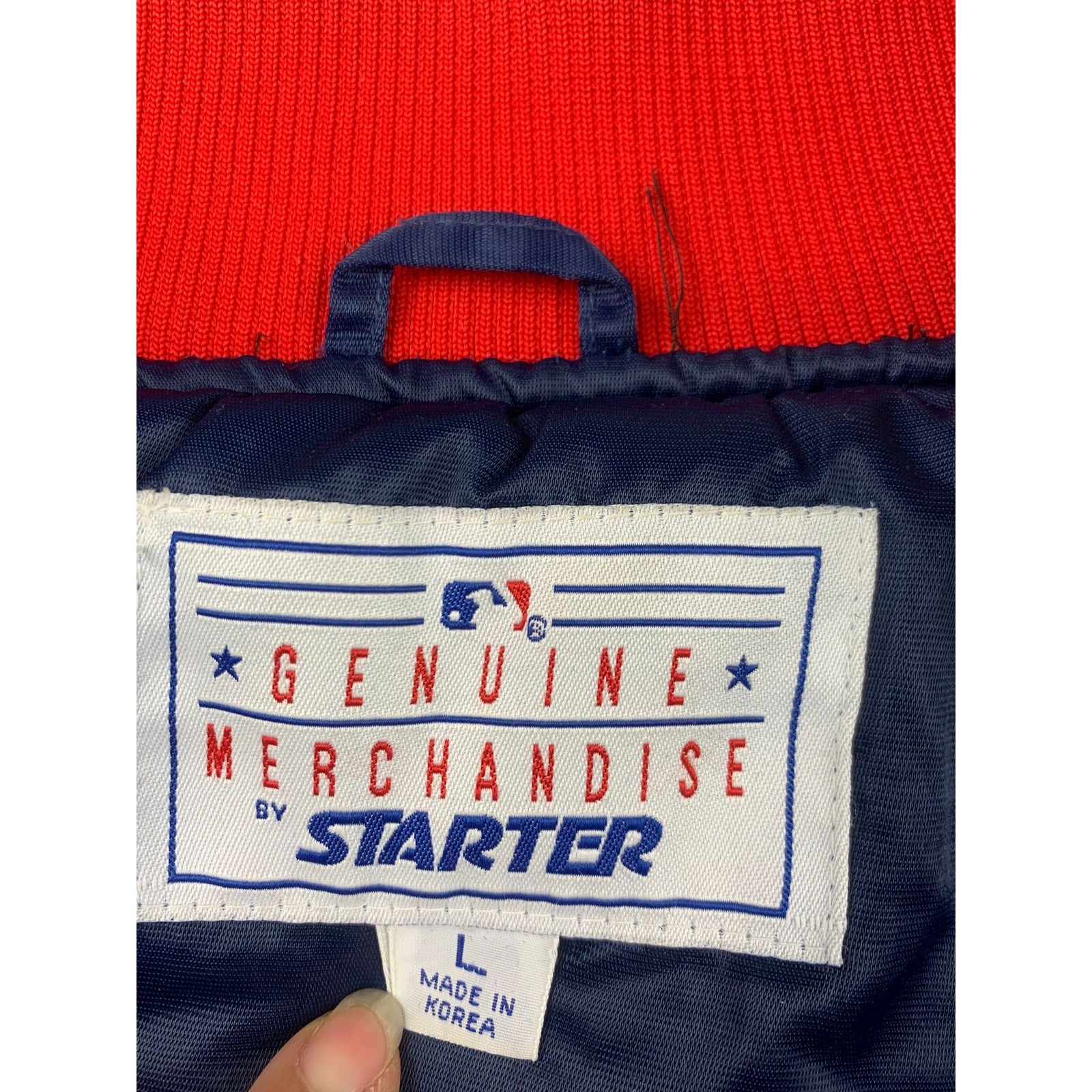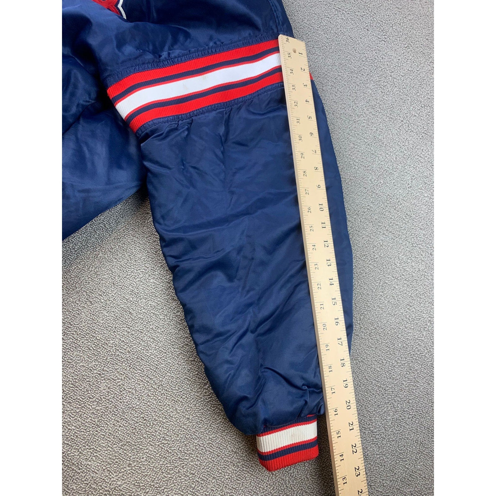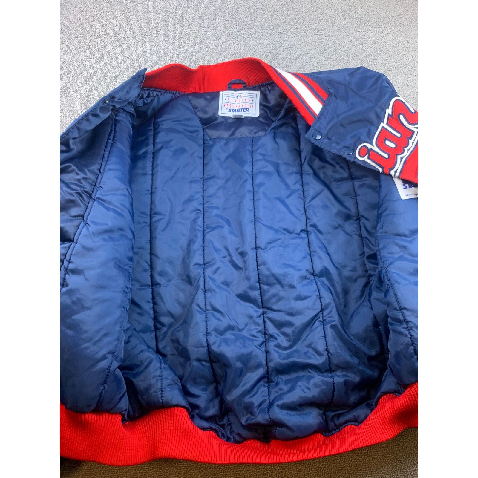 Authentic vintage Starter Cleveland Indians satin bomber, featuring classic navy shell with red and white striped rib-knit cuffs and collar, and prominently embroidered “Indians” script. Warm quilted lining and snap-front closure—ideal retro sportswear staple.