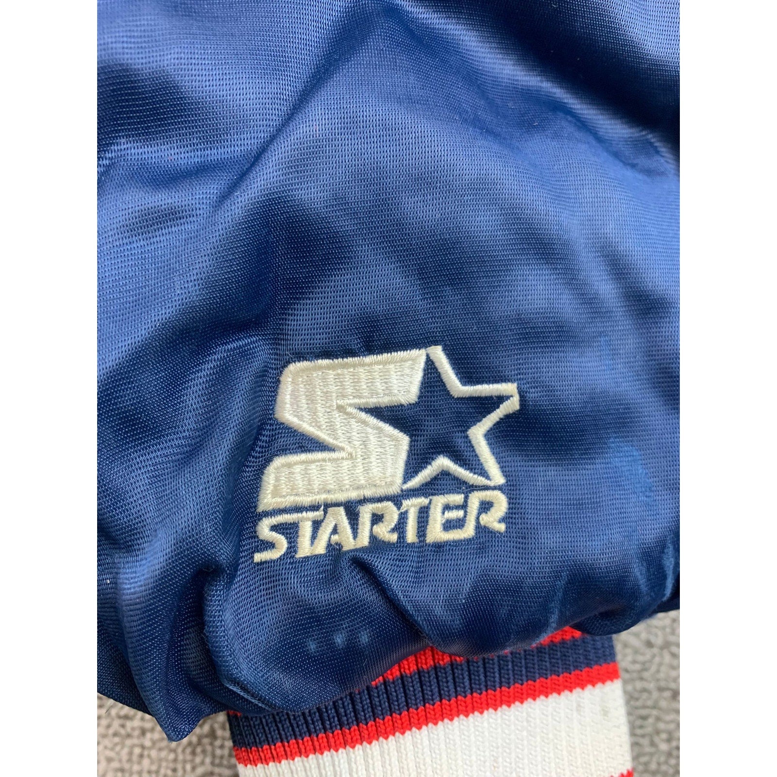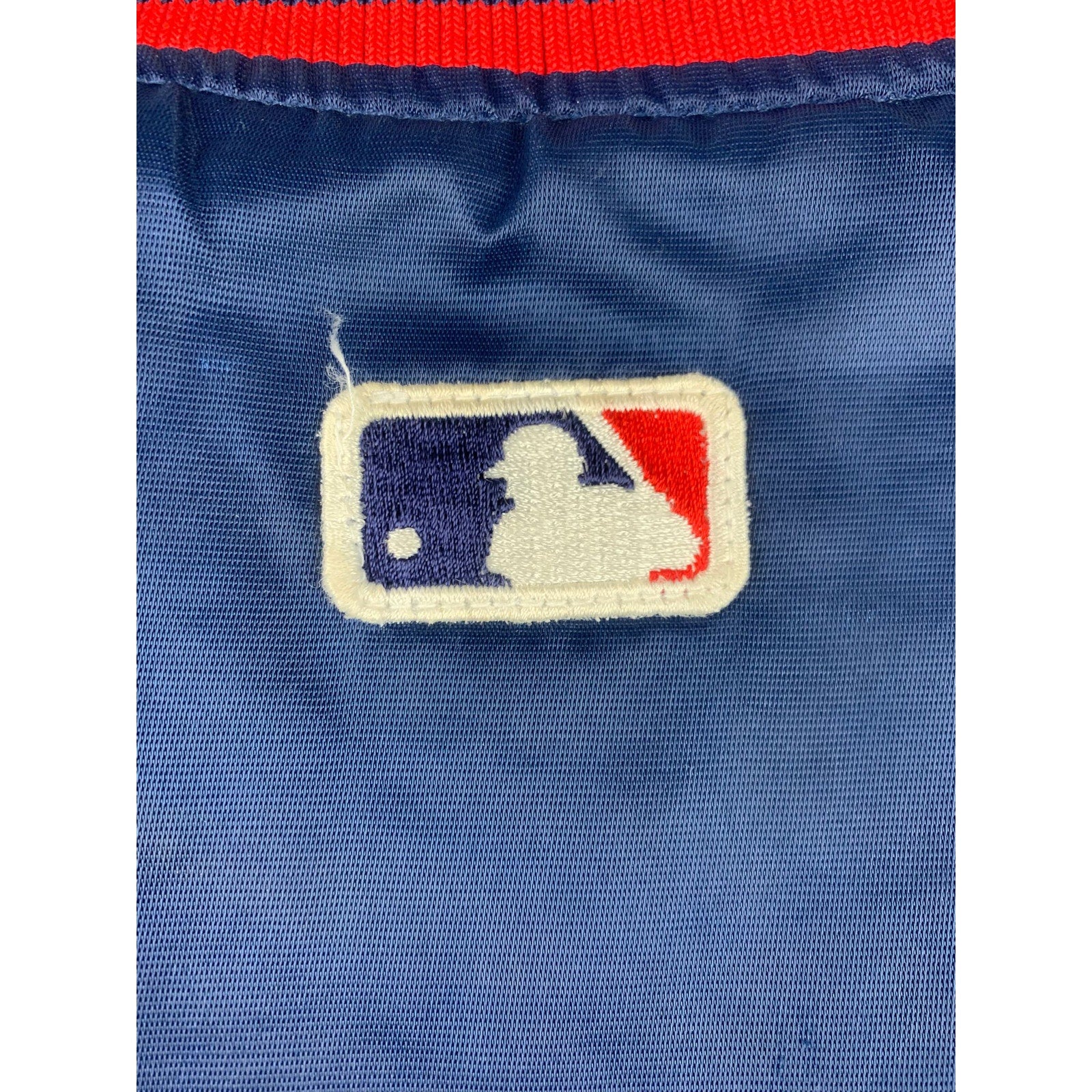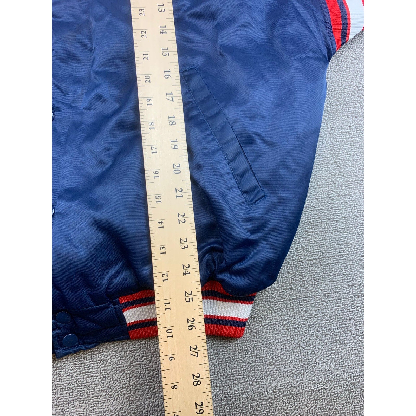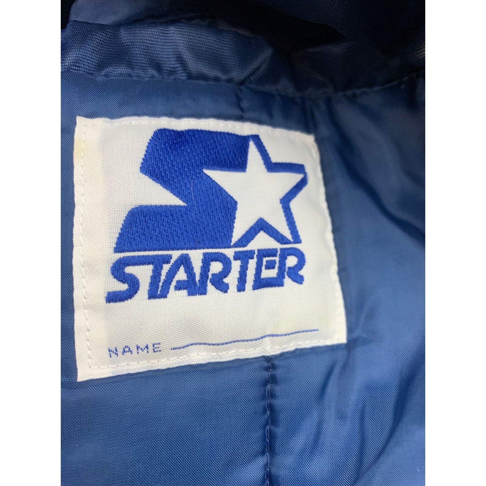 Authentic vintage Starter Cleveland Indians satin bomber, featuring classic navy shell with red and white striped rib-knit cuffs and collar, and prominently embroidered “Indians” script. Warm quilted lining and snap-front closure—ideal retro sportswear staple.
