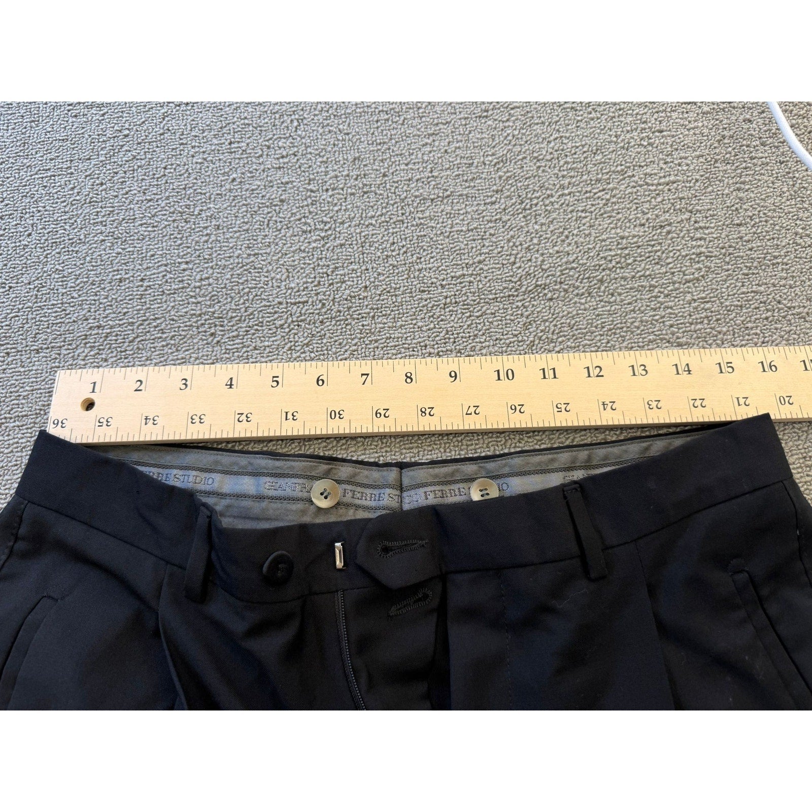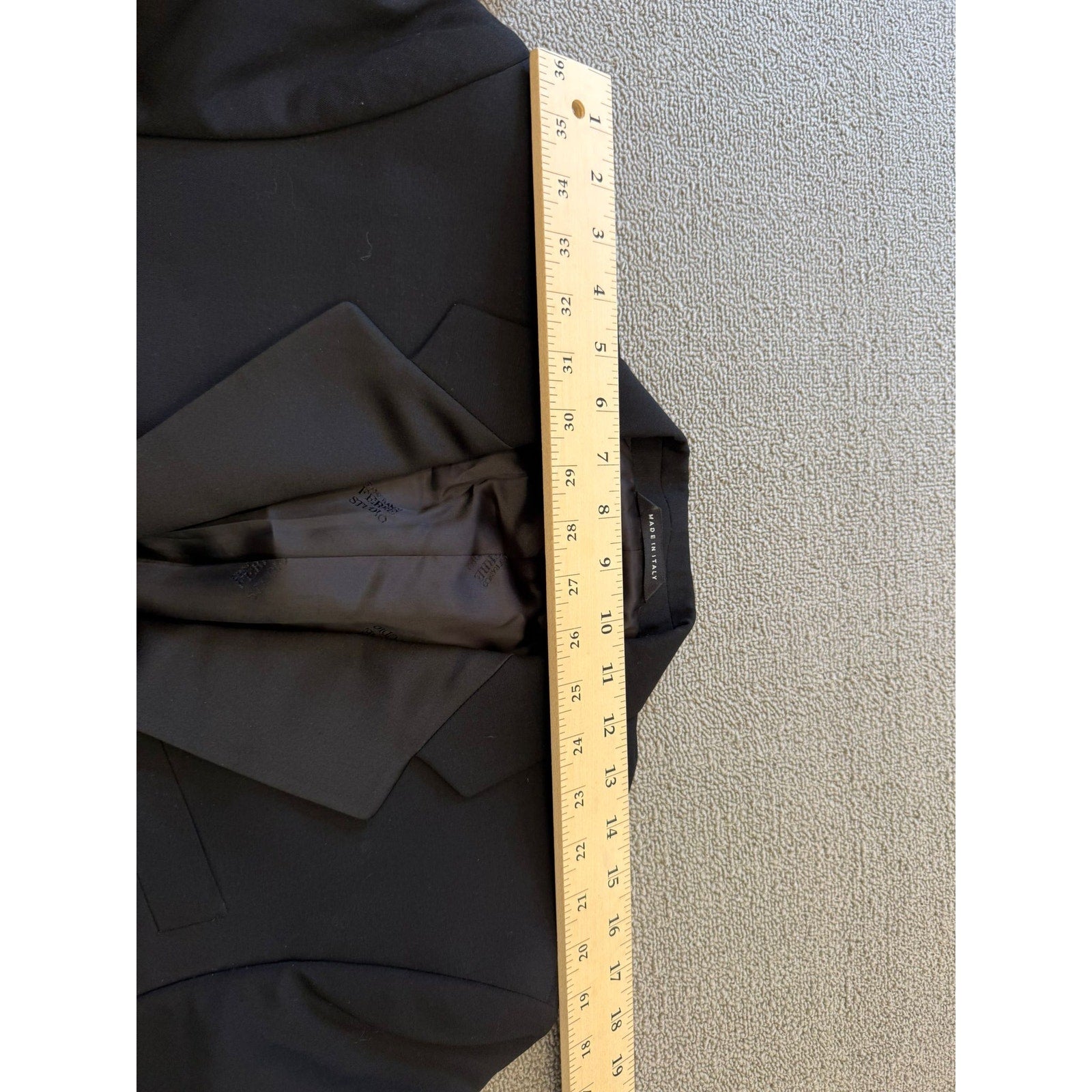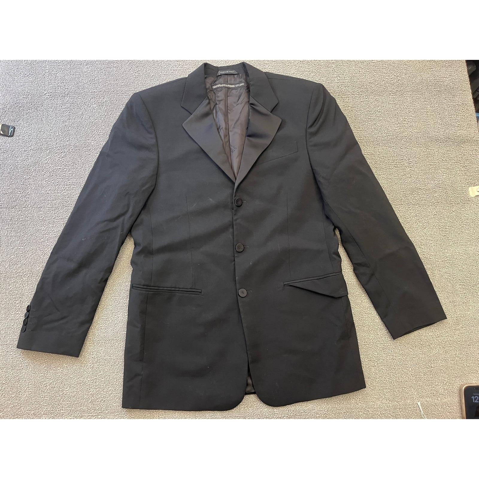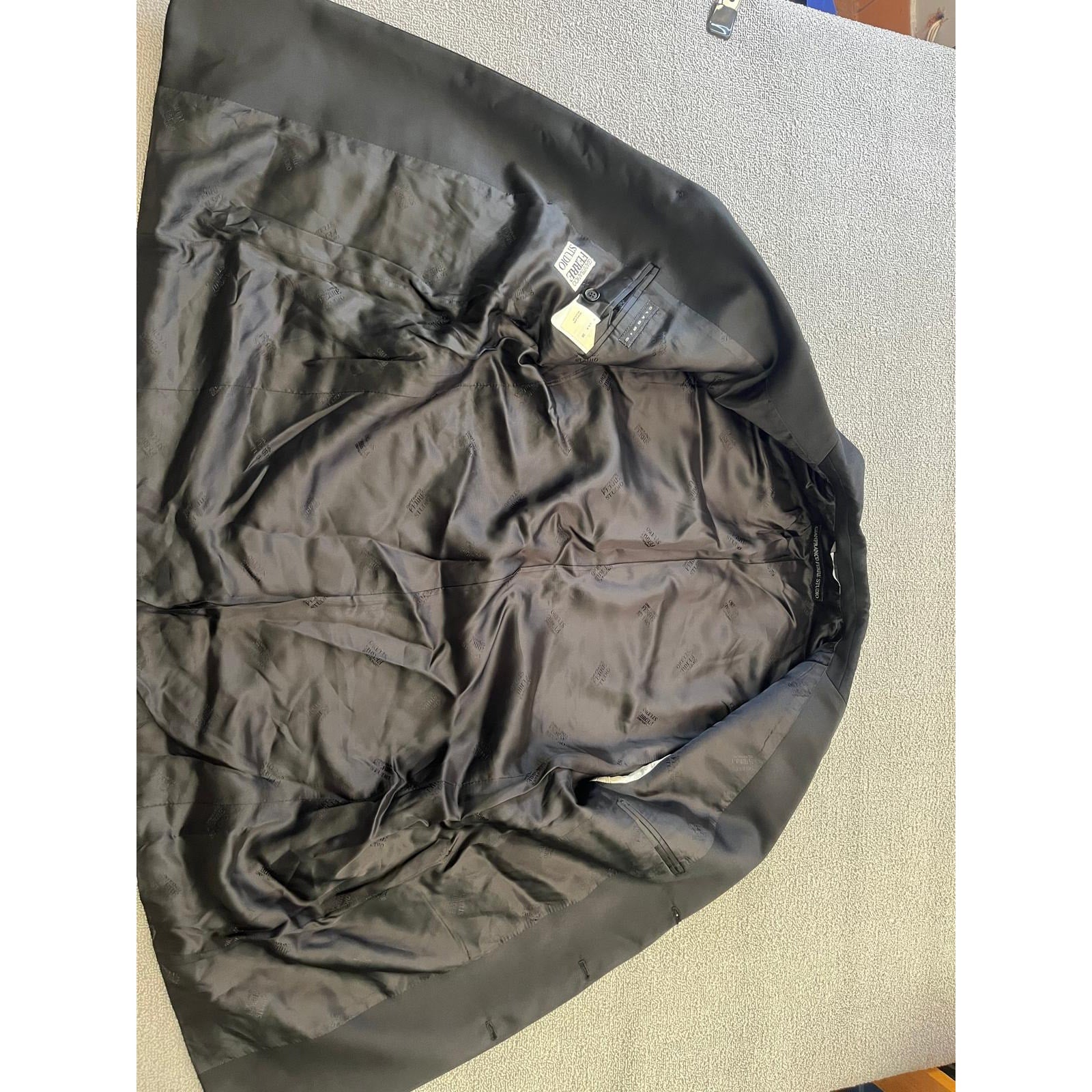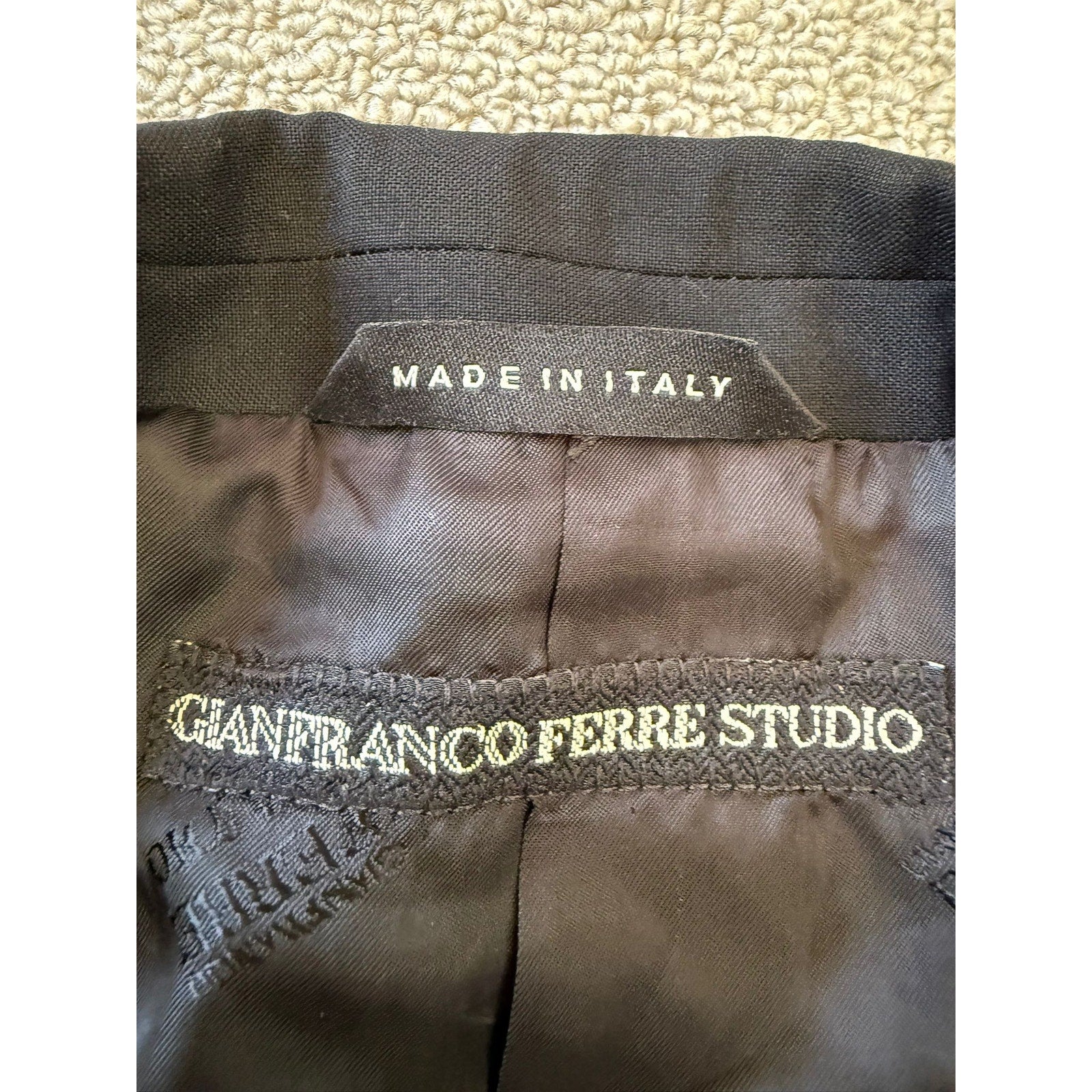 A classic pants blazer suit set by Gianfranco Ferré Studio, featuring a tailored black single-breasted blazer with satin lapels and matching straight-leg trousers—constructed in Italy for refined, clean-lined sophistication.