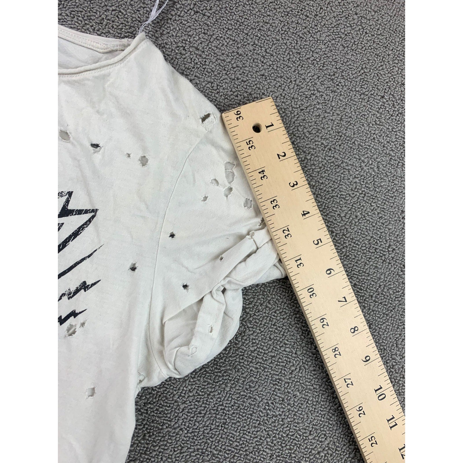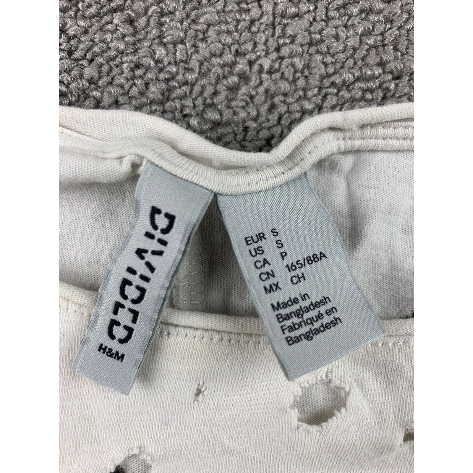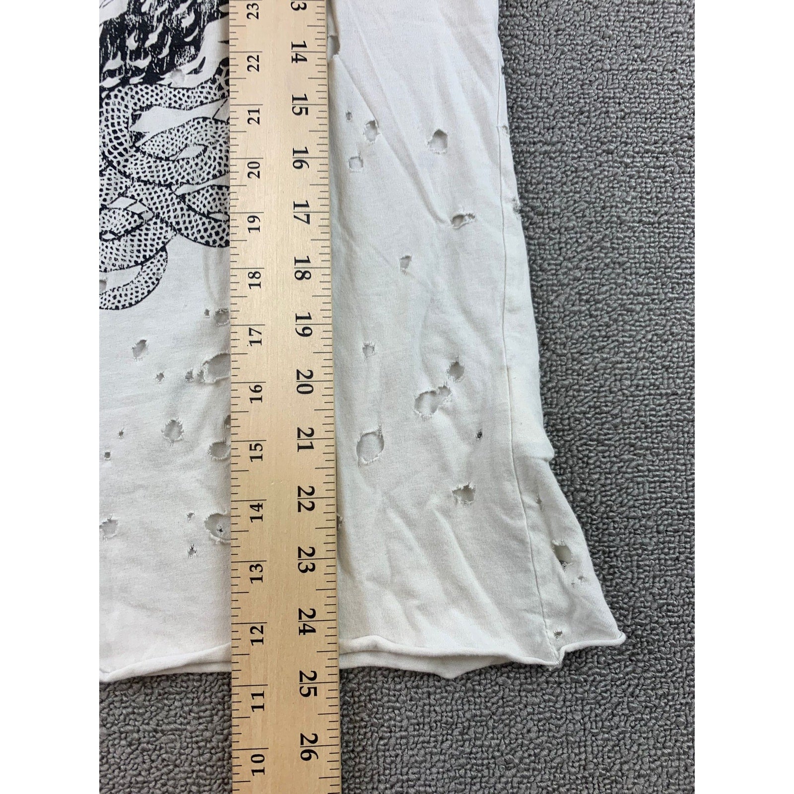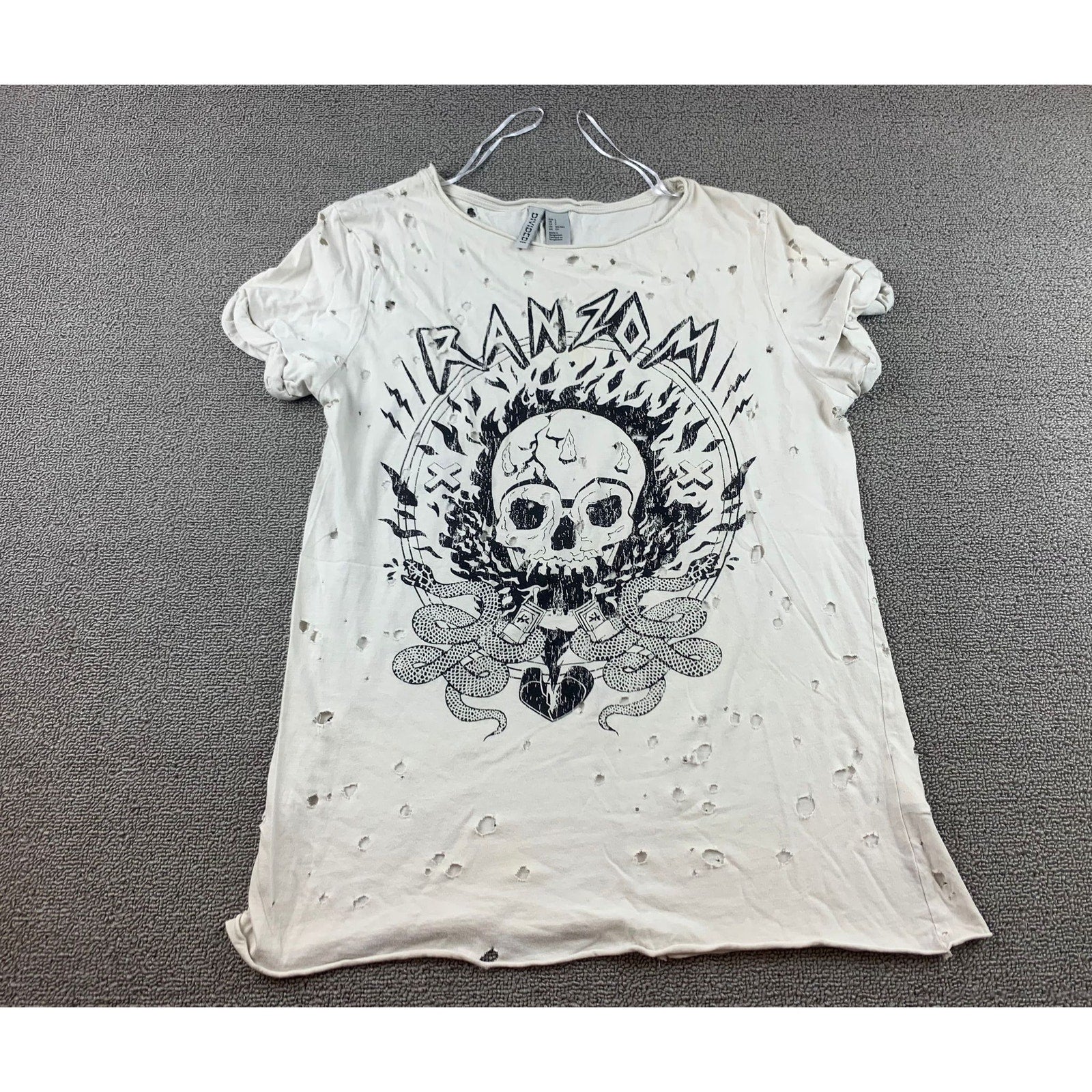 H&M Divided women’s short sleeve graphic t-shirt featuring a bold skull and snake print with “Ransom” lettering. Designed with intentional distressing and holes for a vintage, edgy look. White/cream base with black graphic print.