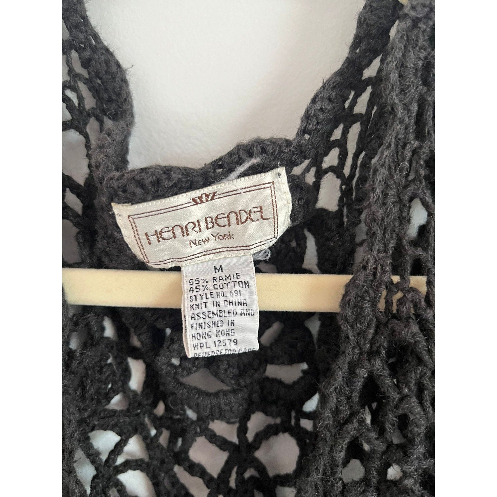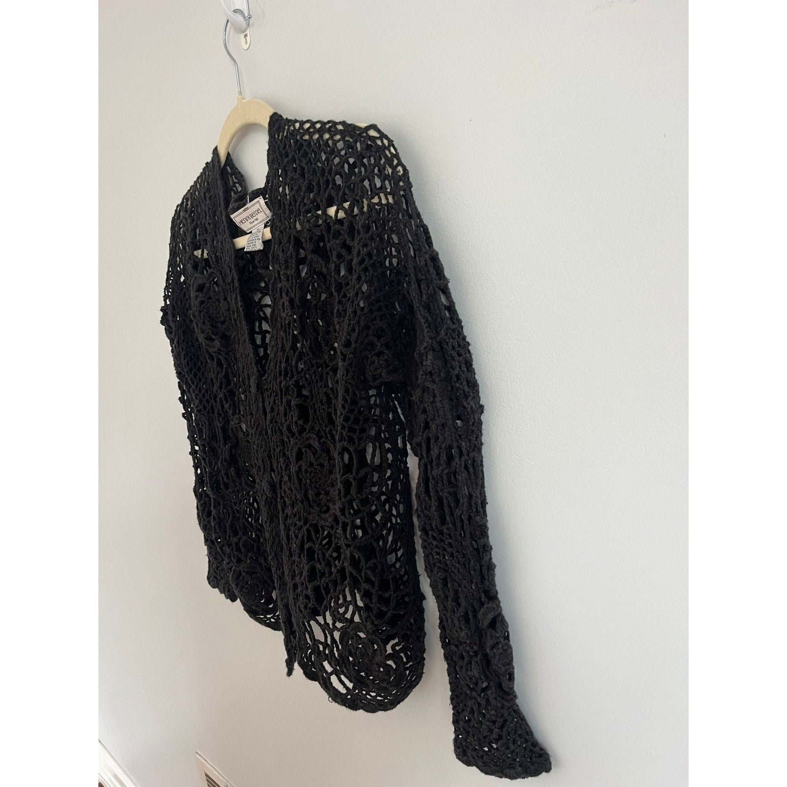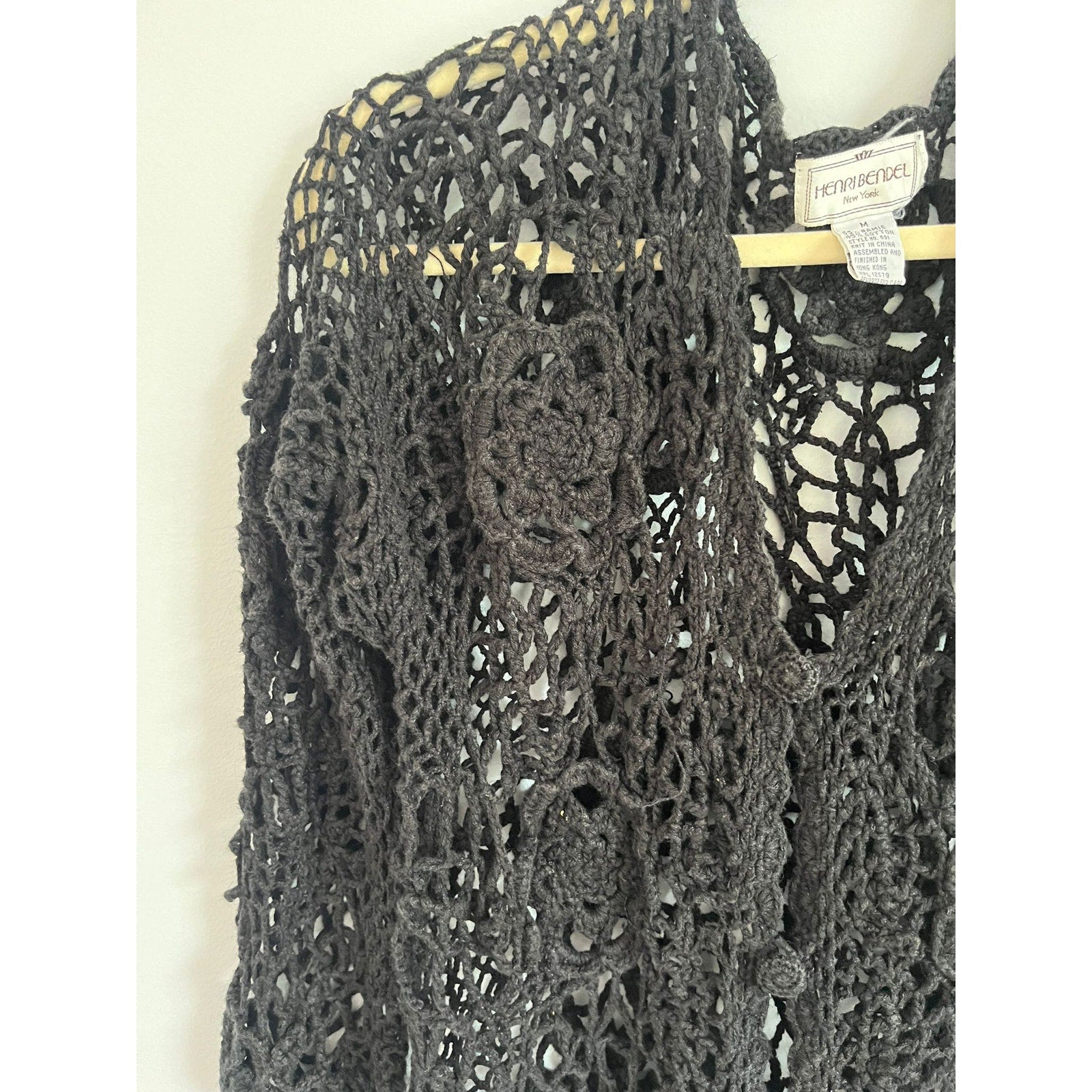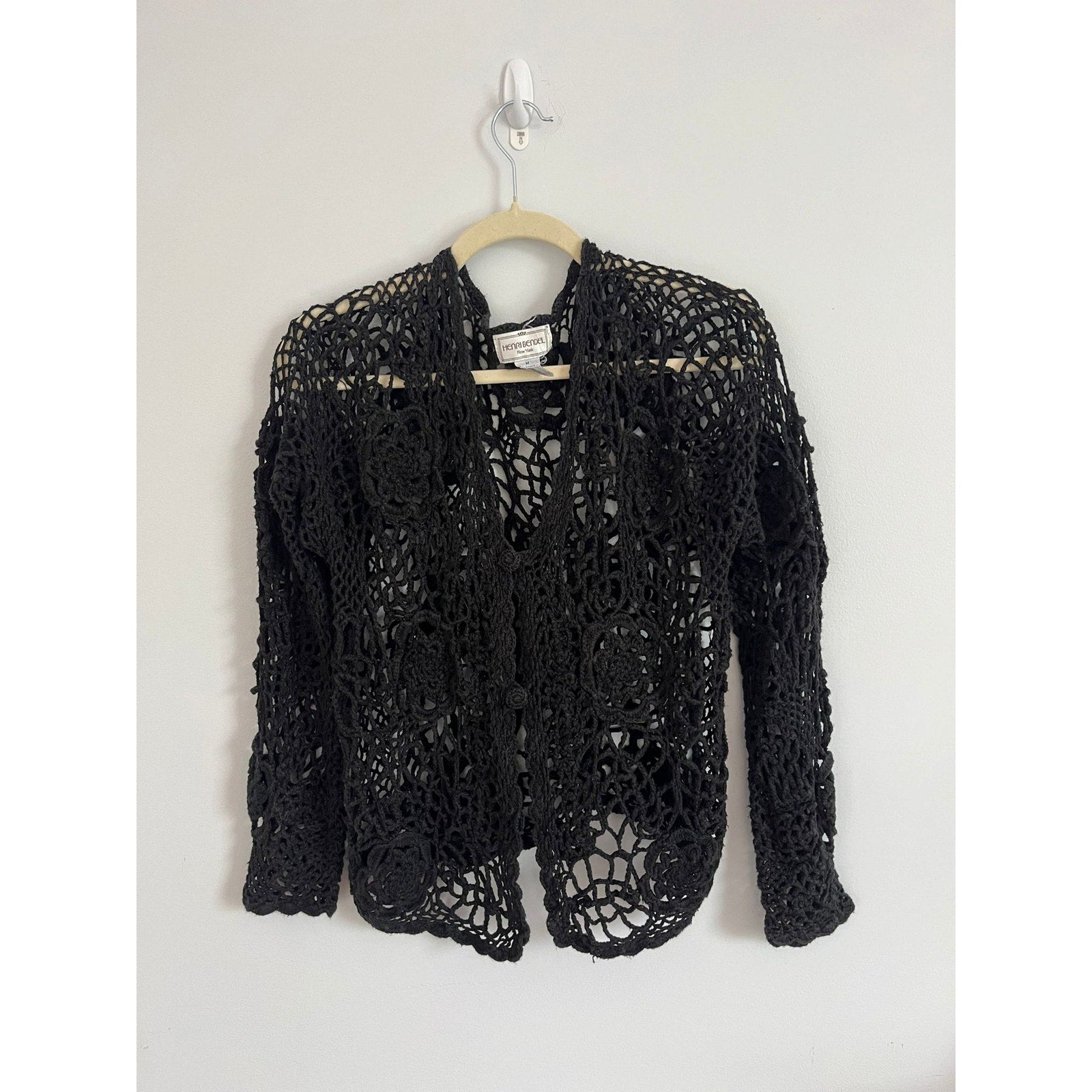 Henri Bendel Cardigan Women Size M Black Open Crochet Knit Button Front Vintage