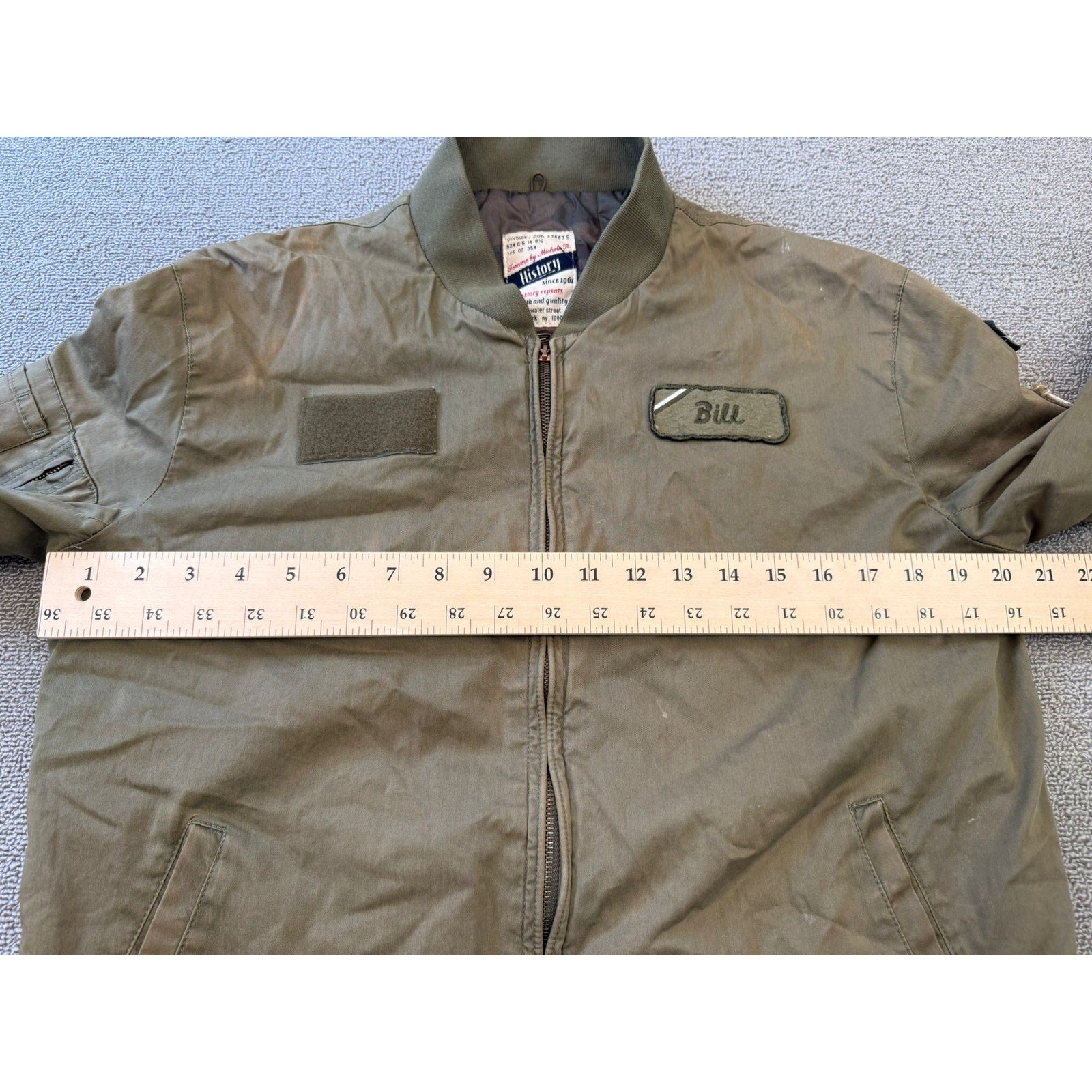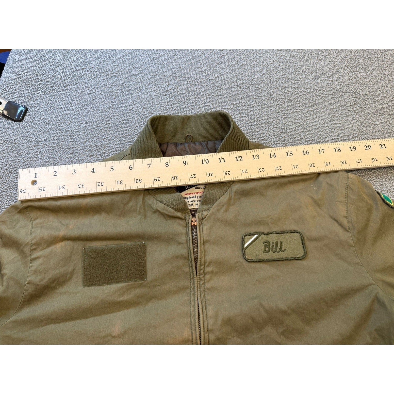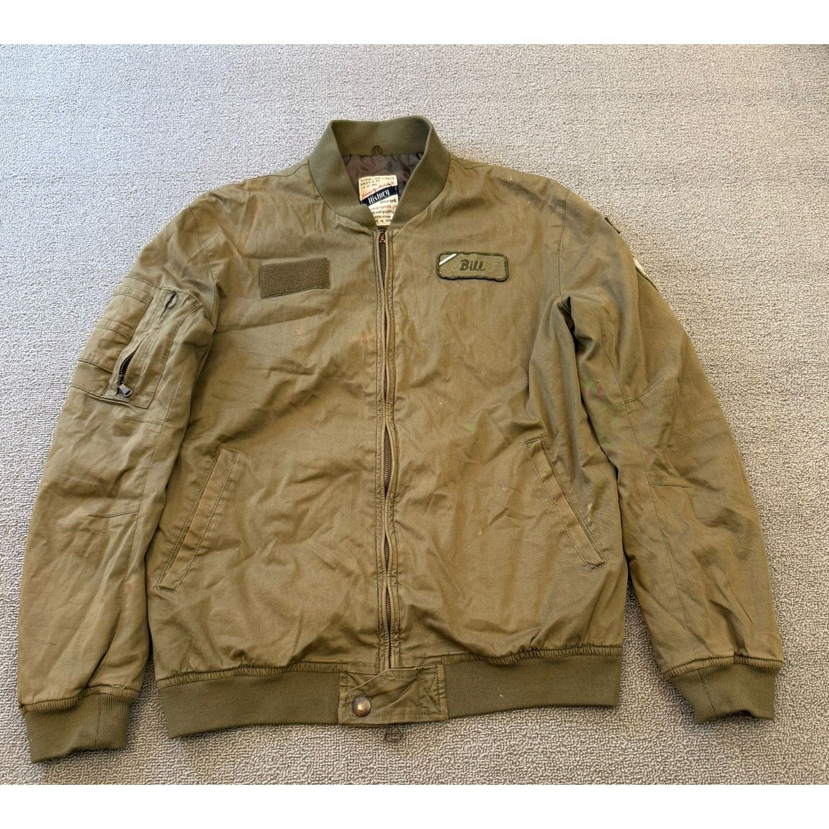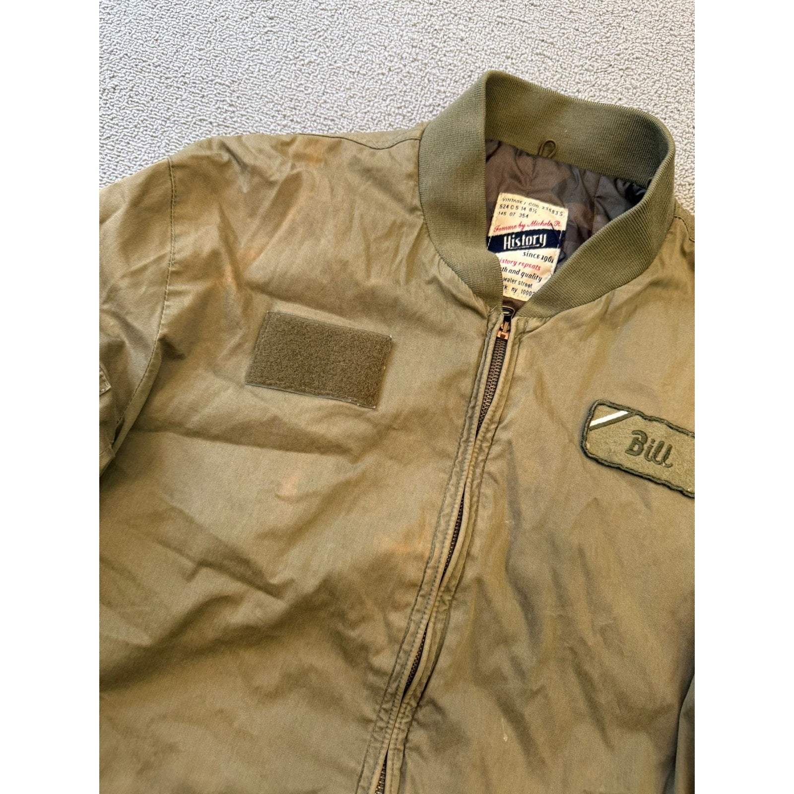 A vintage olive green bomber jacket by History Repeats, designed by Femme by Michele Rossi—crafted in Italy with classic military flair including name‑patch detailing ("Bill"), zip‑arm pocket, elastic cuffs and hem, and a ribbed collar.