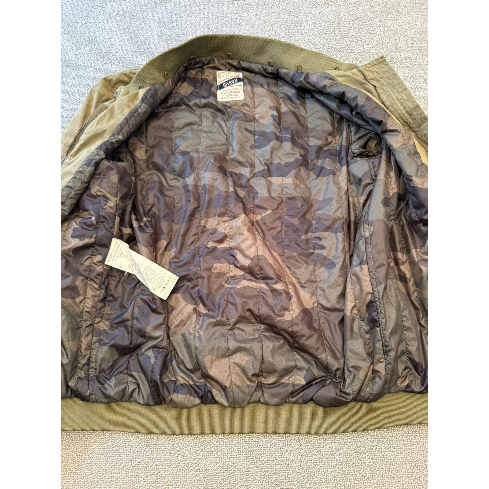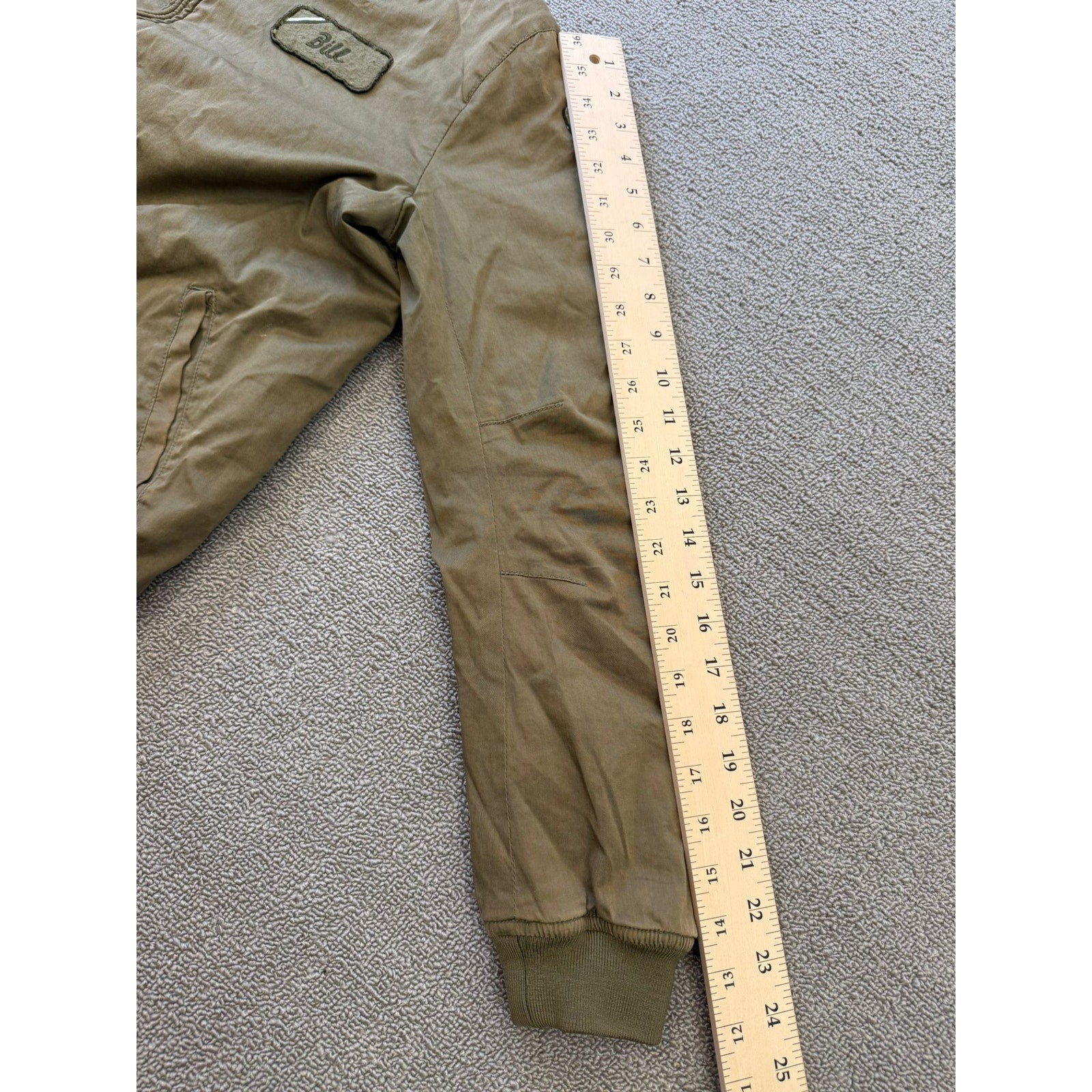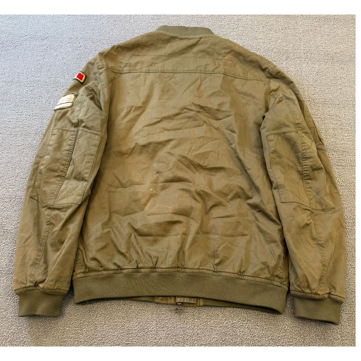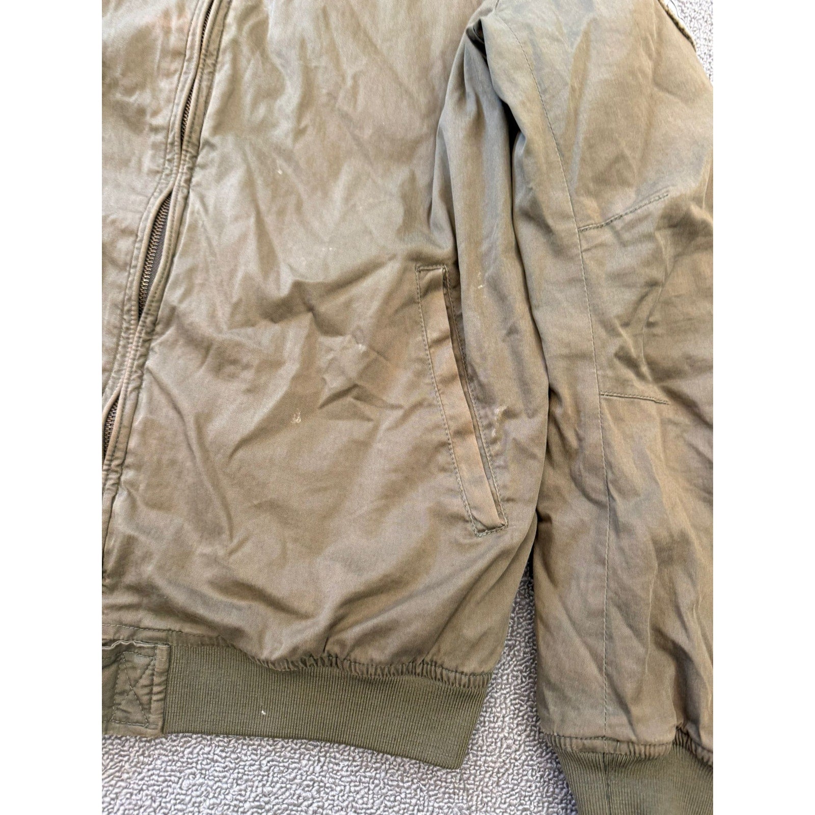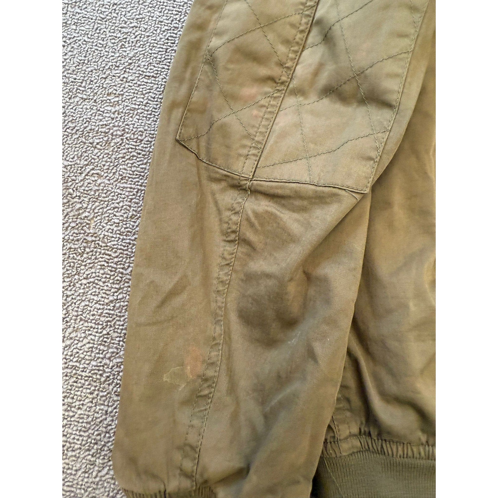 A vintage olive green bomber jacket by History Repeats, designed by Femme by Michele Rossi—crafted in Italy with classic military flair including name‑patch detailing ("Bill"), zip‑arm pocket, elastic cuffs and hem, and a ribbed collar.