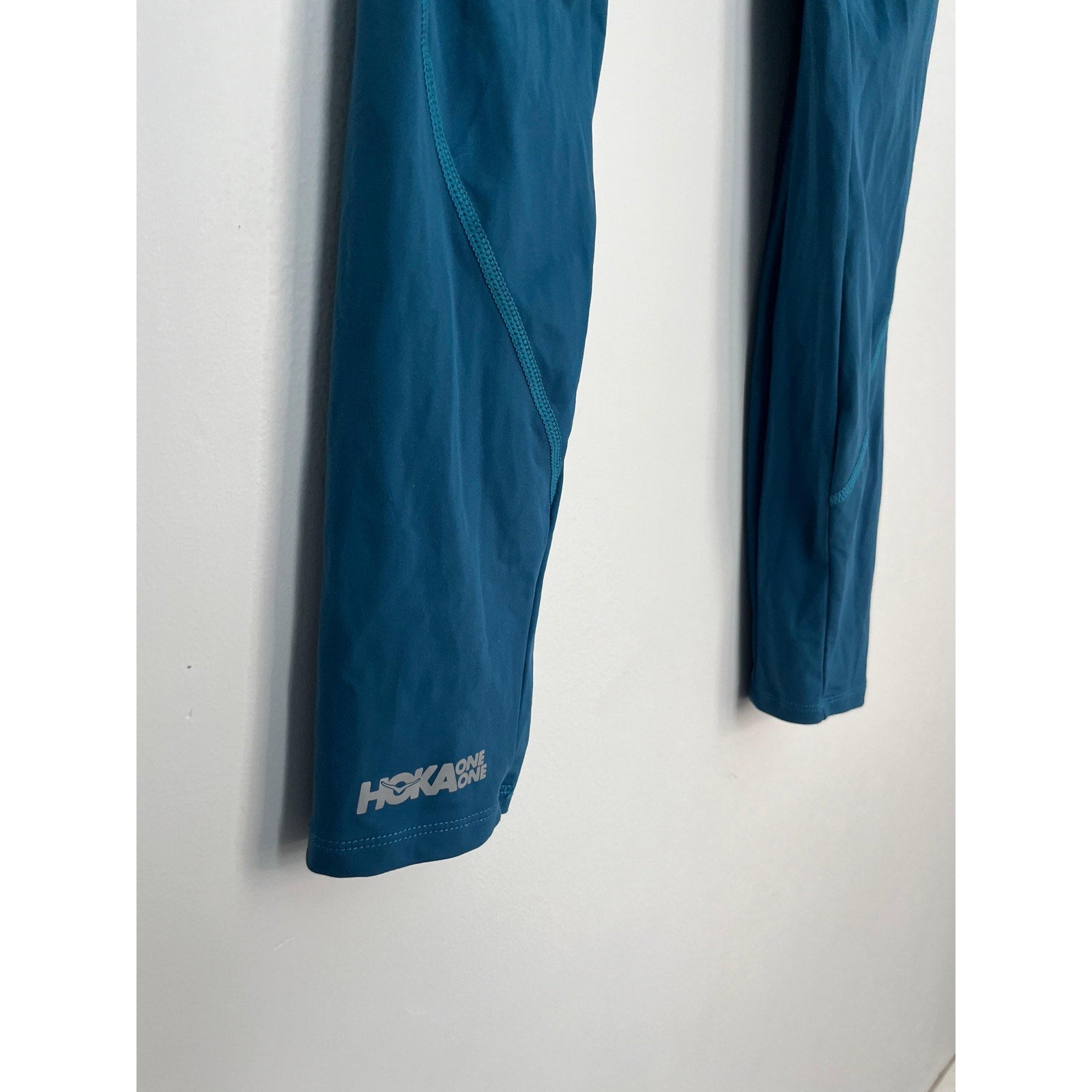 Stretchy blue high-waisted leggings from Hoka One One with seamed details and dual side pockets. Ideal for running, training, or athleisure with a supportive, compressive fit.