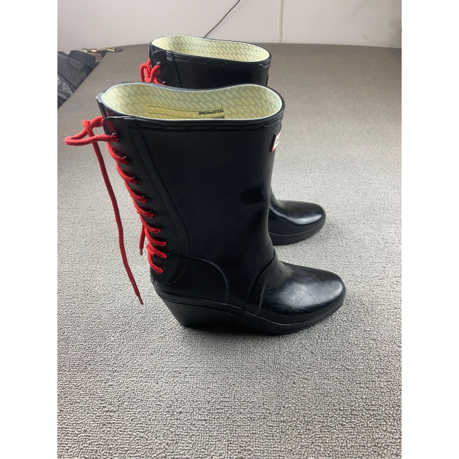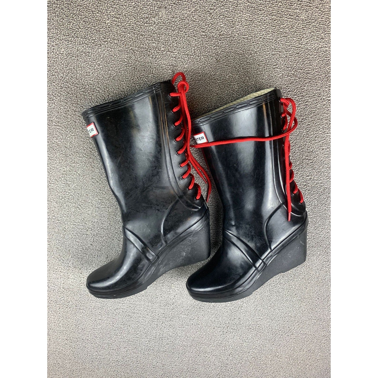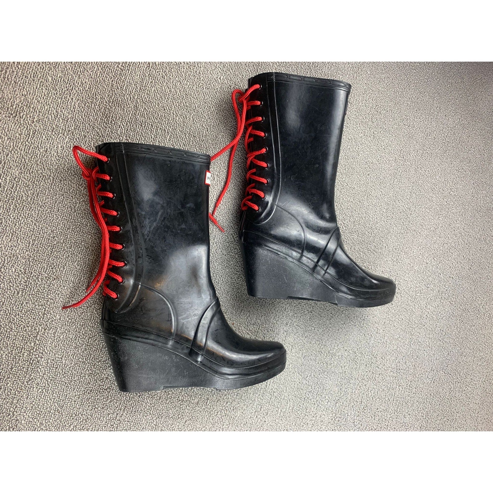 Hunter Women's 7 Black Verbier Wedge Boots Red Lace Up Rubber Rain