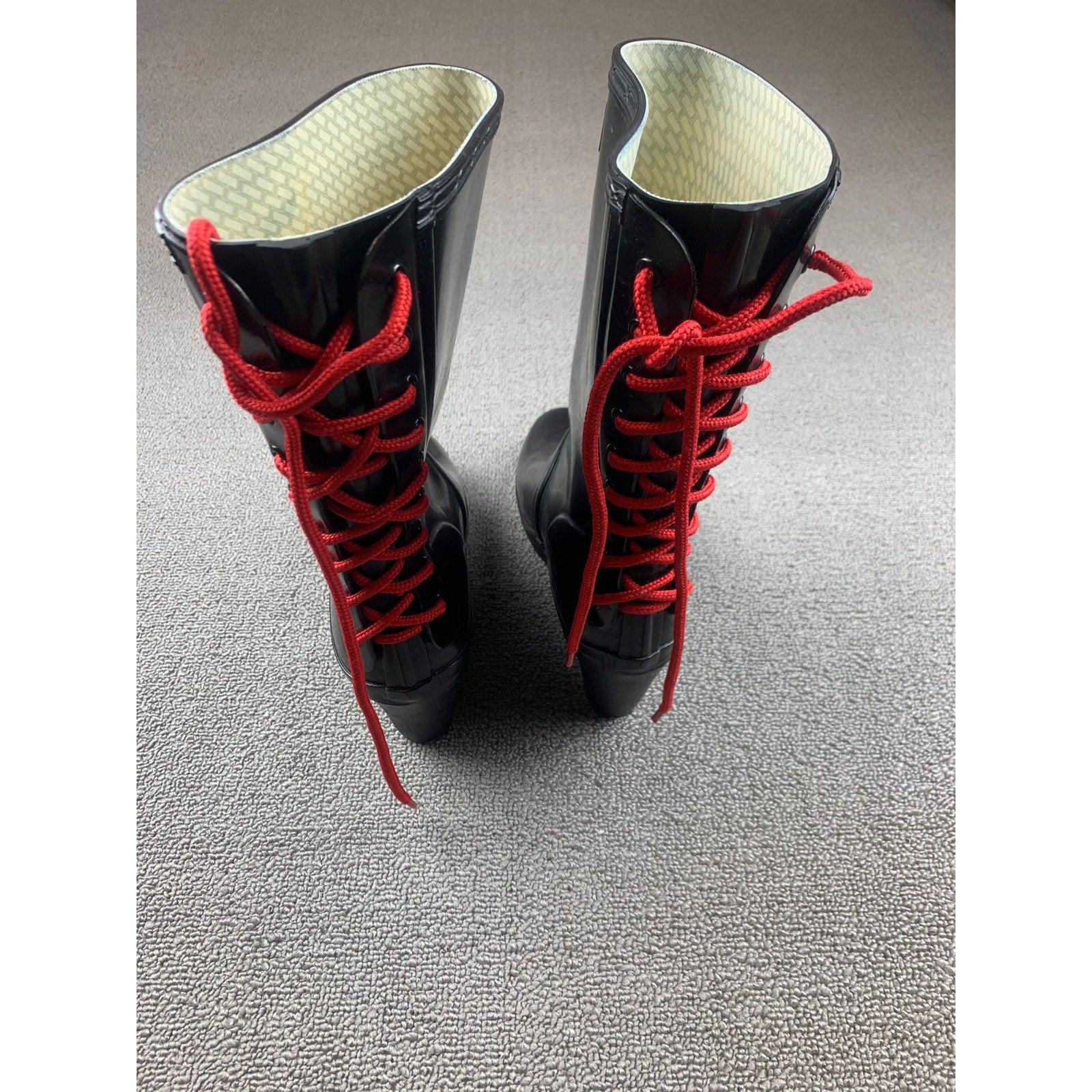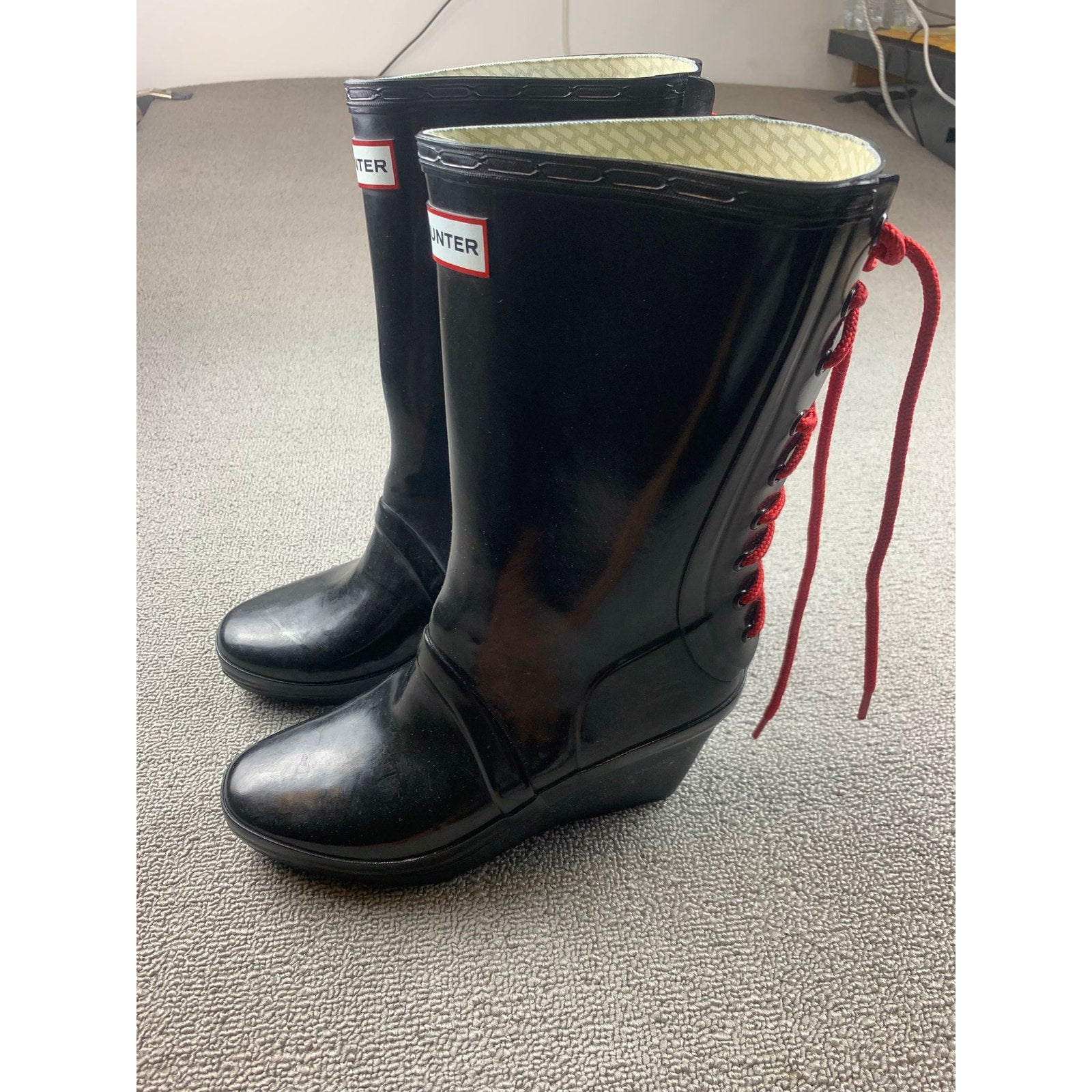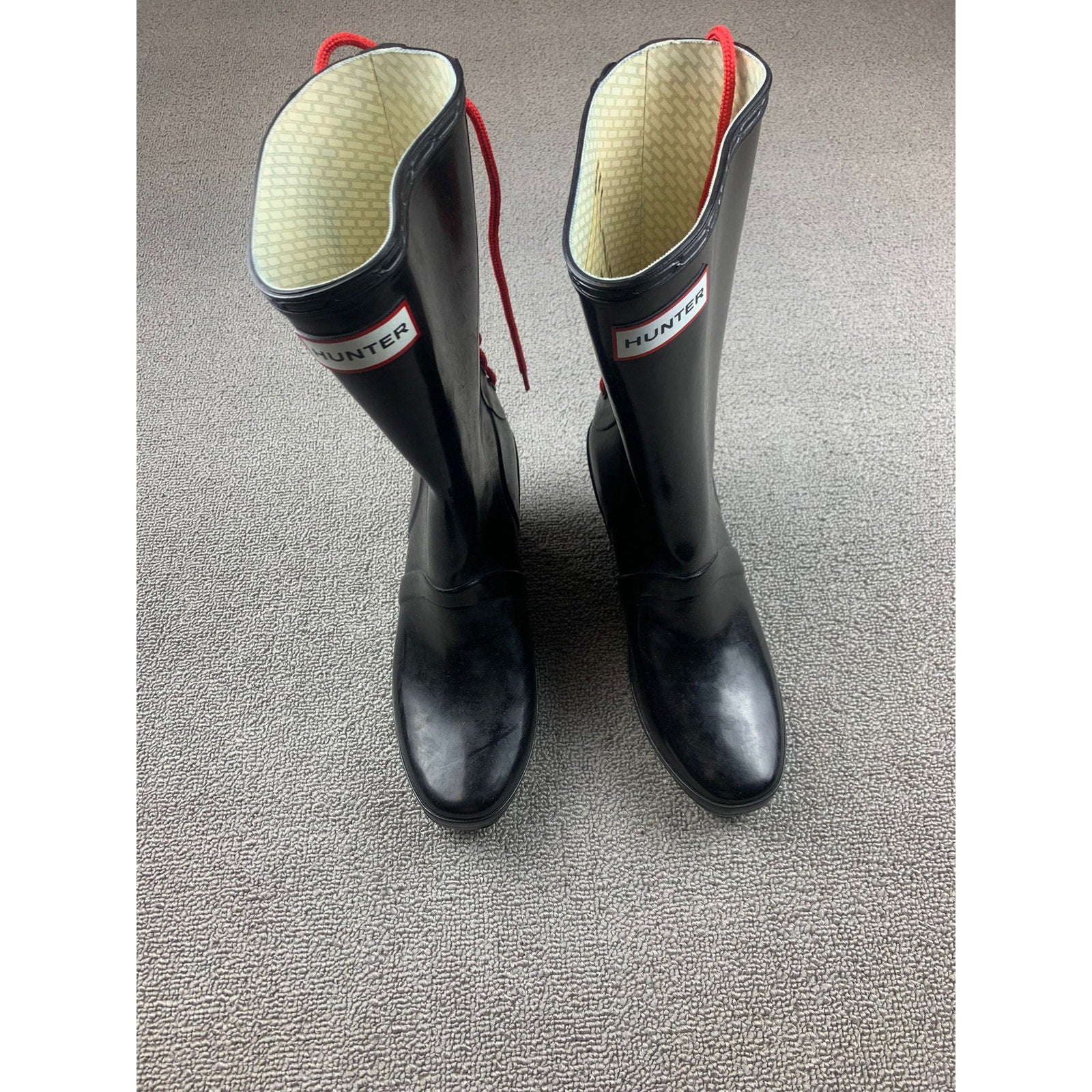 Hunter Women's 7 Black Verbier Wedge Boots Red Lace Up Rubber Rain