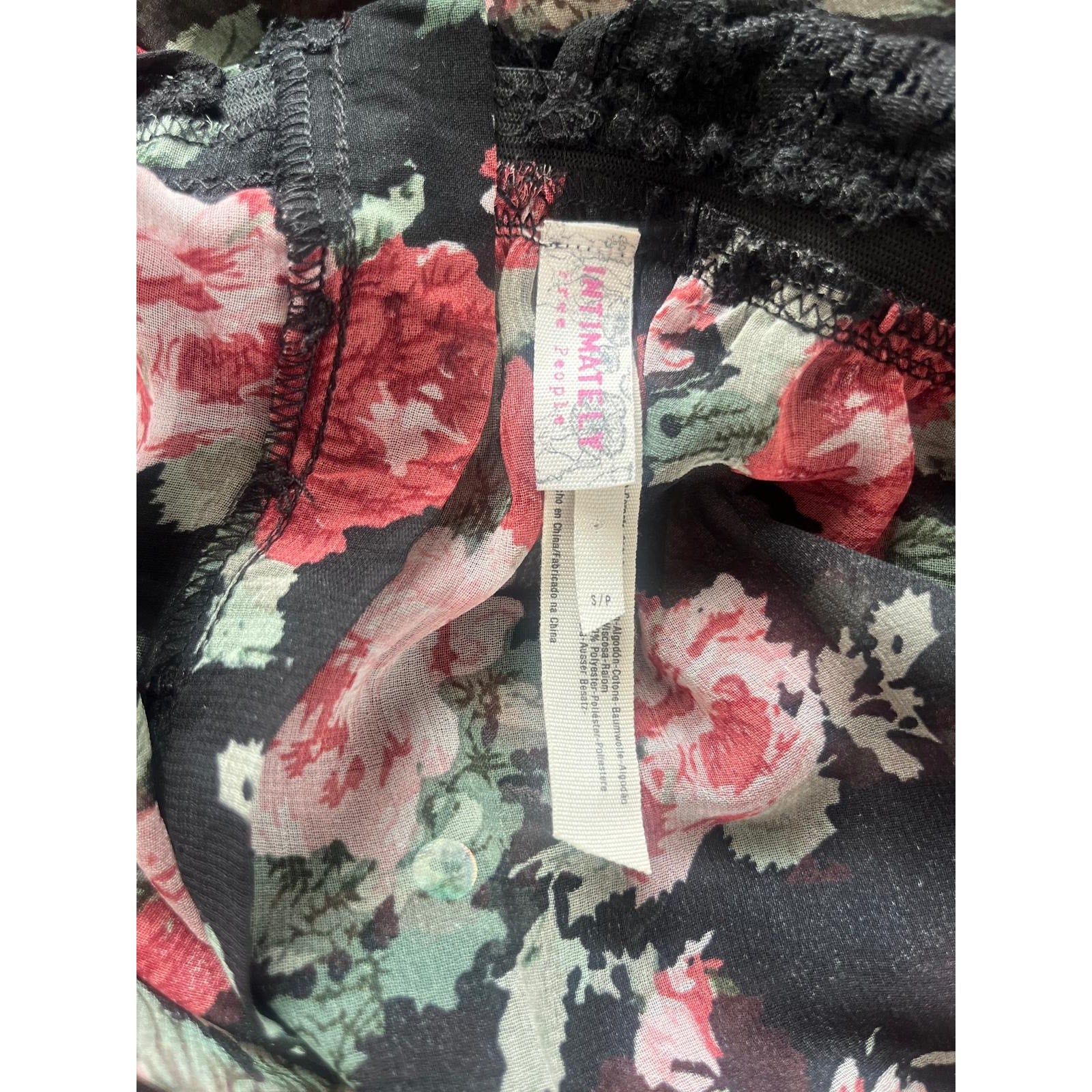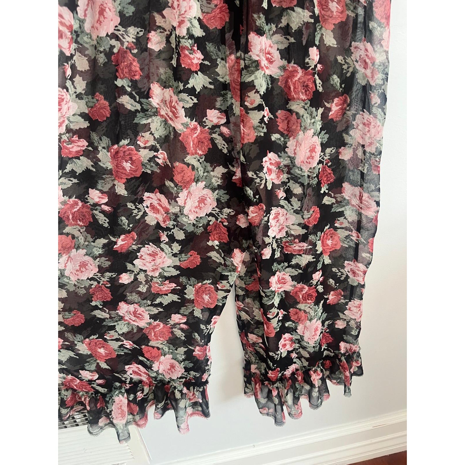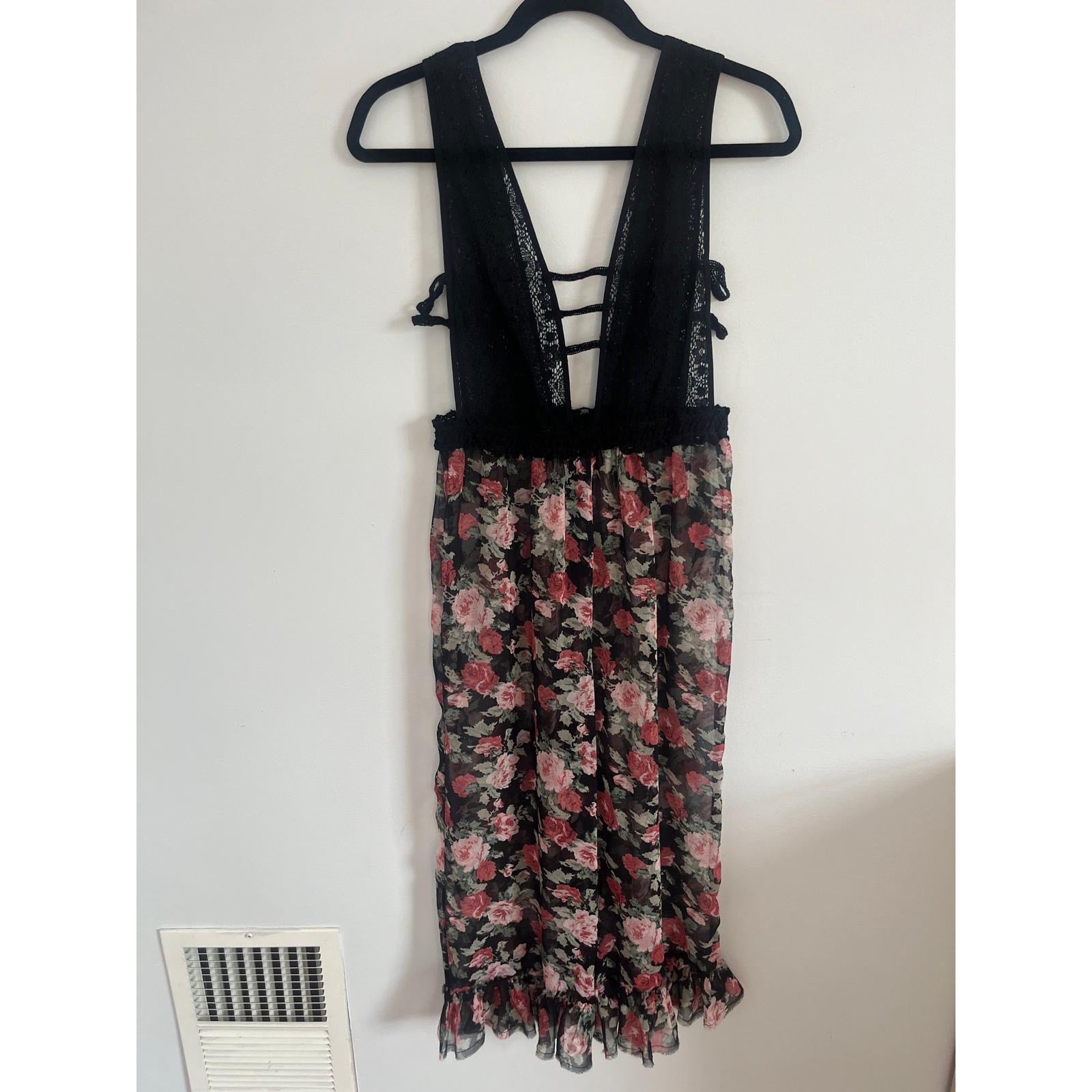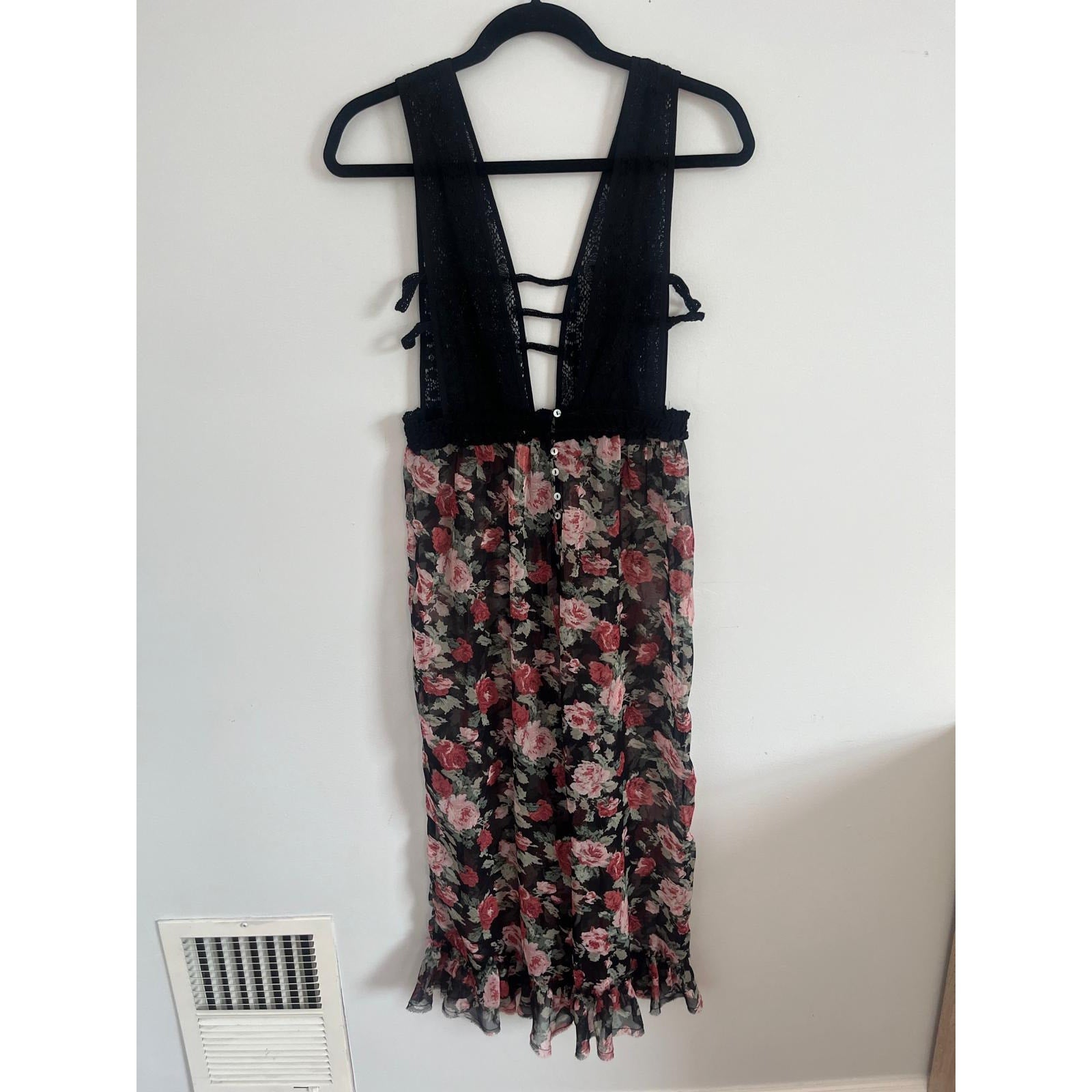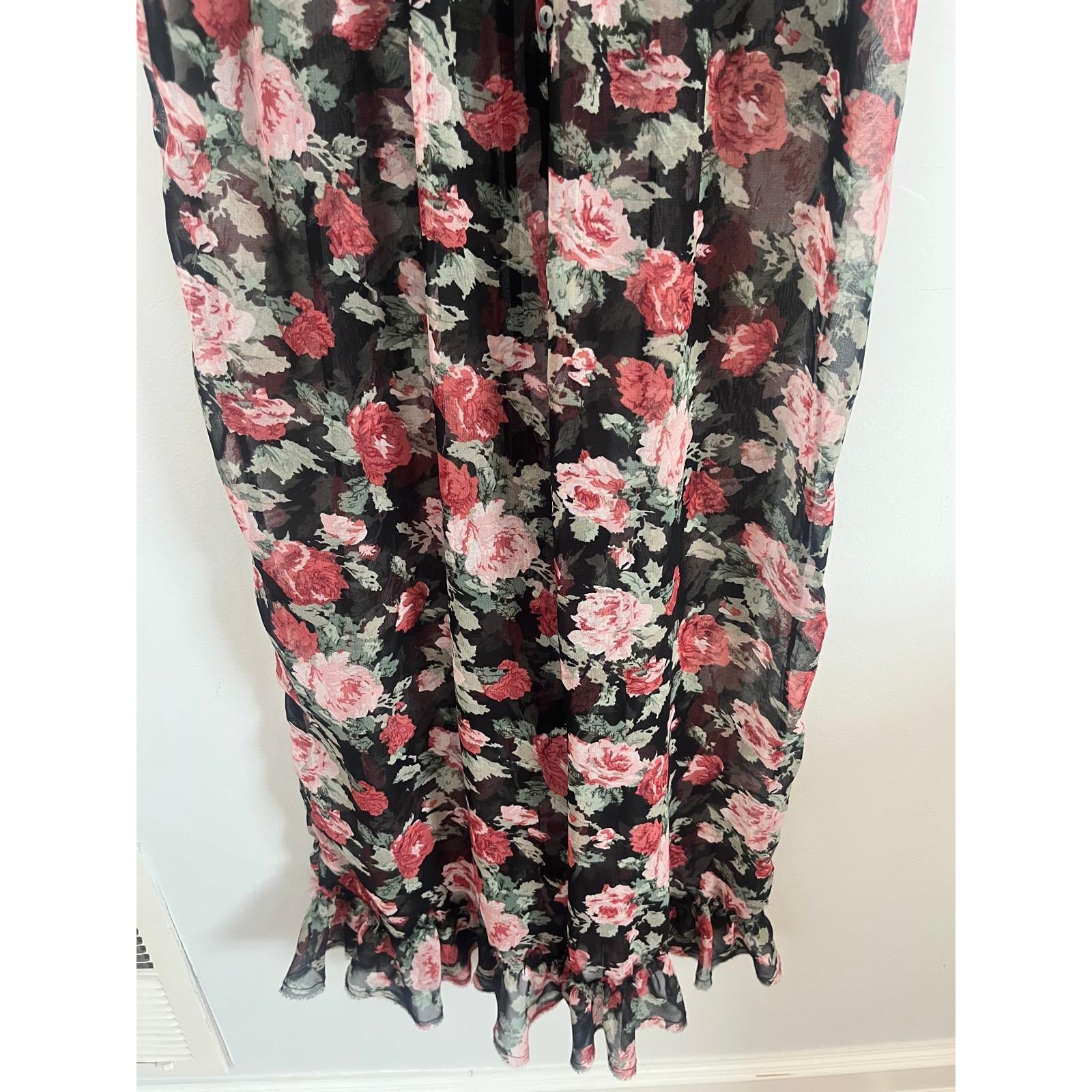 Sheer mesh floral midi slip dress with deep V lace bodice, button front detail, and strappy open back. Lightweight and romantic with ruffled hem.