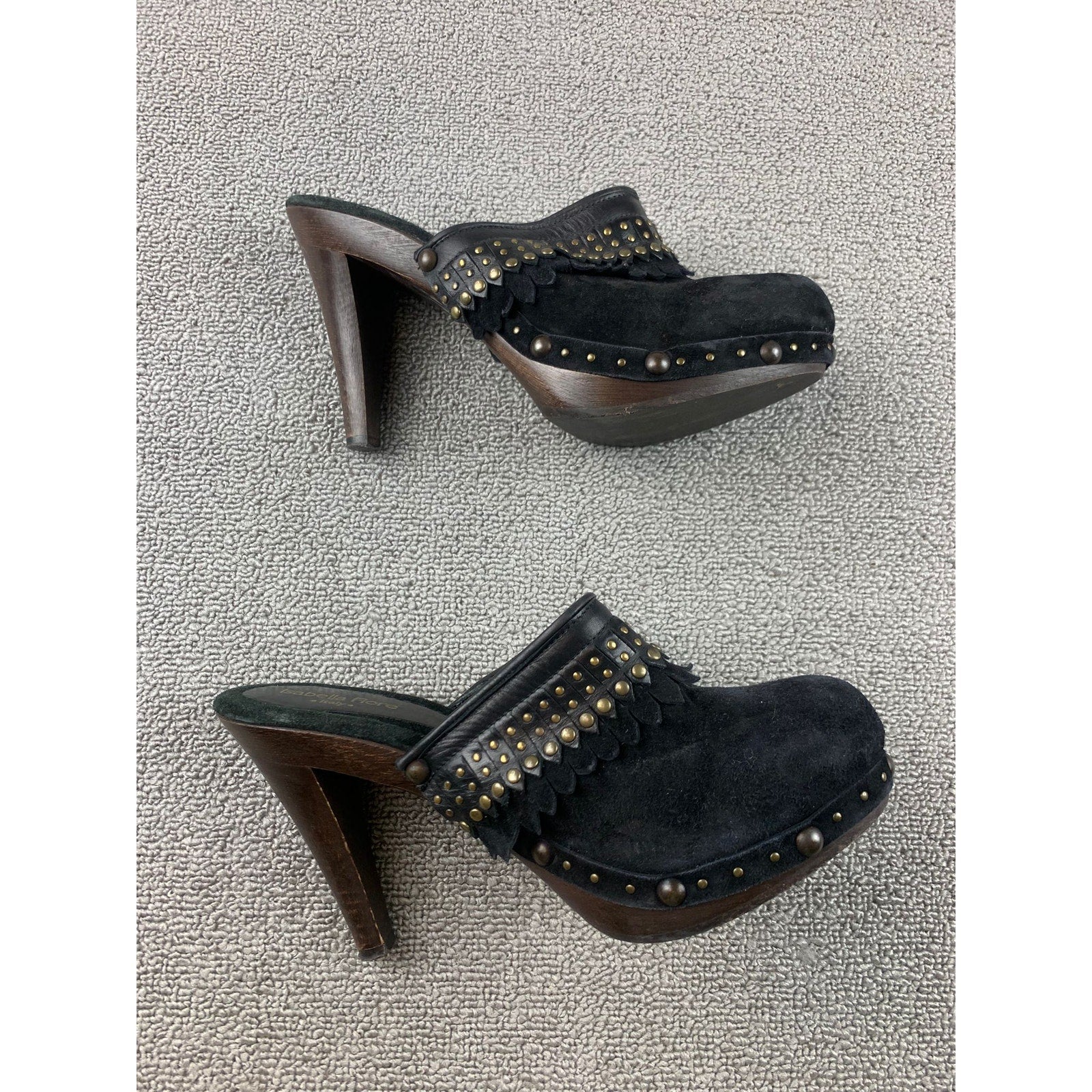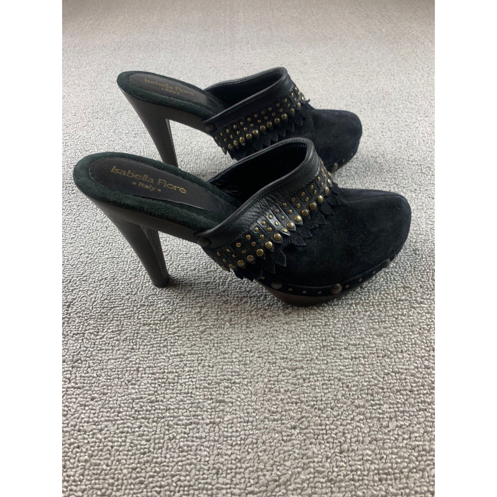 Isabella Fiore Italian-made suede clogs with leather trim and wood platform heel. Features brass-tone stud detailing, scalloped leather accents, and a chunky high heel for a bold statement look.