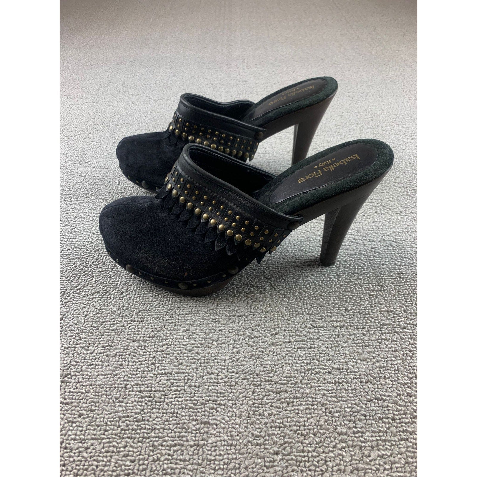 Isabella Fiore Suede Clogs Heel Shoes Womens 8 Made in Italy Fringe Studded