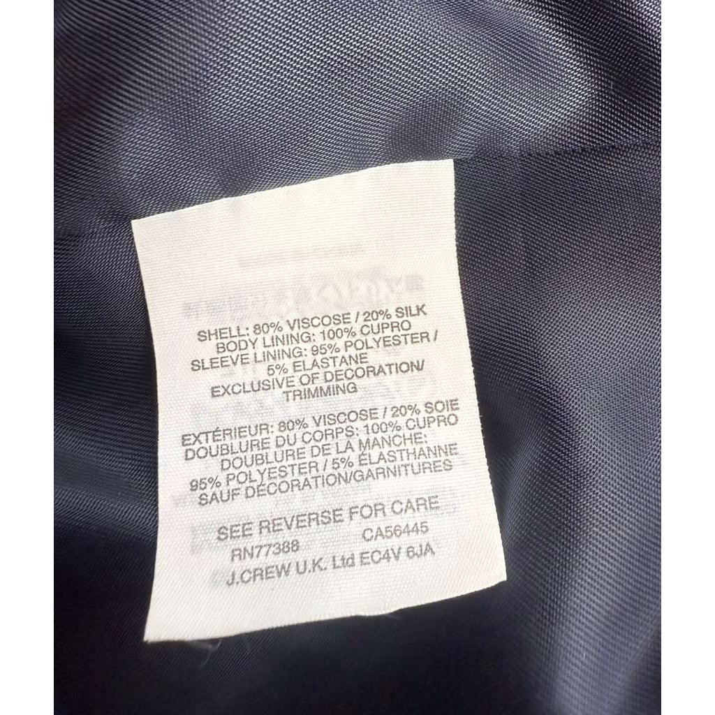J Crew Collection blazer in navy Women 2. Made of an 80% viscose 20% silk blend with full lining. Double breasted design with piped trim and notched lapels—great for evening events and dressy office looks.