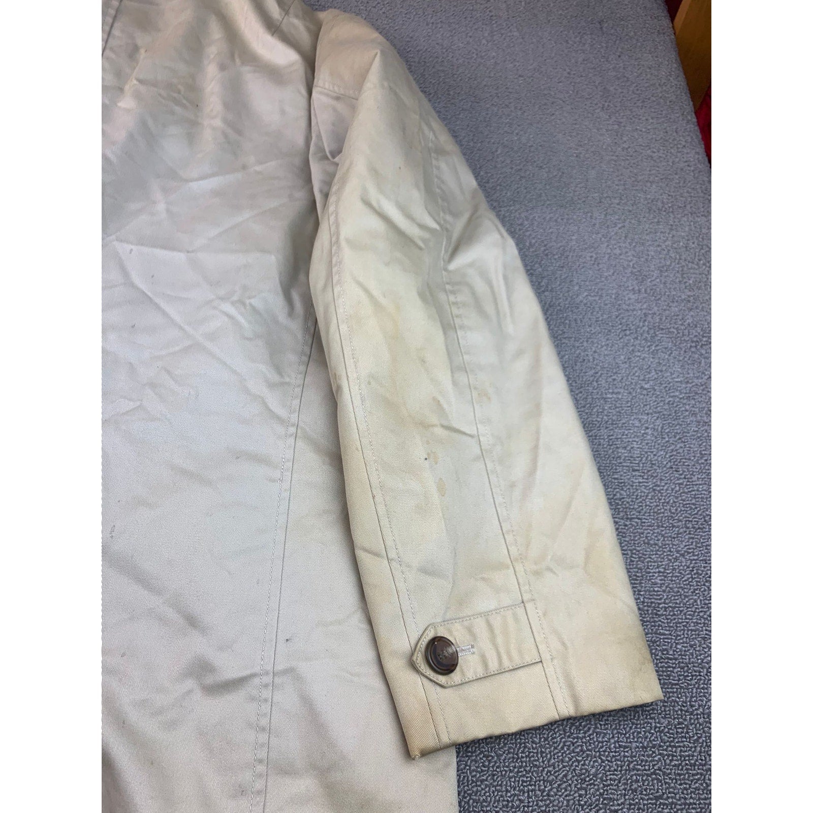 Lightweight J.Crew trench-style car coat in beige cotton, featuring a clean notch collar and hidden button placket; unlined with a streamlined silhouette ideal for transitional layering.
