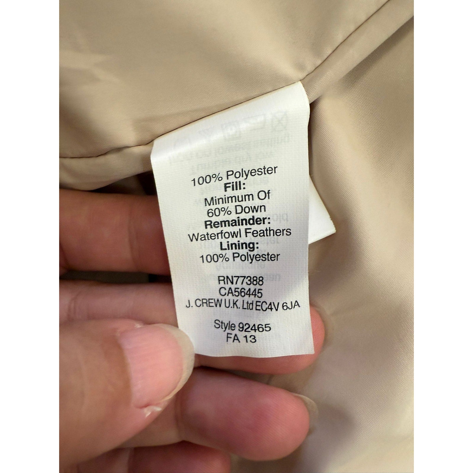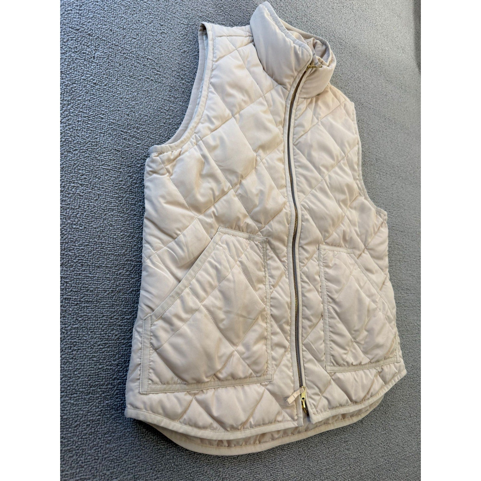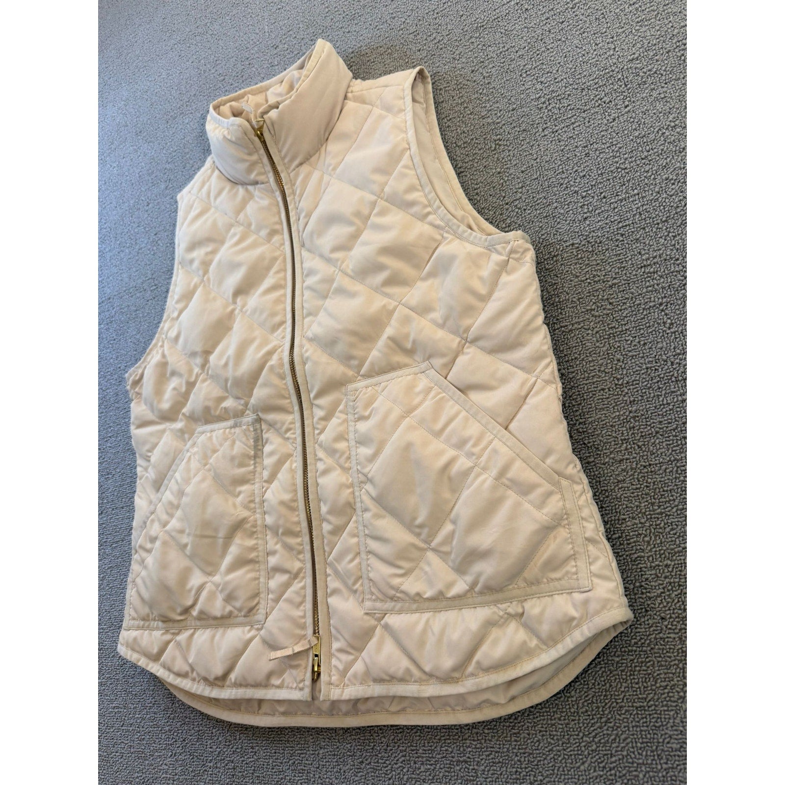 Beige quilted vest by J.Crew in a classic sleeveless silhouette, featuring patch pockets, front zip closure, and a high collar—versatile for seasonal layering with a timeless neutral aesthetic.