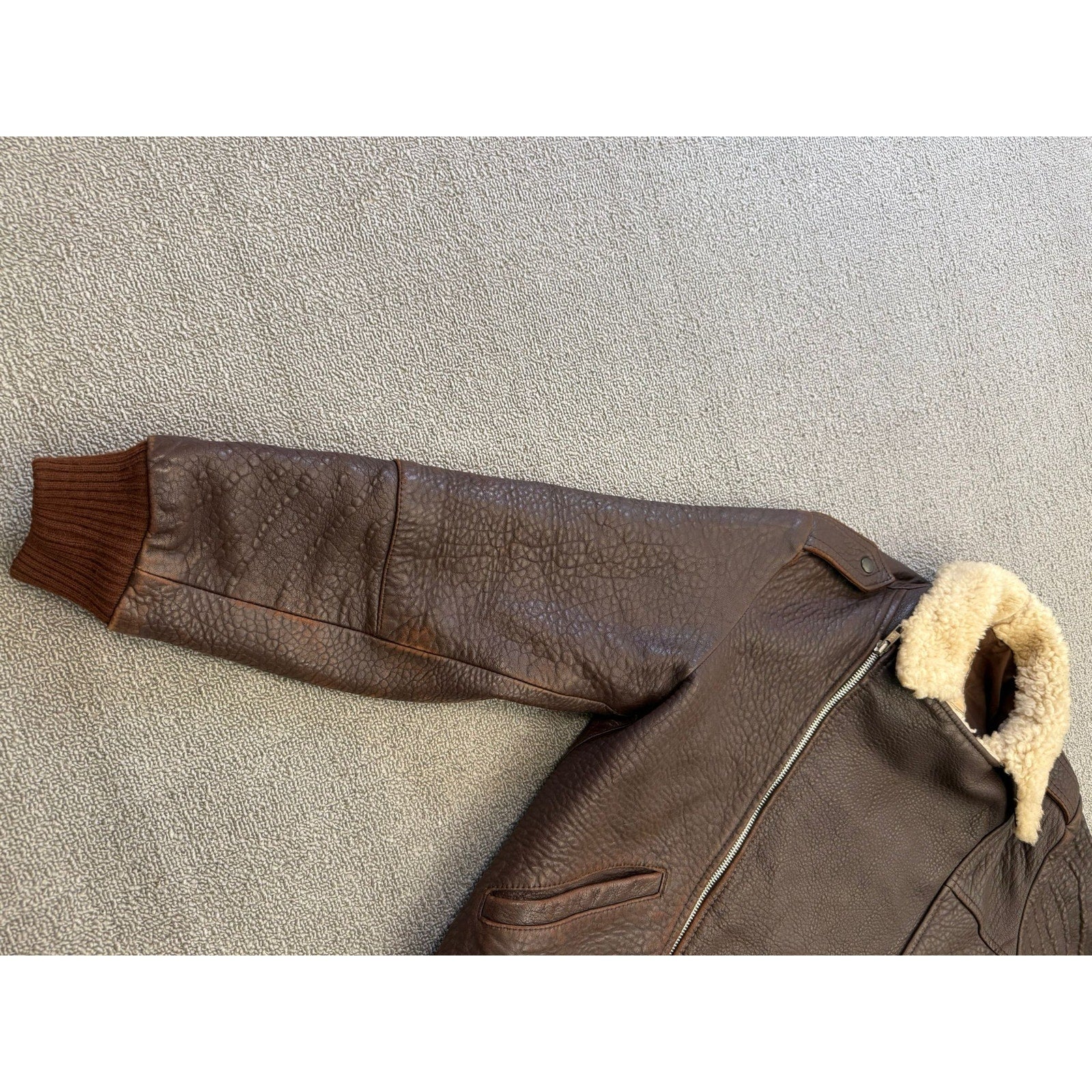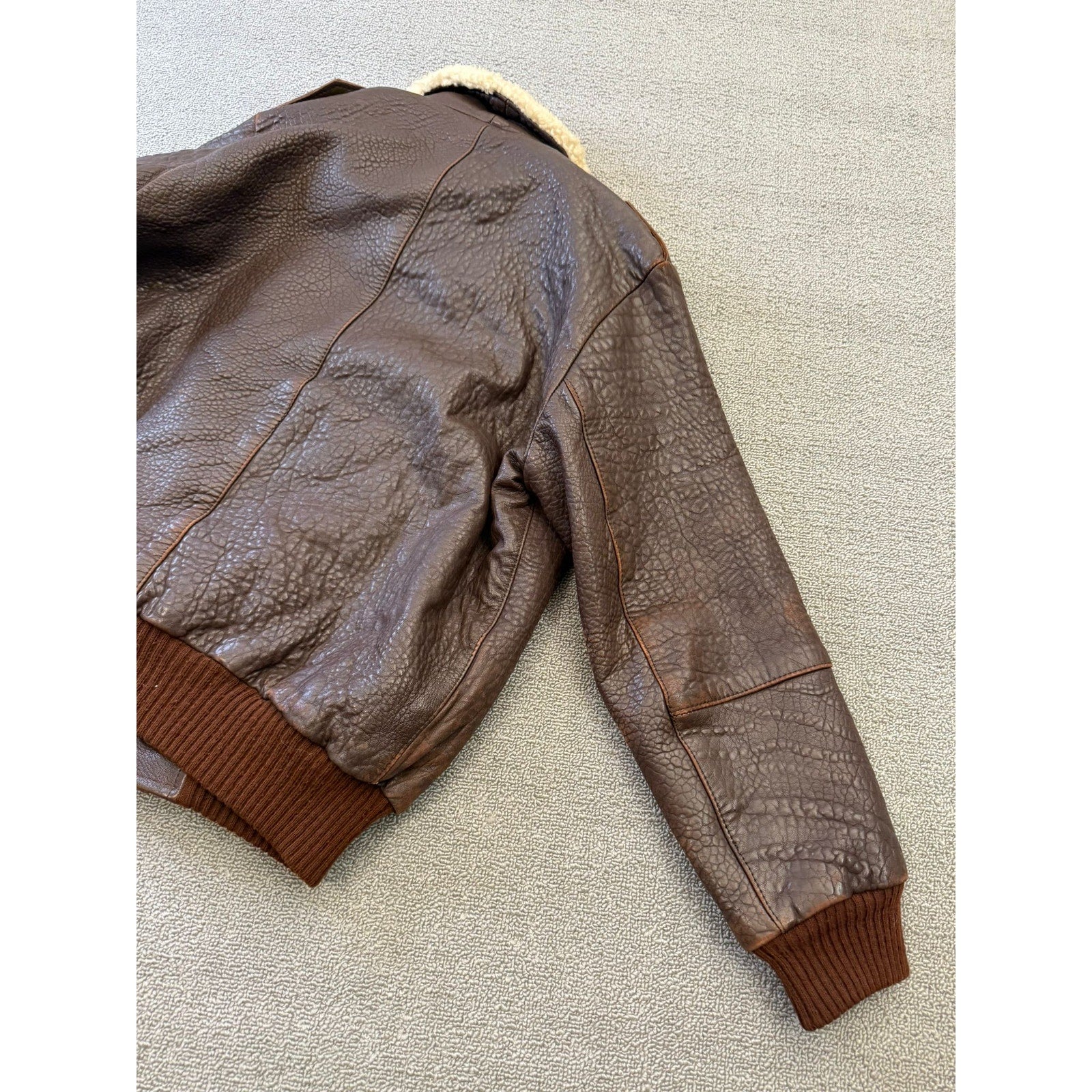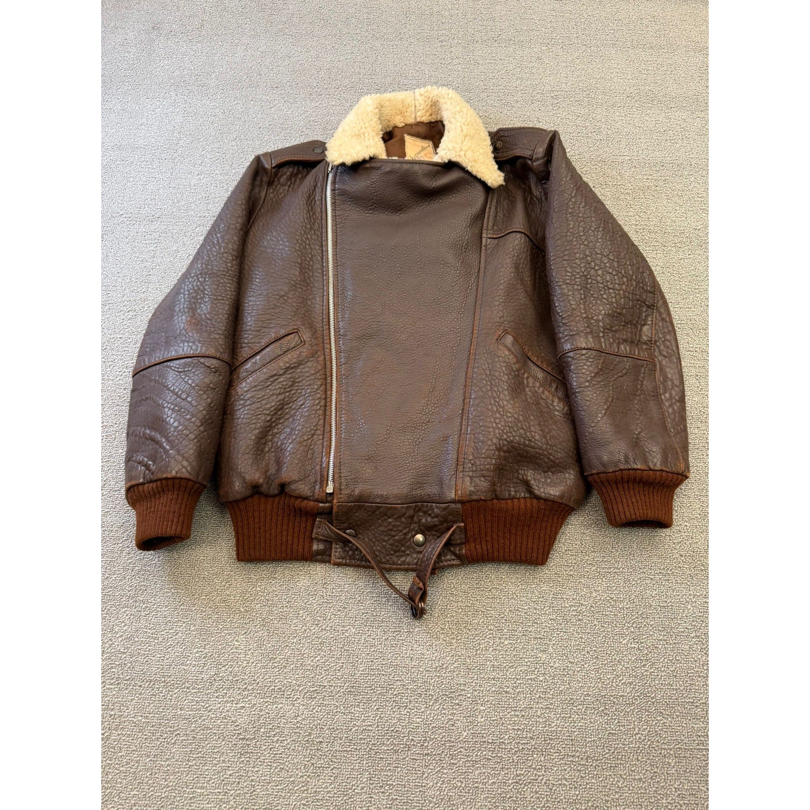 Vintage Créations Jacqueline C bomber-style leather jacket featuring a cozy shearling collar and textured pebbled brown leather. The asymmetrical zip and ribbed cuffs and hem.
