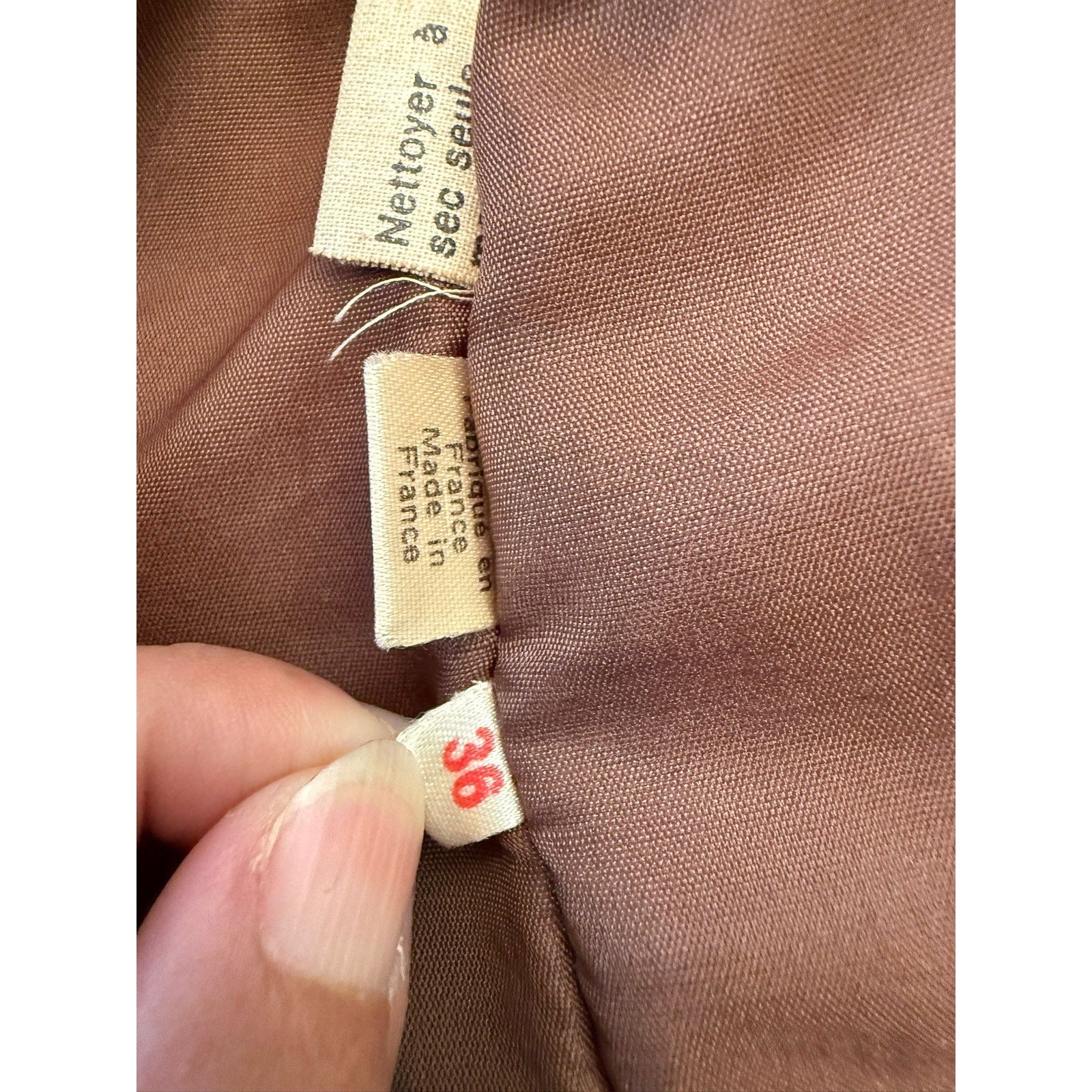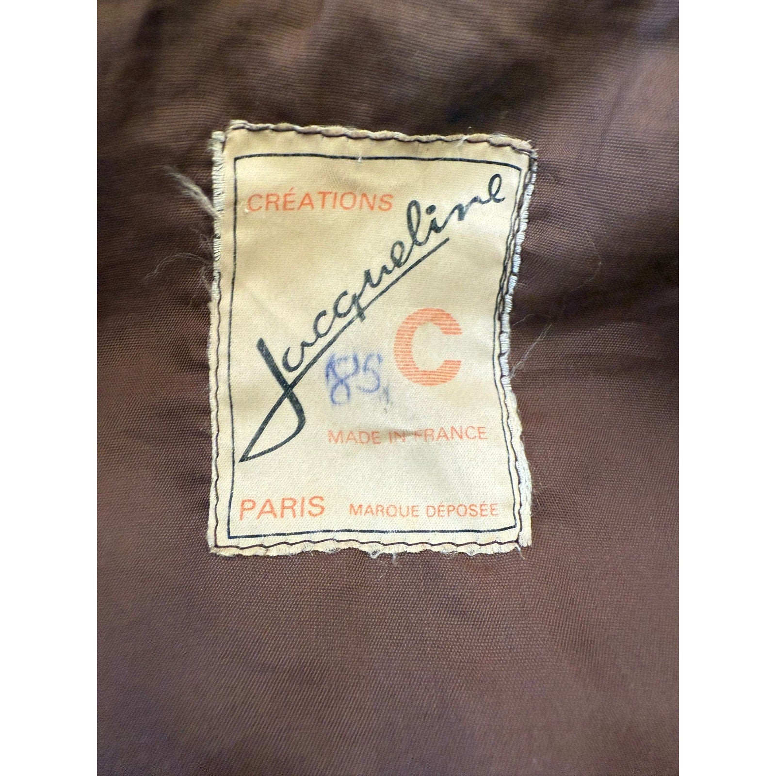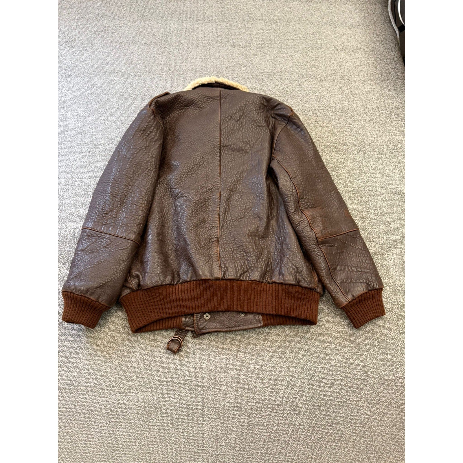 Vintage Créations Jacqueline C bomber-style leather jacket featuring a cozy shearling collar and textured pebbled brown leather. The asymmetrical zip and ribbed cuffs and hem.