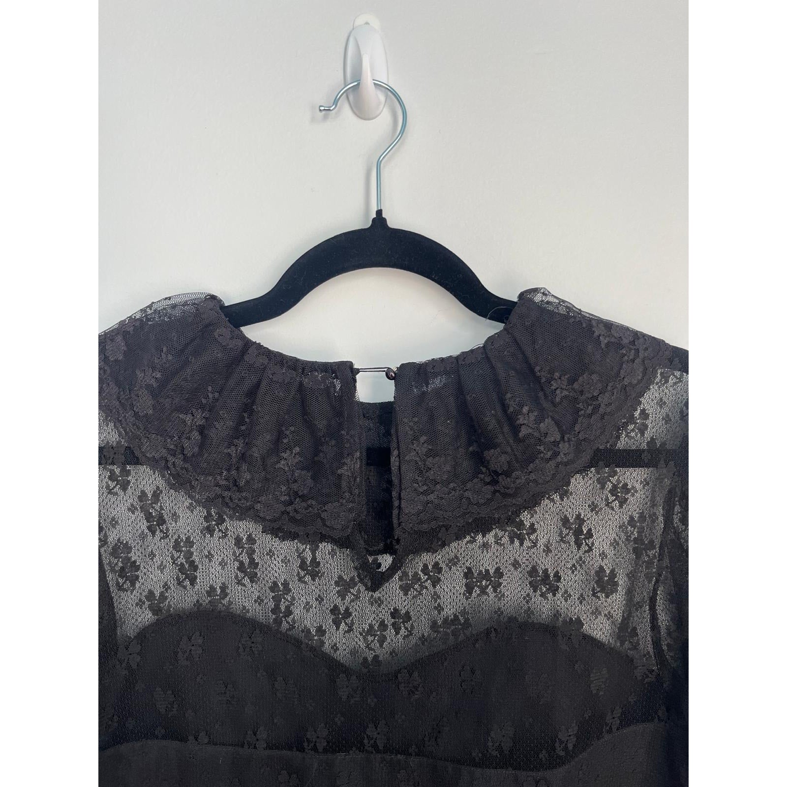 Romantic Victorian-inspired sheer black lace blouse featuring puff sleeves, scalloped ruffle collar, and floral embroidery. Semi-fitted silhouette with back keyhole closure—ideal for vintage styling or evening wear.