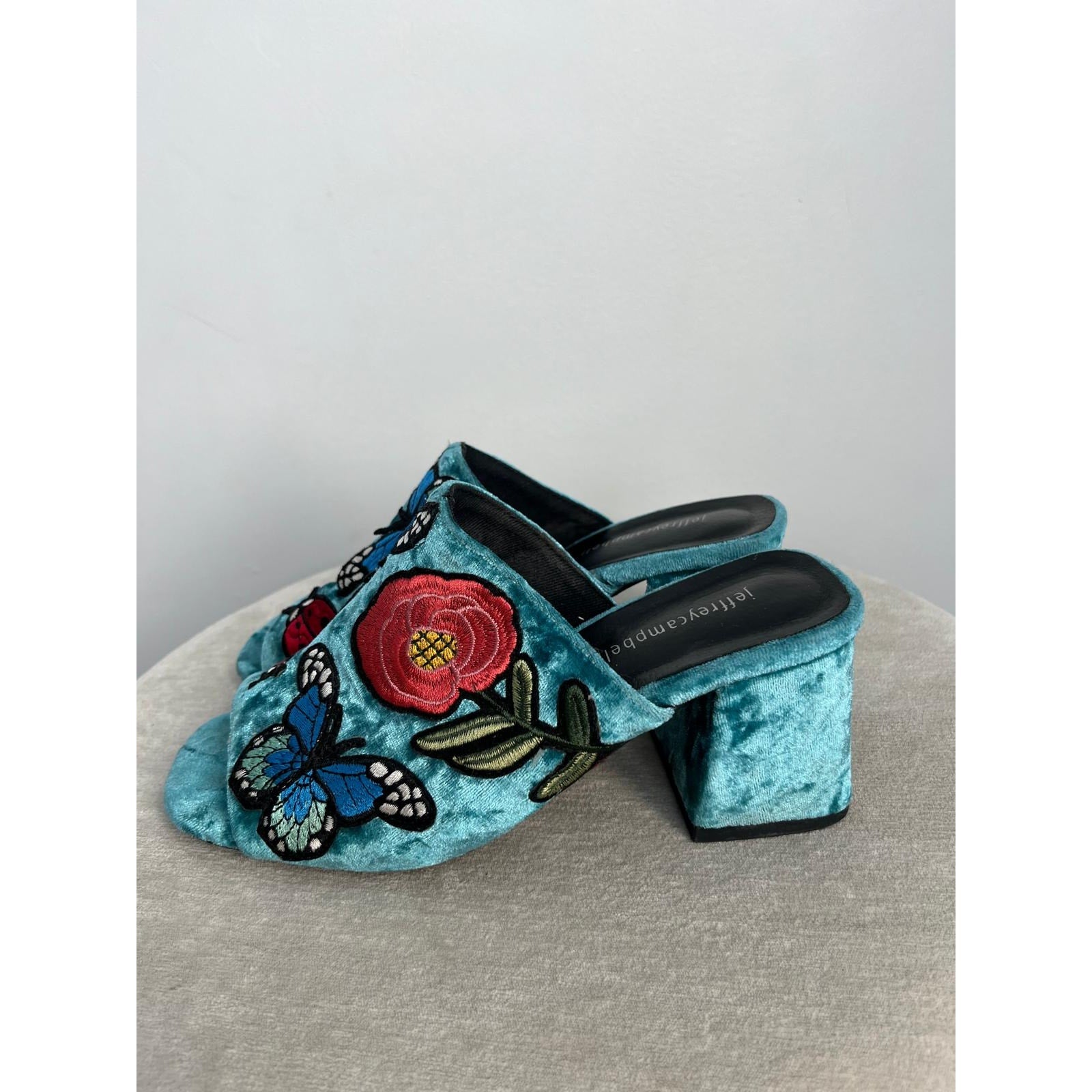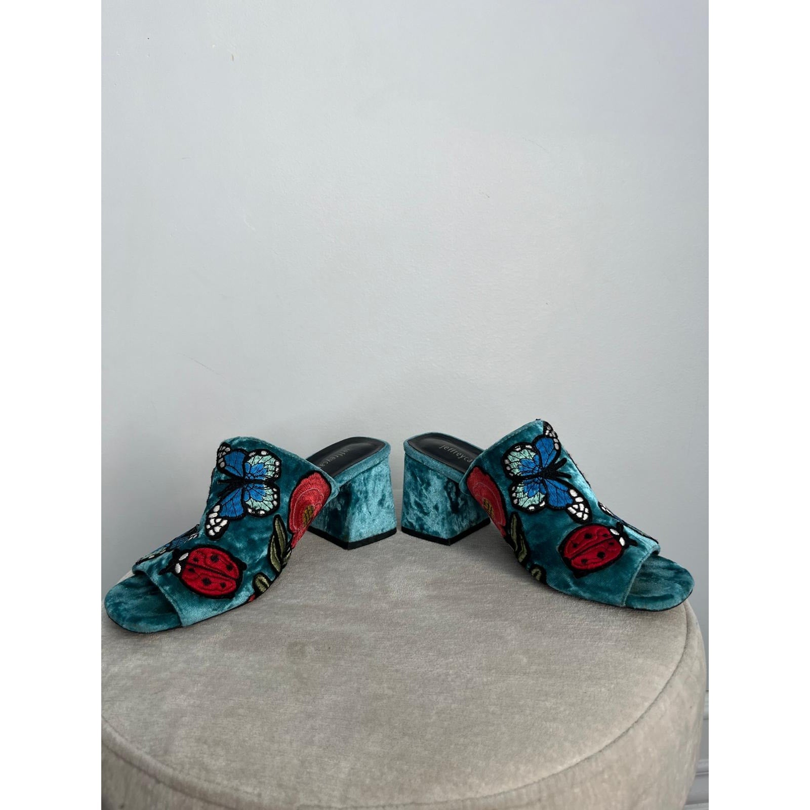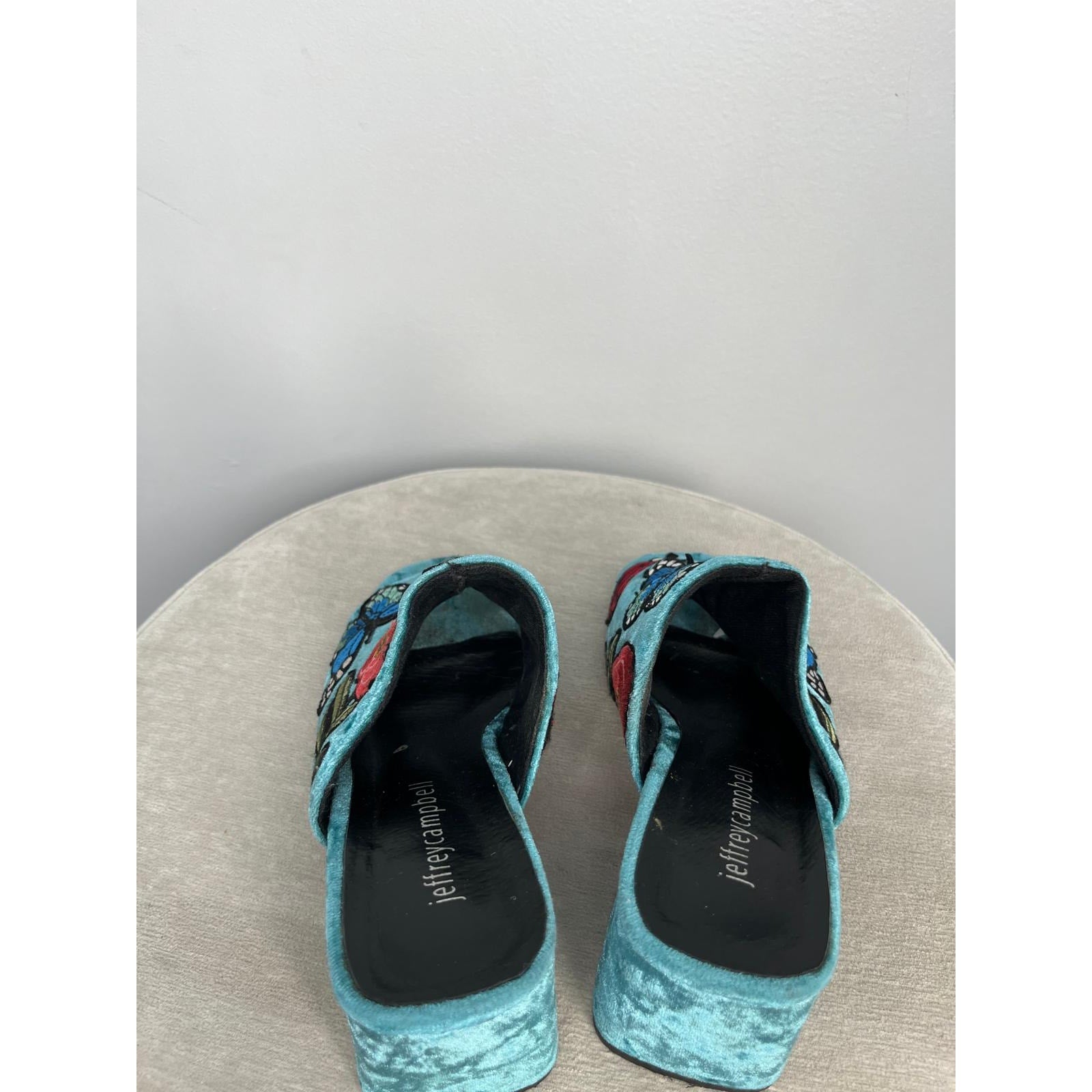 Vibrant crushed velvet open-toe mules by Jeffrey Campbell featuring floral and butterfly embroidery, a chunky block heel, and a striking teal blue finish. A bold statement shoe with retro flair.