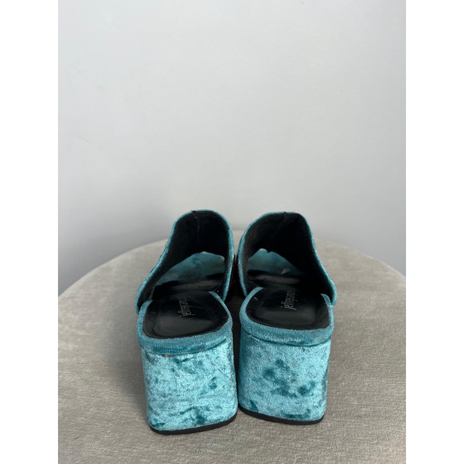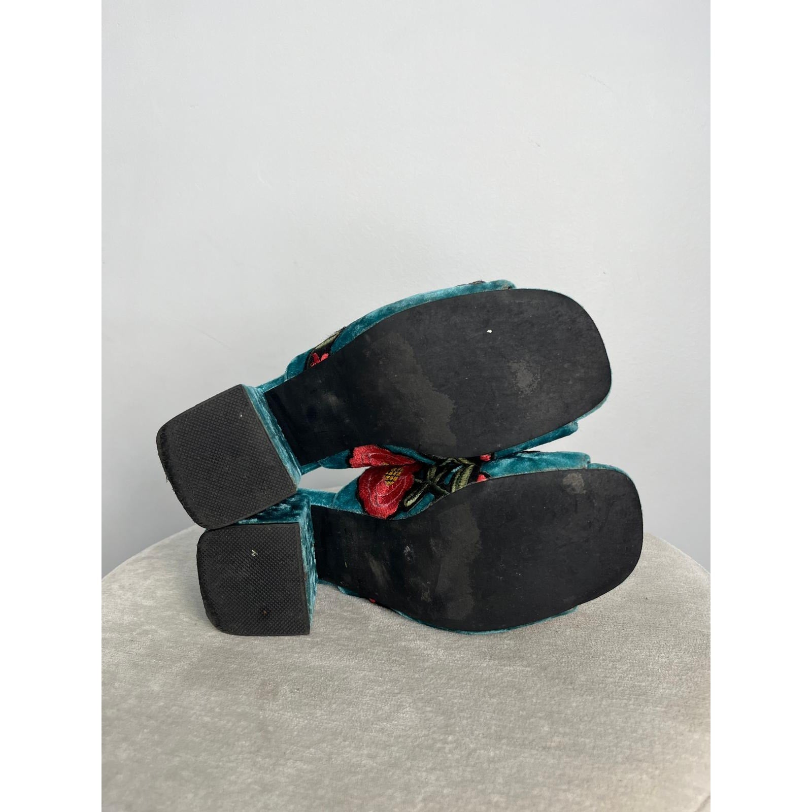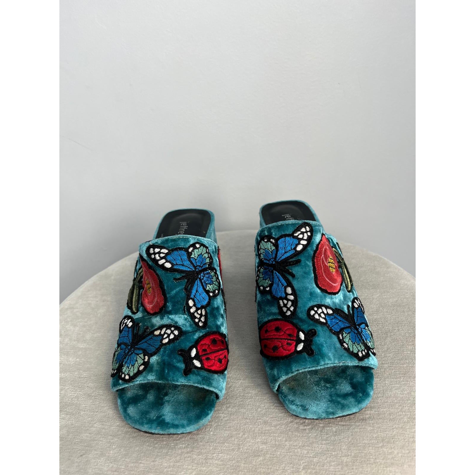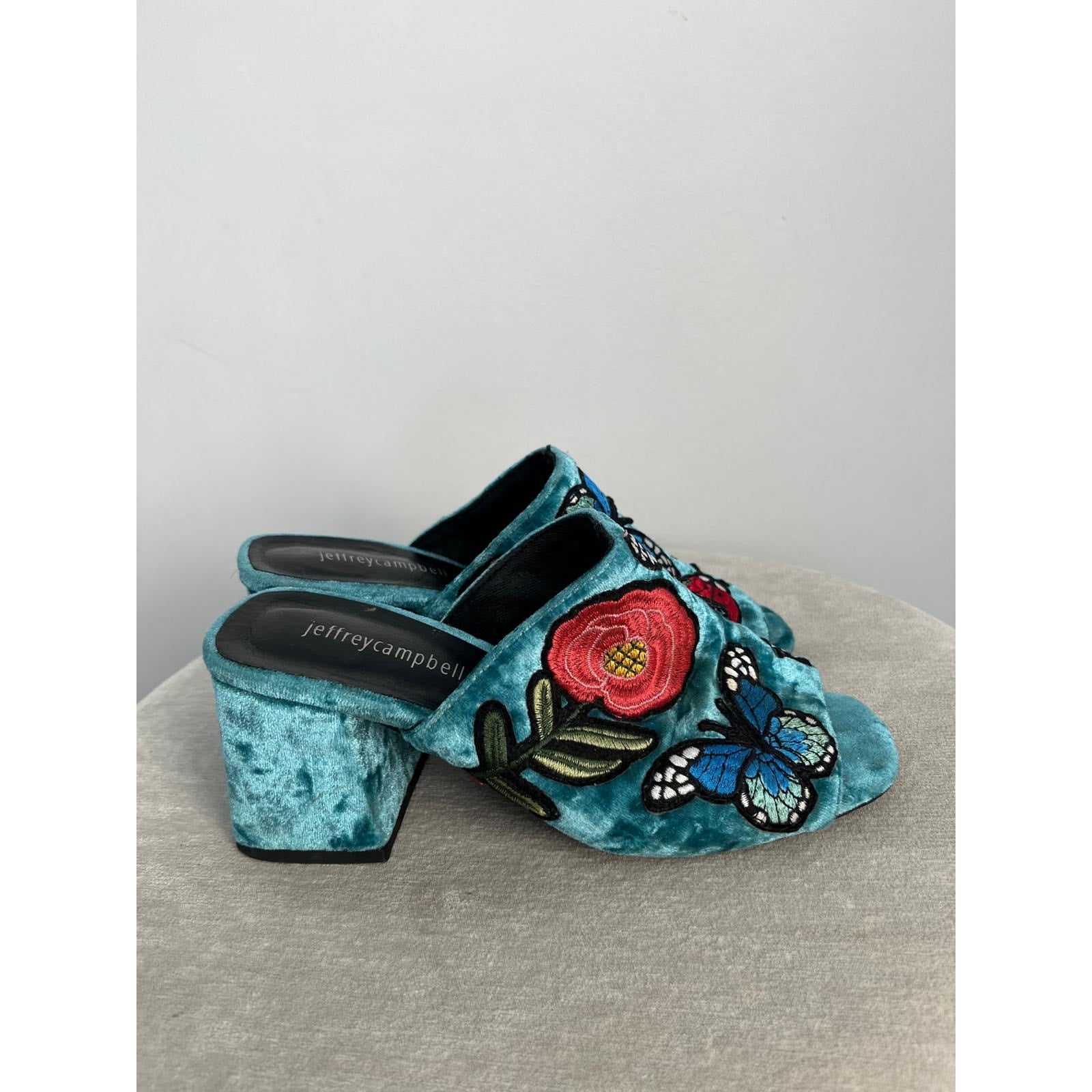 Vibrant crushed velvet open-toe mules by Jeffrey Campbell featuring floral and butterfly embroidery, a chunky block heel, and a striking teal blue finish. A bold statement shoe with retro flair.