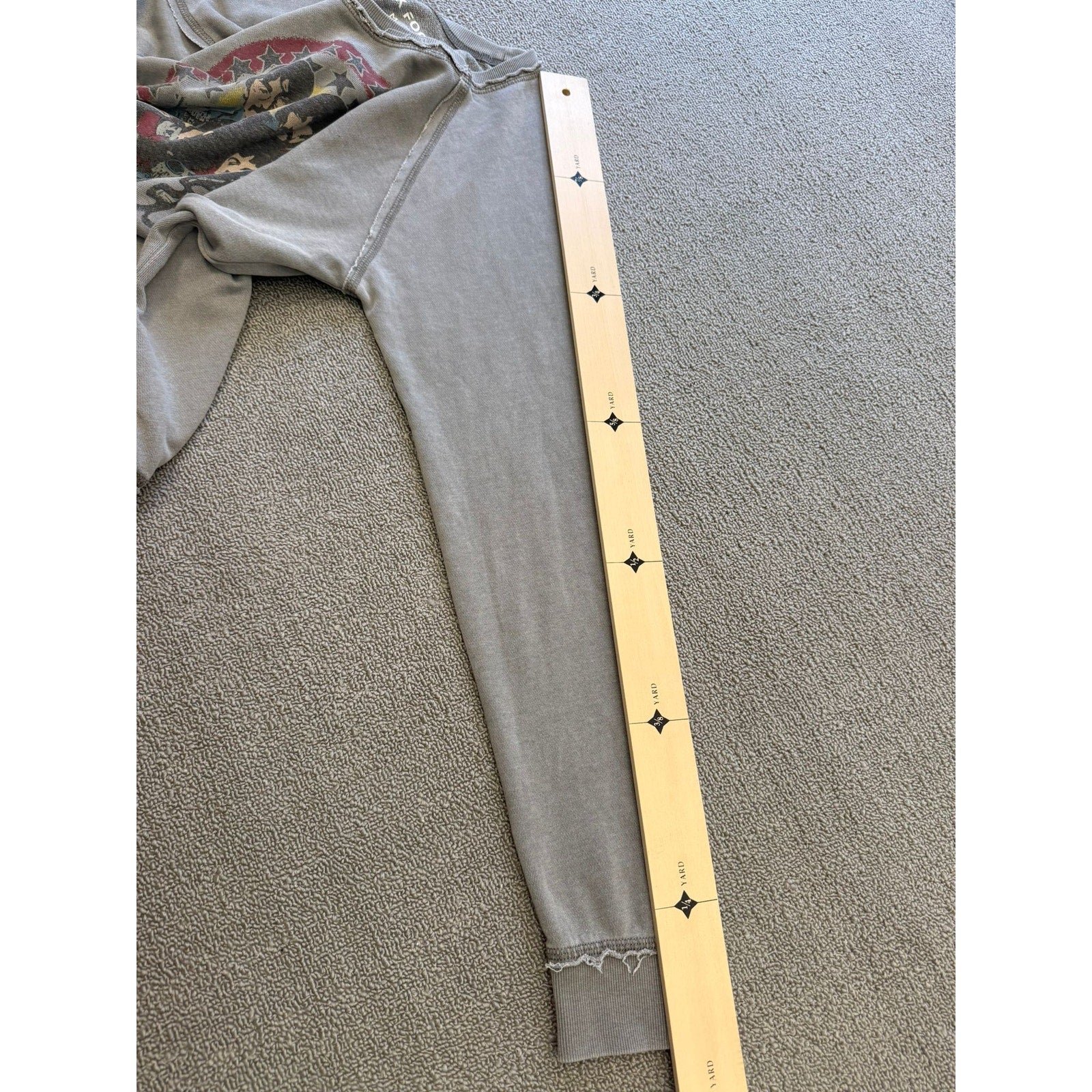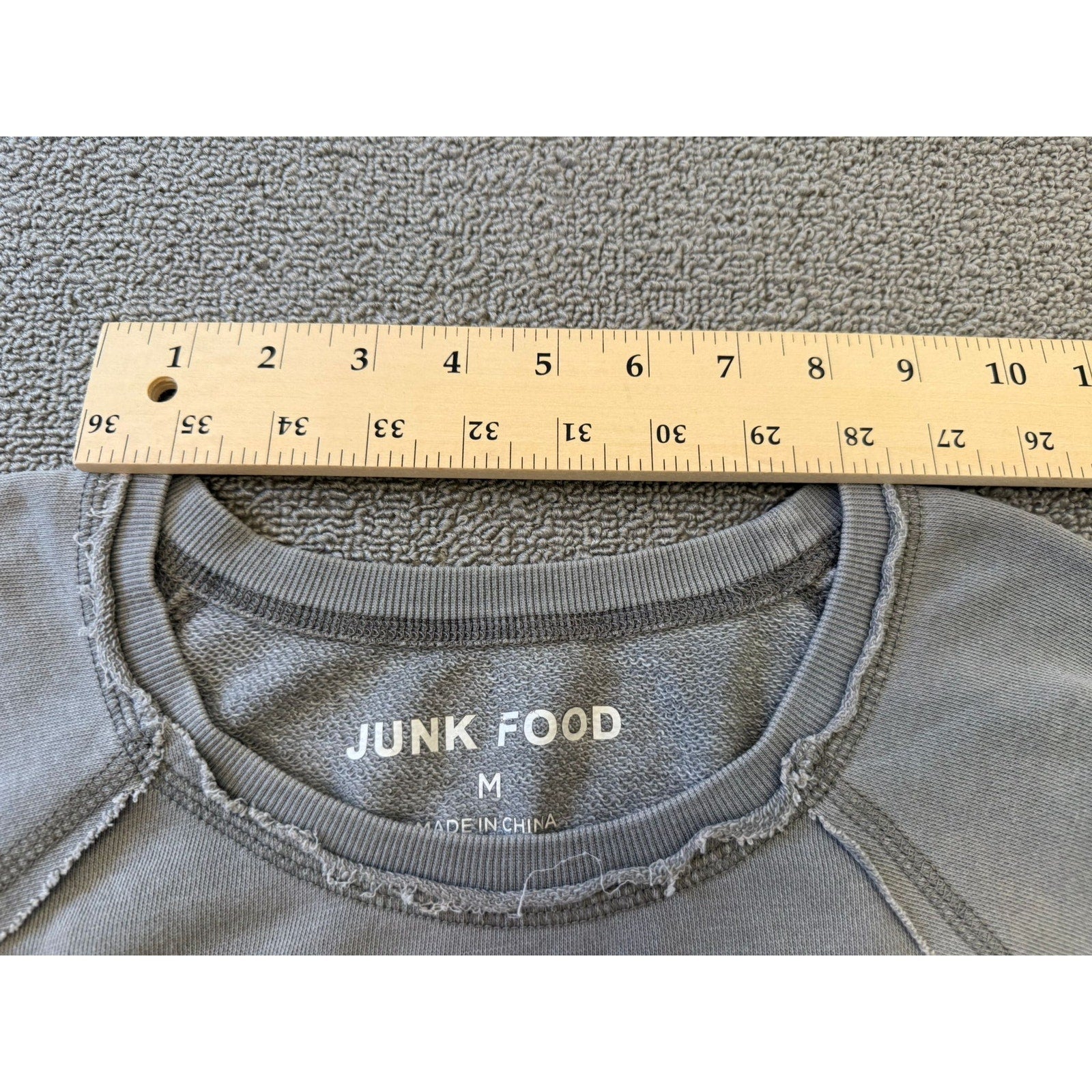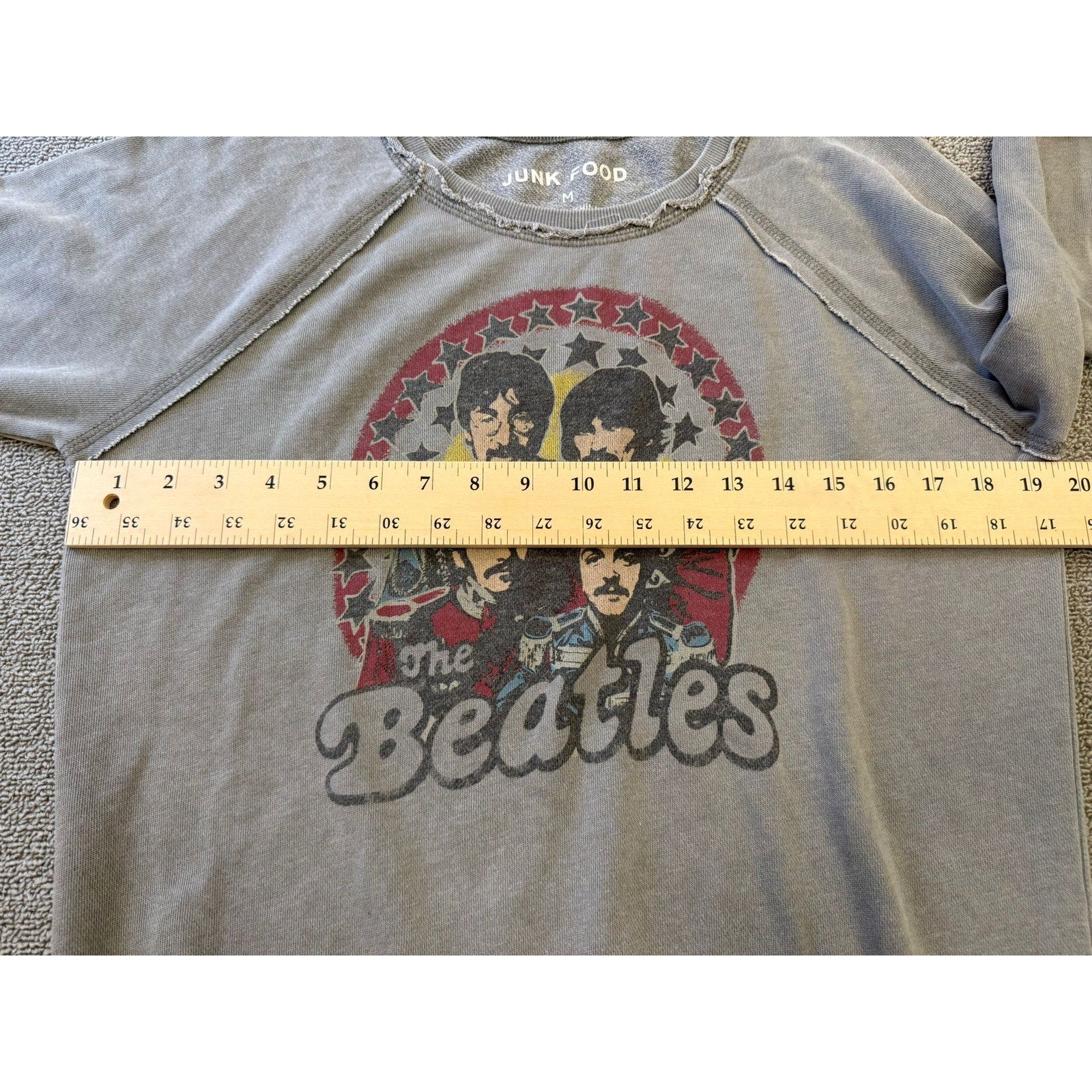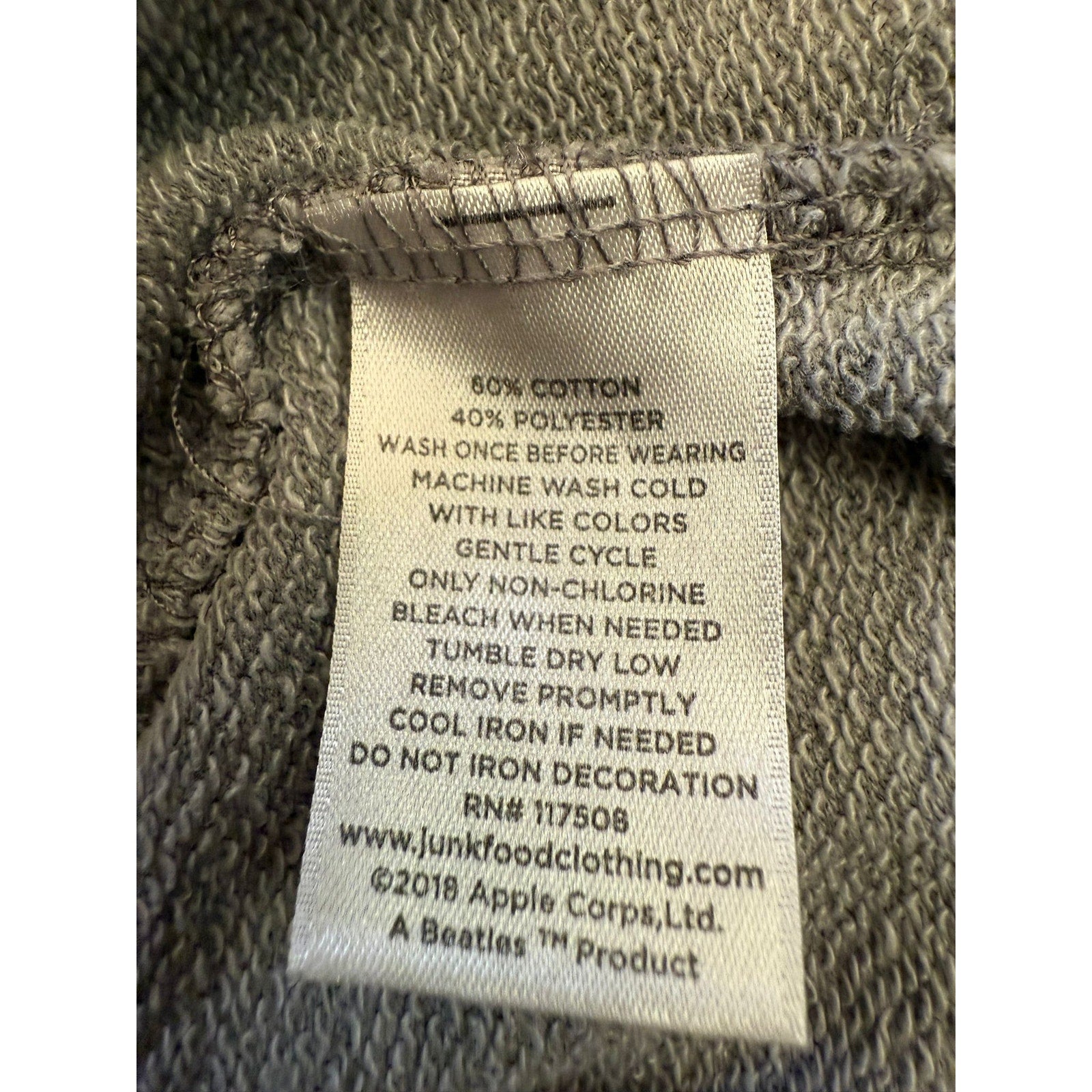 Vintage-inspired gray crewneck sweatshirt by Junk Food featuring a bold, distressed graphic of The Beatles. Made of soft cotton-blend fabric with raw seam details for a worn-in aesthetic—perfect for fans and street-style lovers.