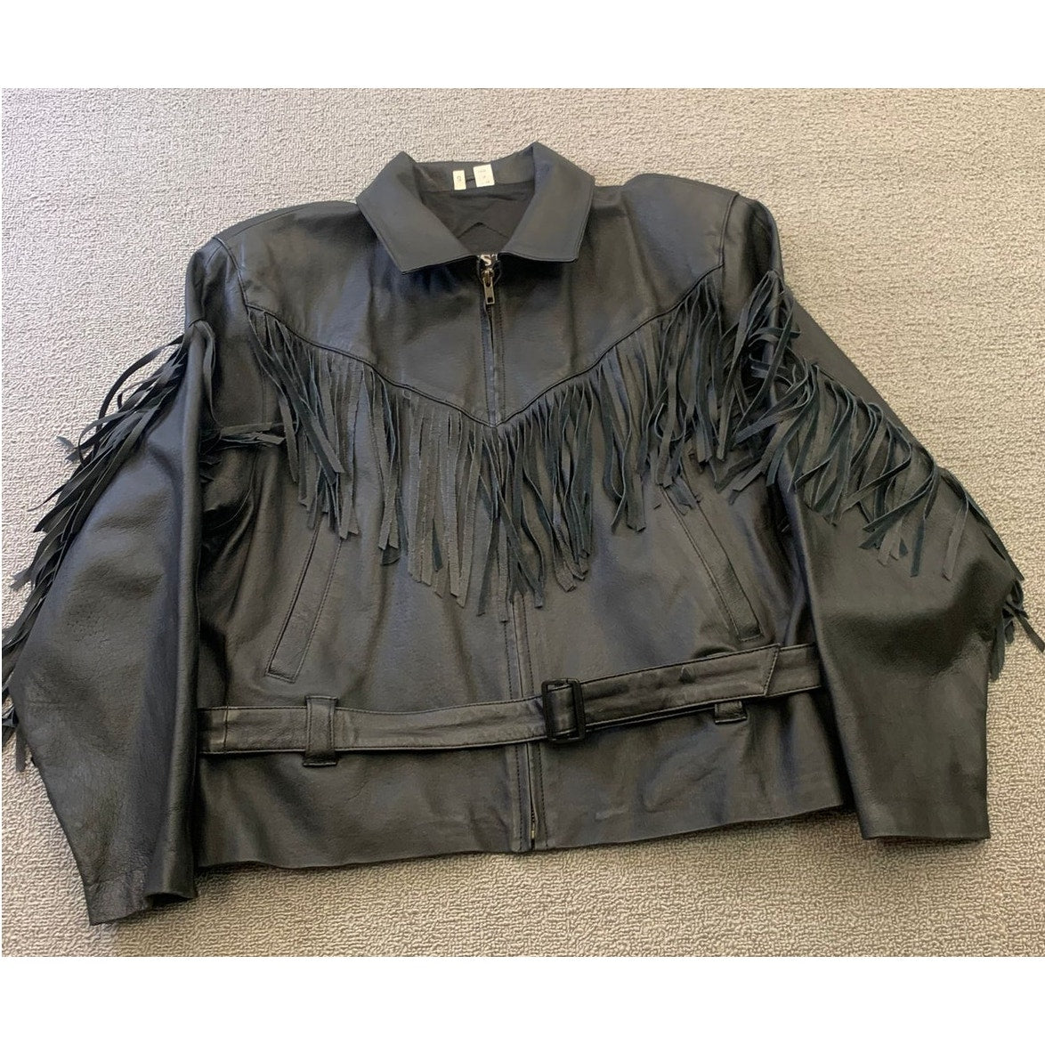 A vintage Just Joshua leather fringe jacket in size S, featuring a western‑inspired zip front, shirt collar, and dramatic fringe across the chest and along the sleeves.