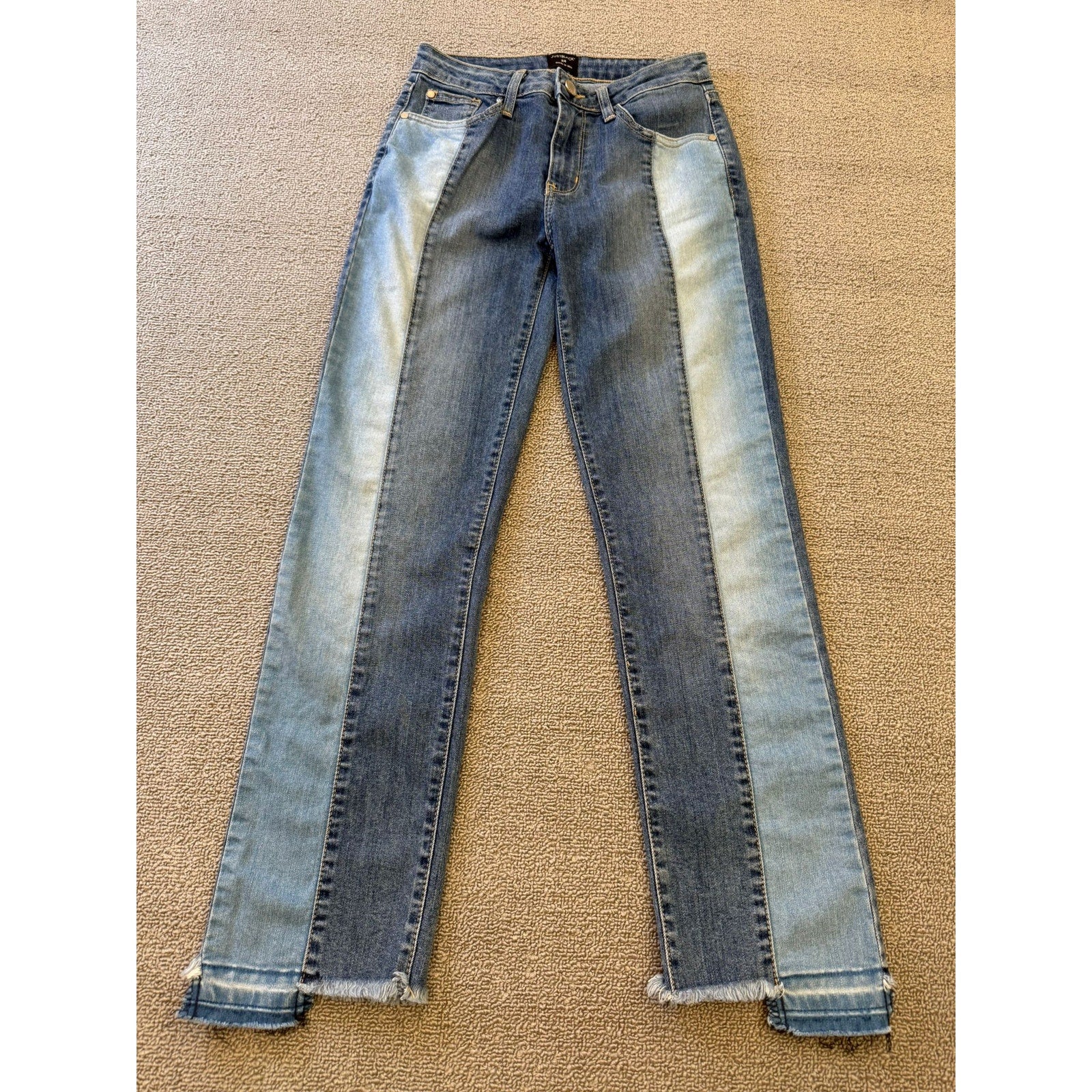 Just Black women’s two-tone panel skinny jeans. Features contrast light and dark denim panels down the legs, raw frayed hems, and classic five-pocket design. Mid-rise fit with zip fly and button closure. Made in USA.