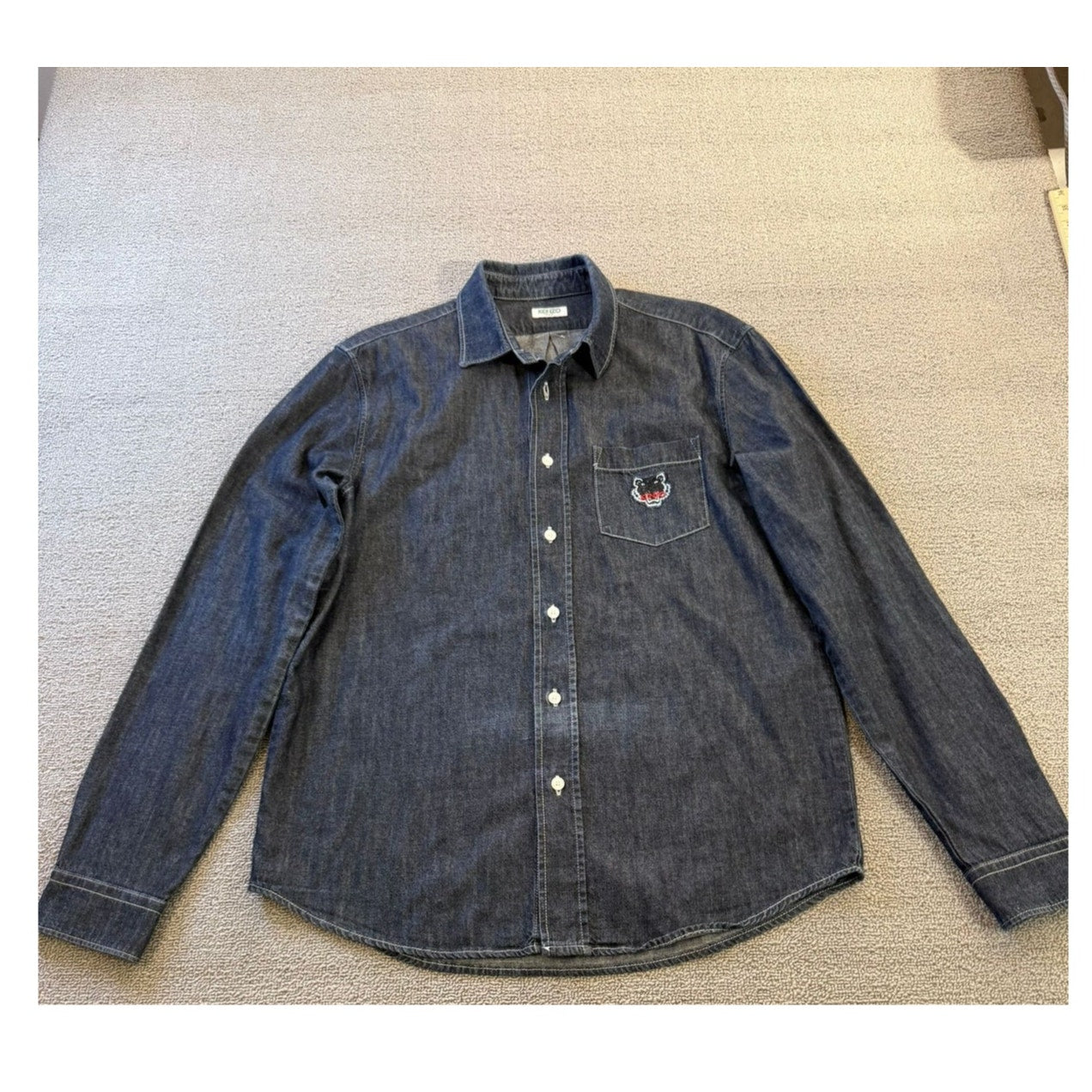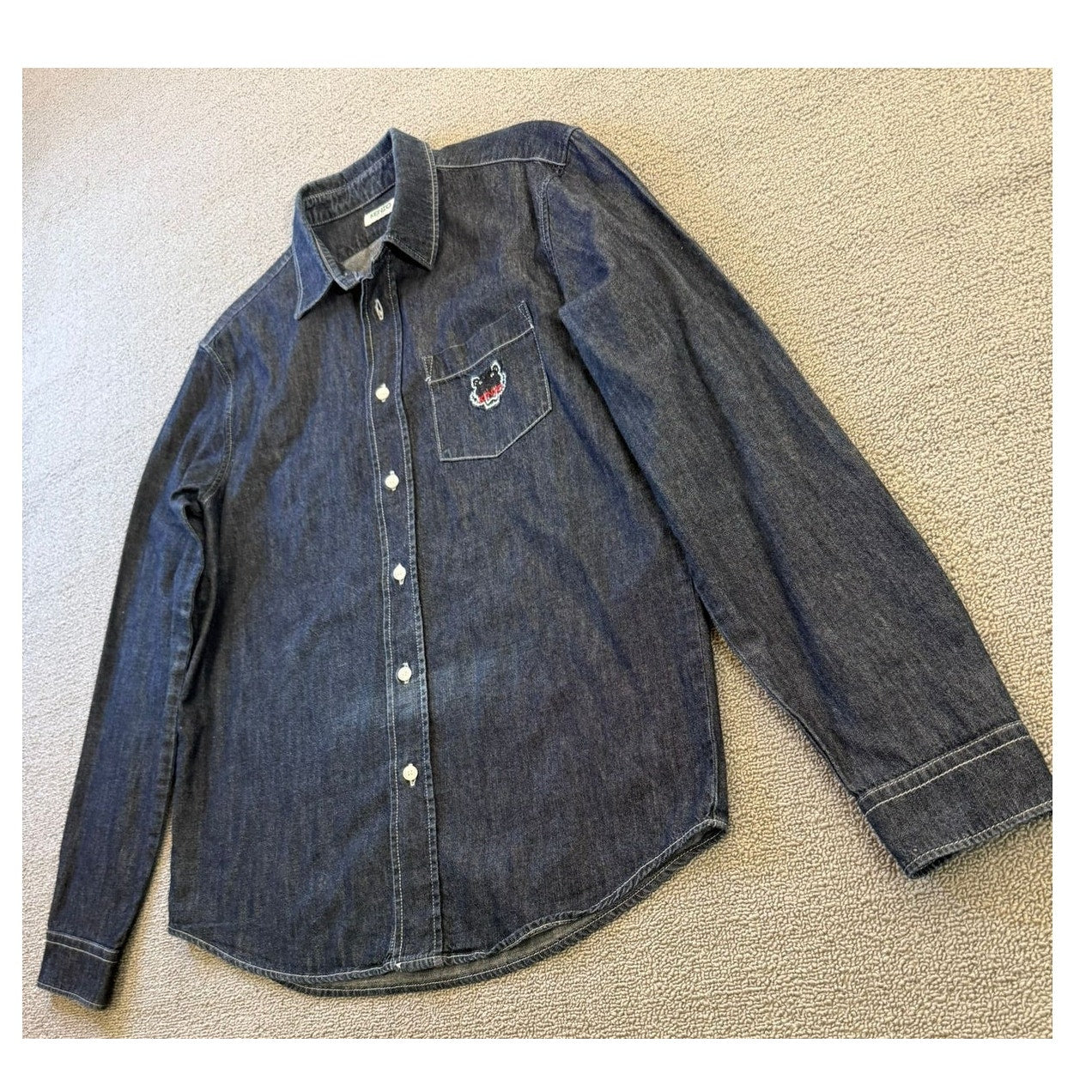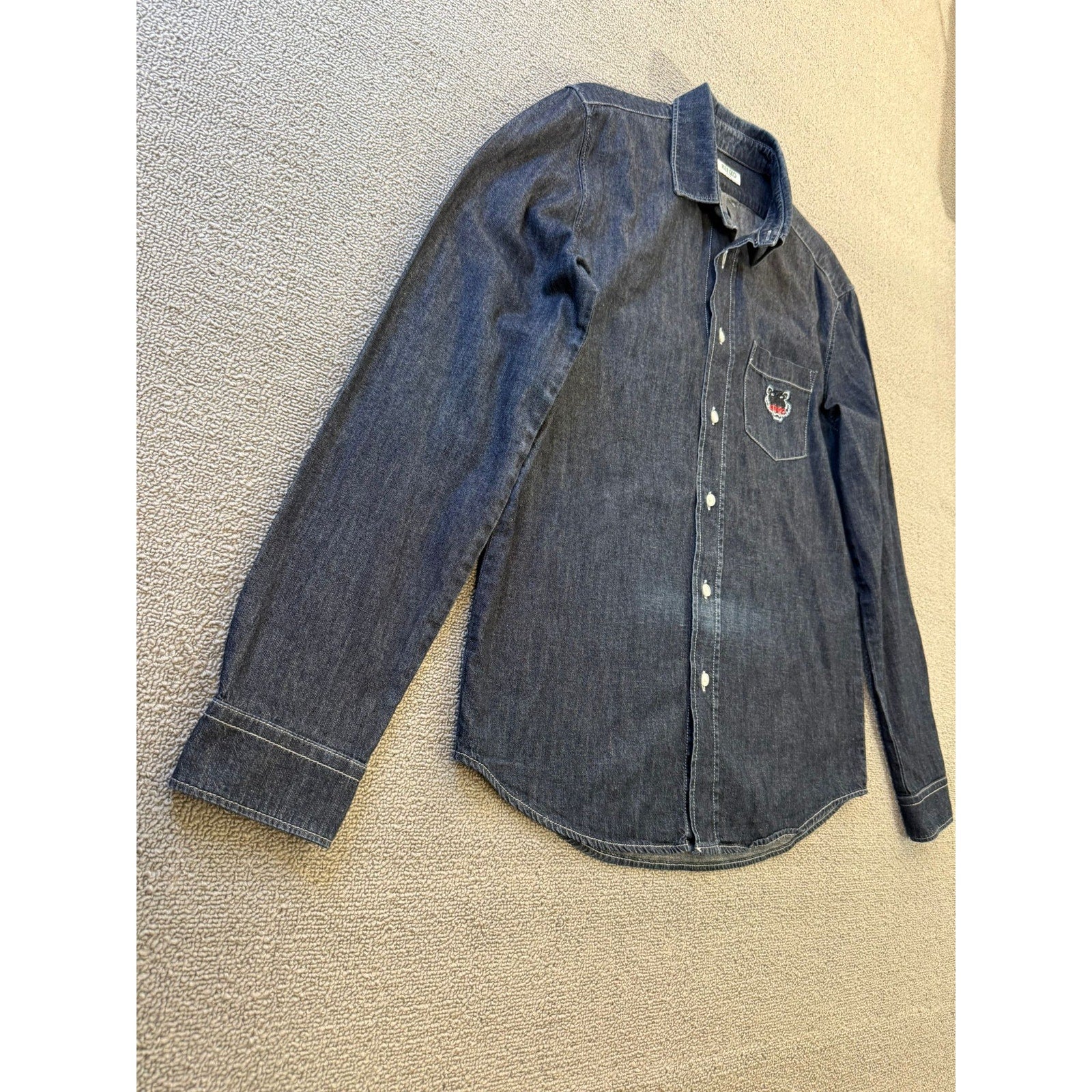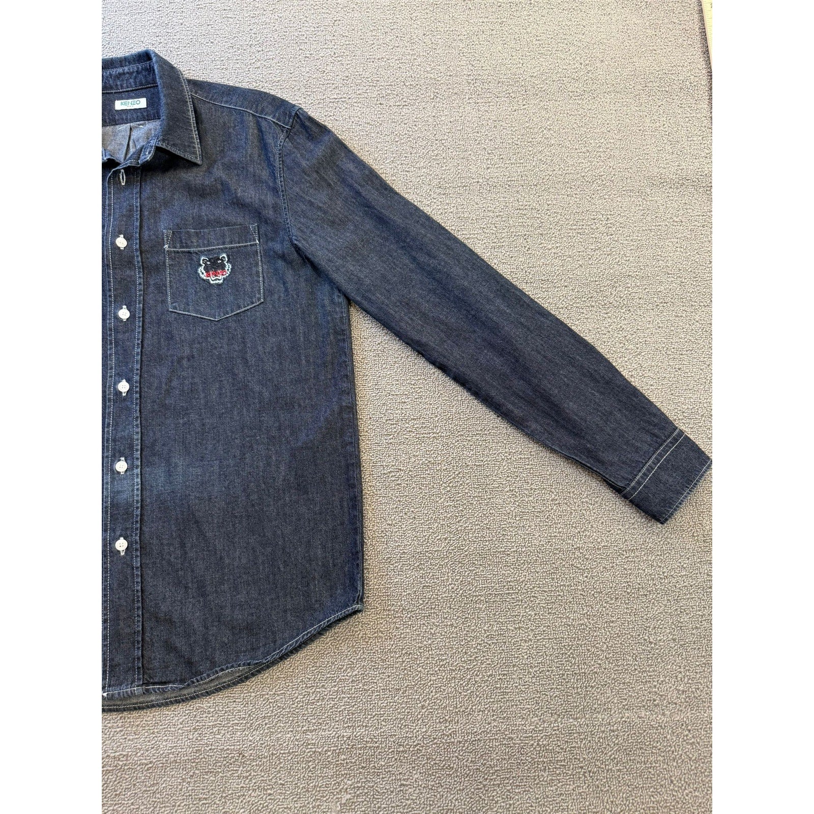 A stylish unisex denim button‑up shirt by Kenzo Paris, featuring dark-wash fabric and an iconic embroidered tiger (or logo) on the chest pocket—blends casual Western with high-fashion streetwear.