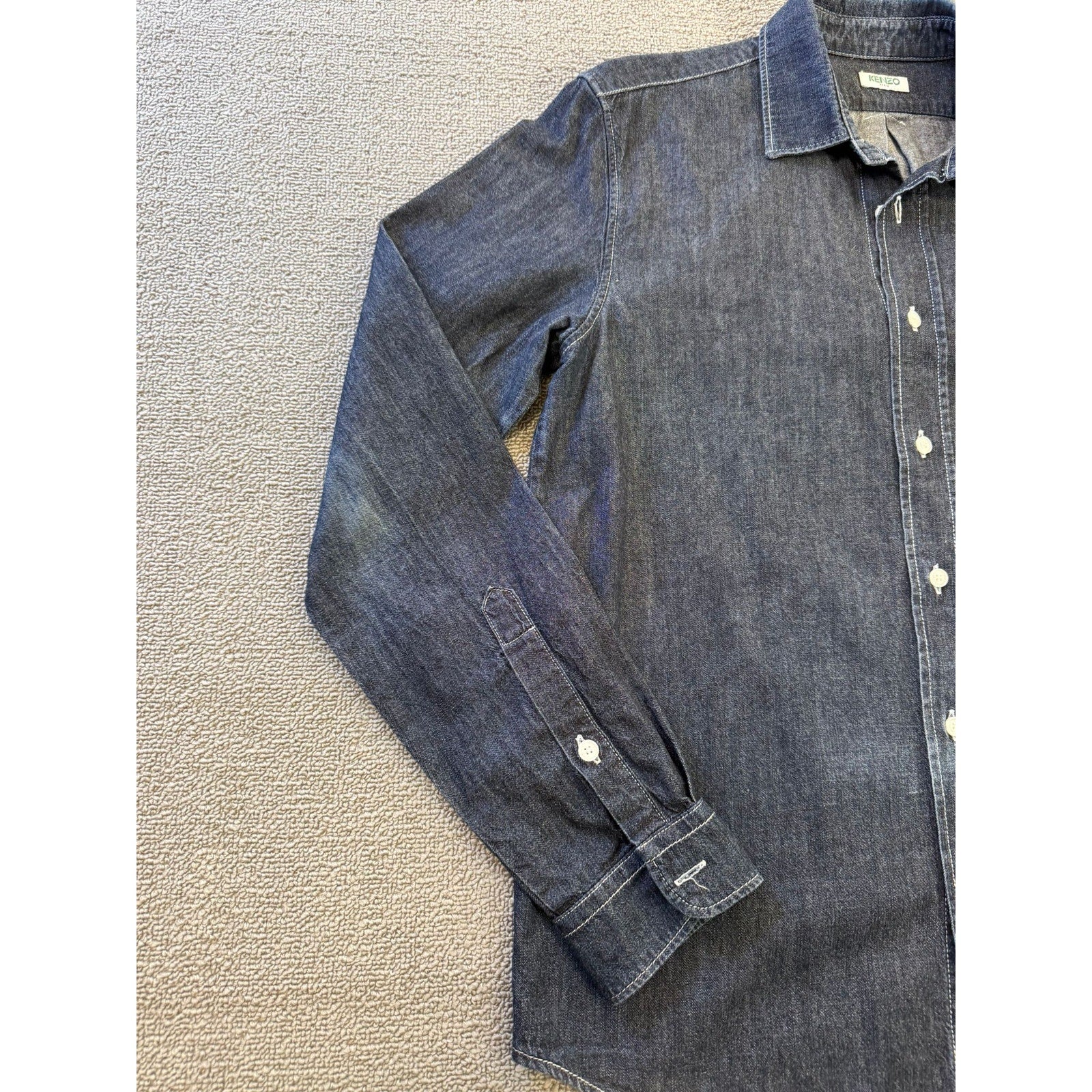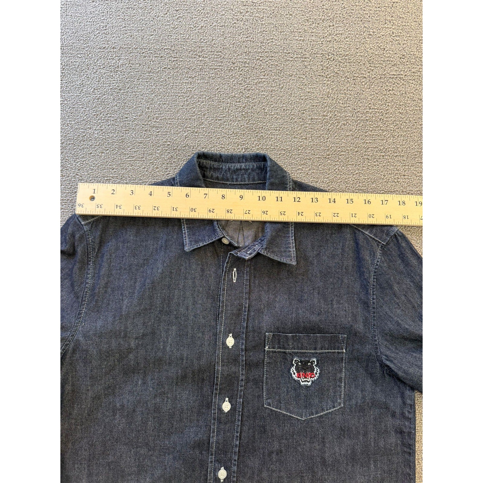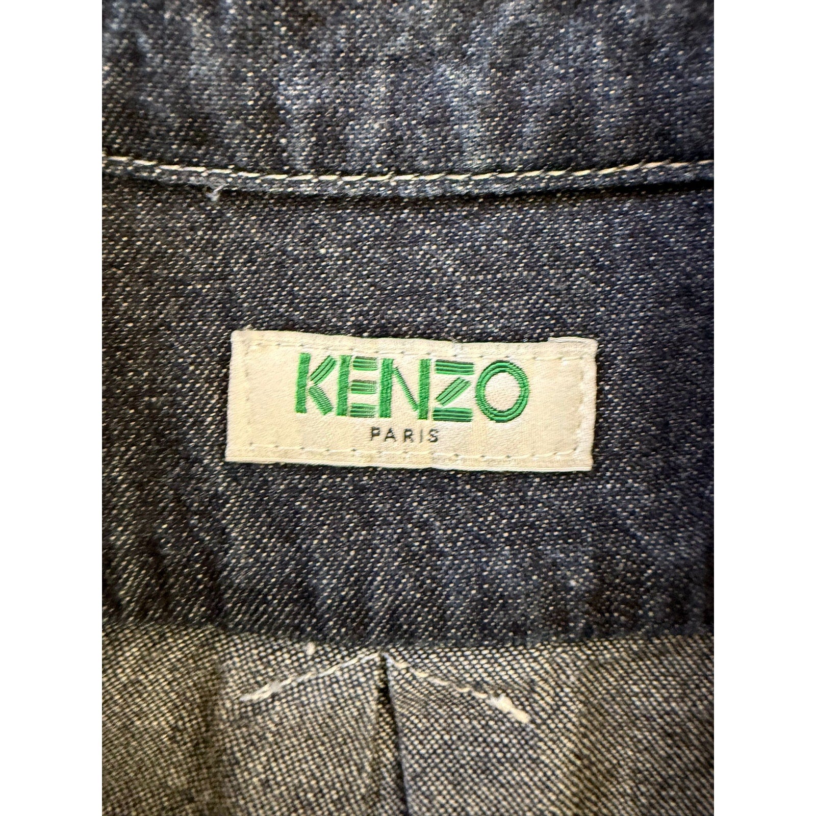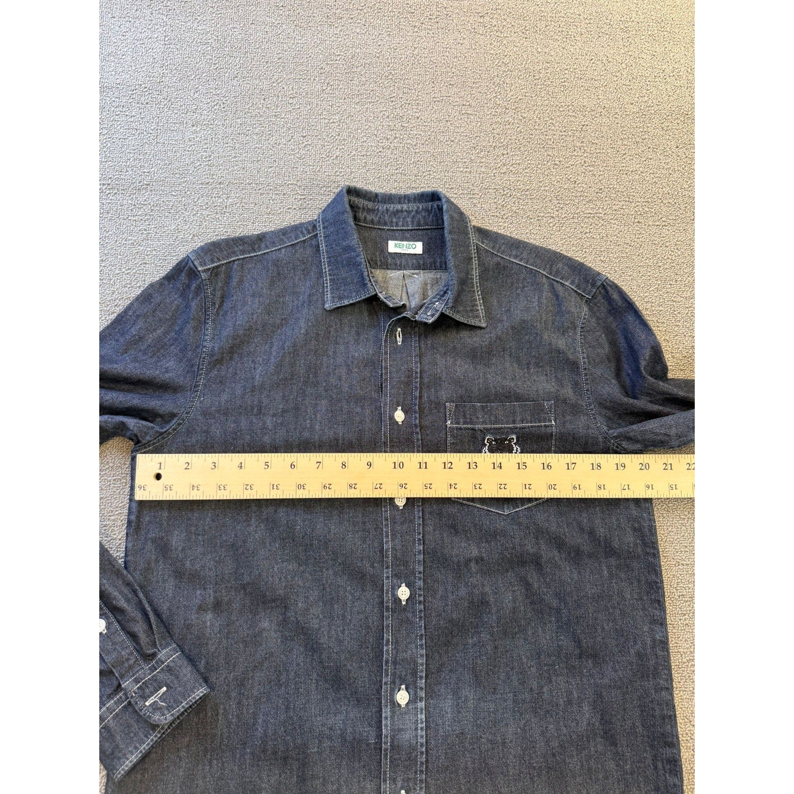 A stylish unisex denim button‑up shirt by Kenzo Paris, featuring dark-wash fabric and an iconic embroidered tiger (or logo) on the chest pocket—blends casual Western with high-fashion streetwear.