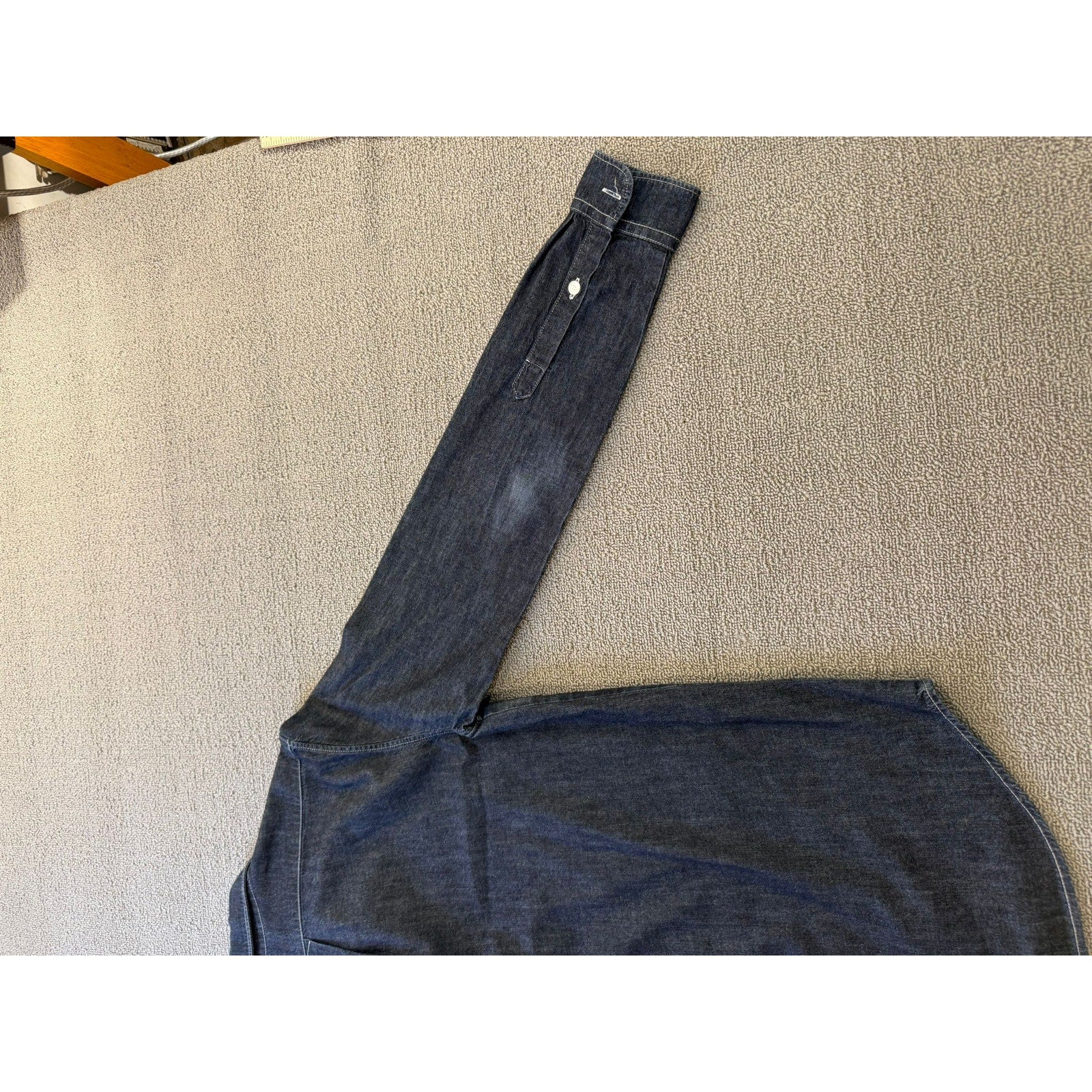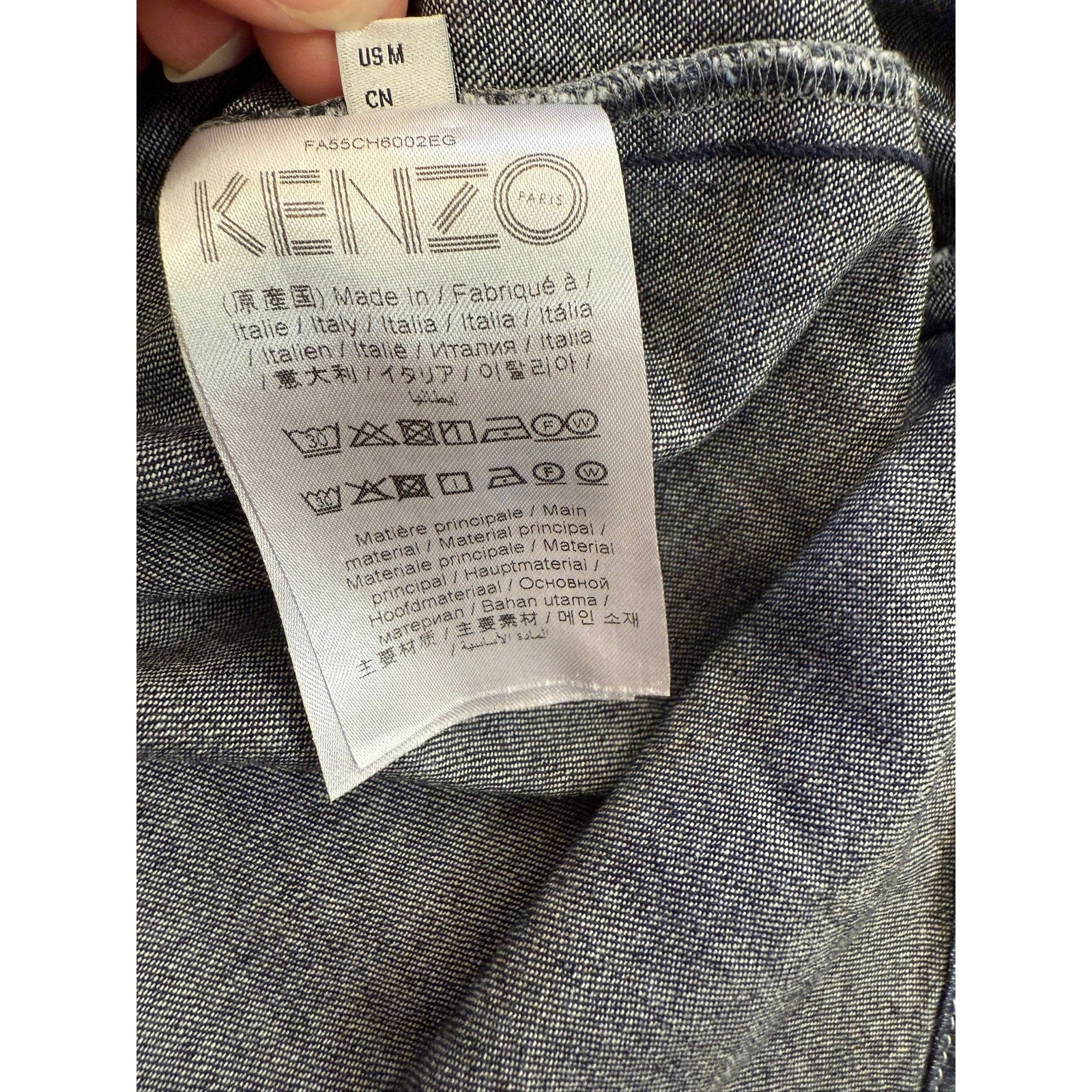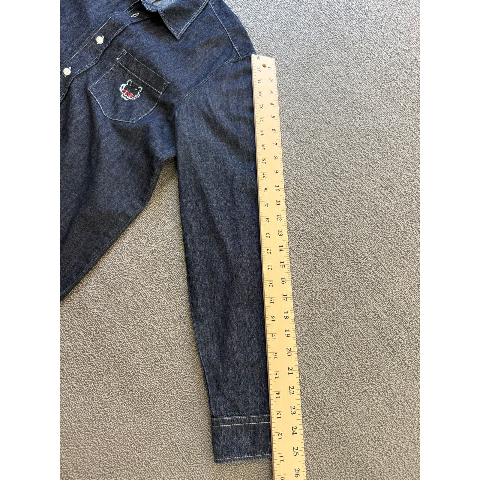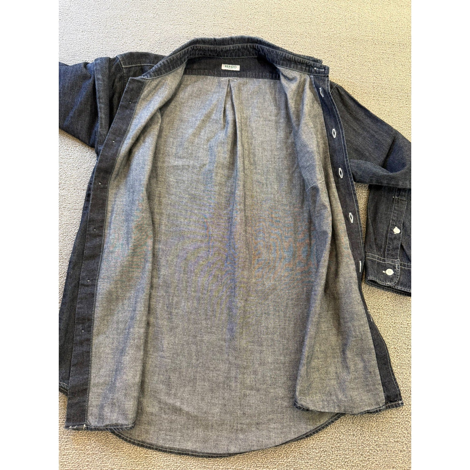 A stylish unisex denim button‑up shirt by Kenzo Paris, featuring dark-wash fabric and an iconic embroidered tiger (or logo) on the chest pocket—blends casual Western with high-fashion streetwear.