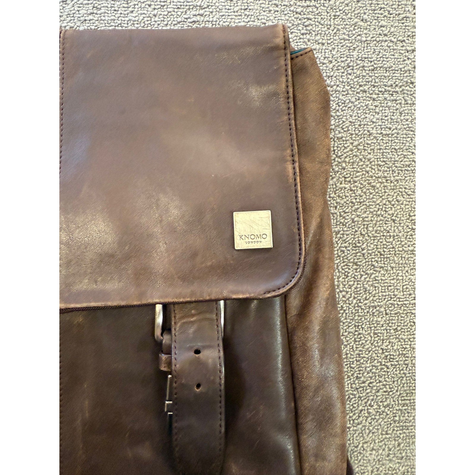 A premium Knomo London Hudson unisex leather backpack crafted in rich brown full-grain leather with a canvas back panel, secure flap with dual quick-release locks, padded shoulder straps, hidden phone pocket, and vibrant turquoise lining—designed for stylish yet functional city commuting.