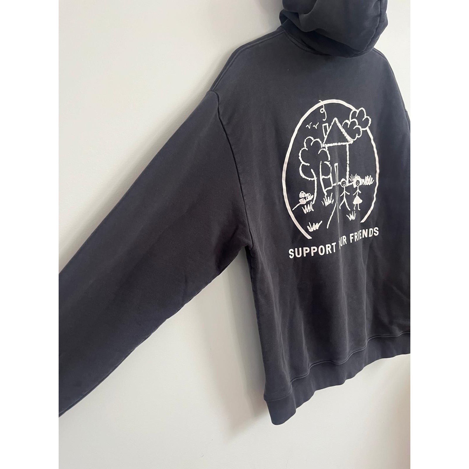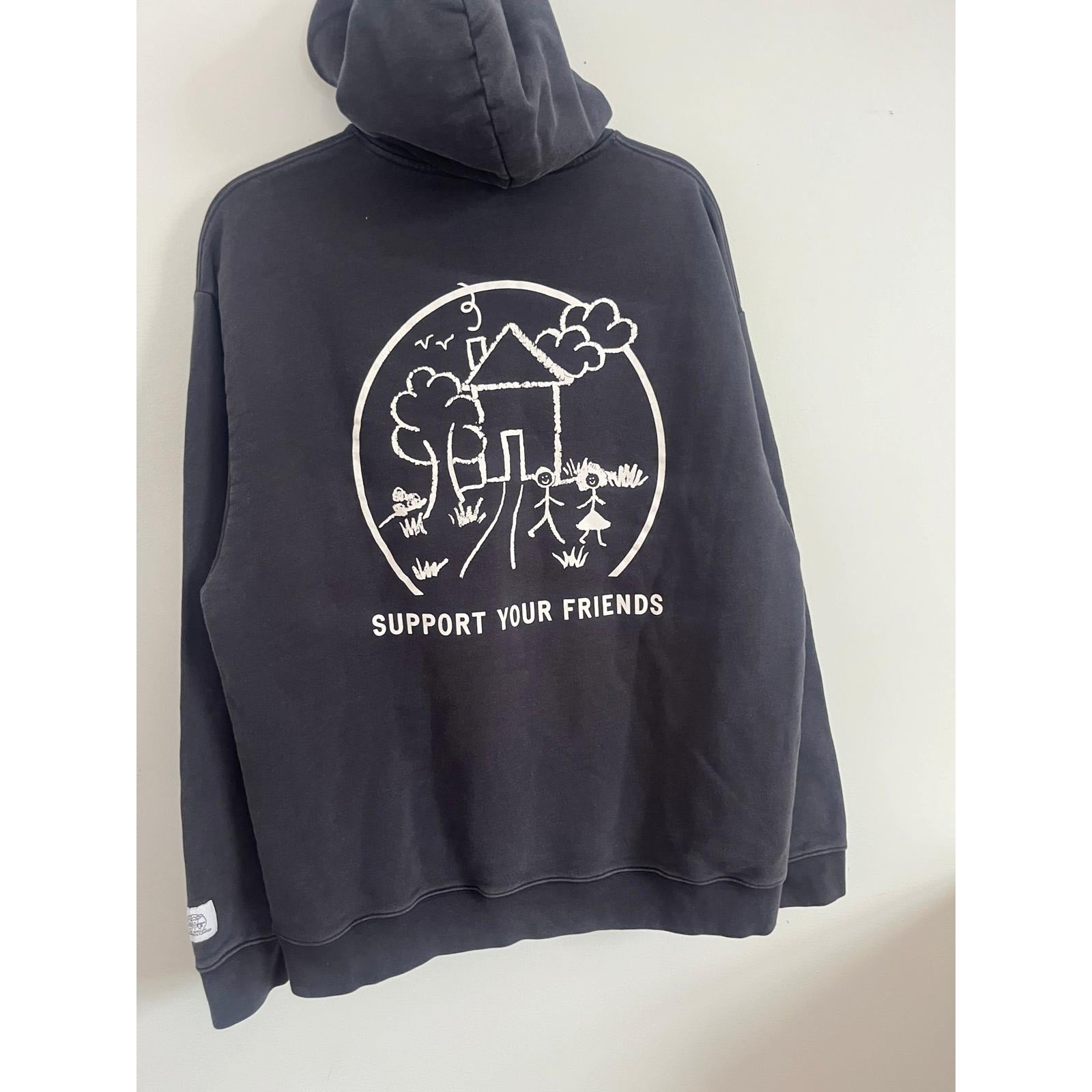 Black pullover hoodie with “someone special” text on the front chest and a large illustrated back print reading “Support Our Friends.” Drop shoulder cut, soft washed fabric, and kangaroo pocket.