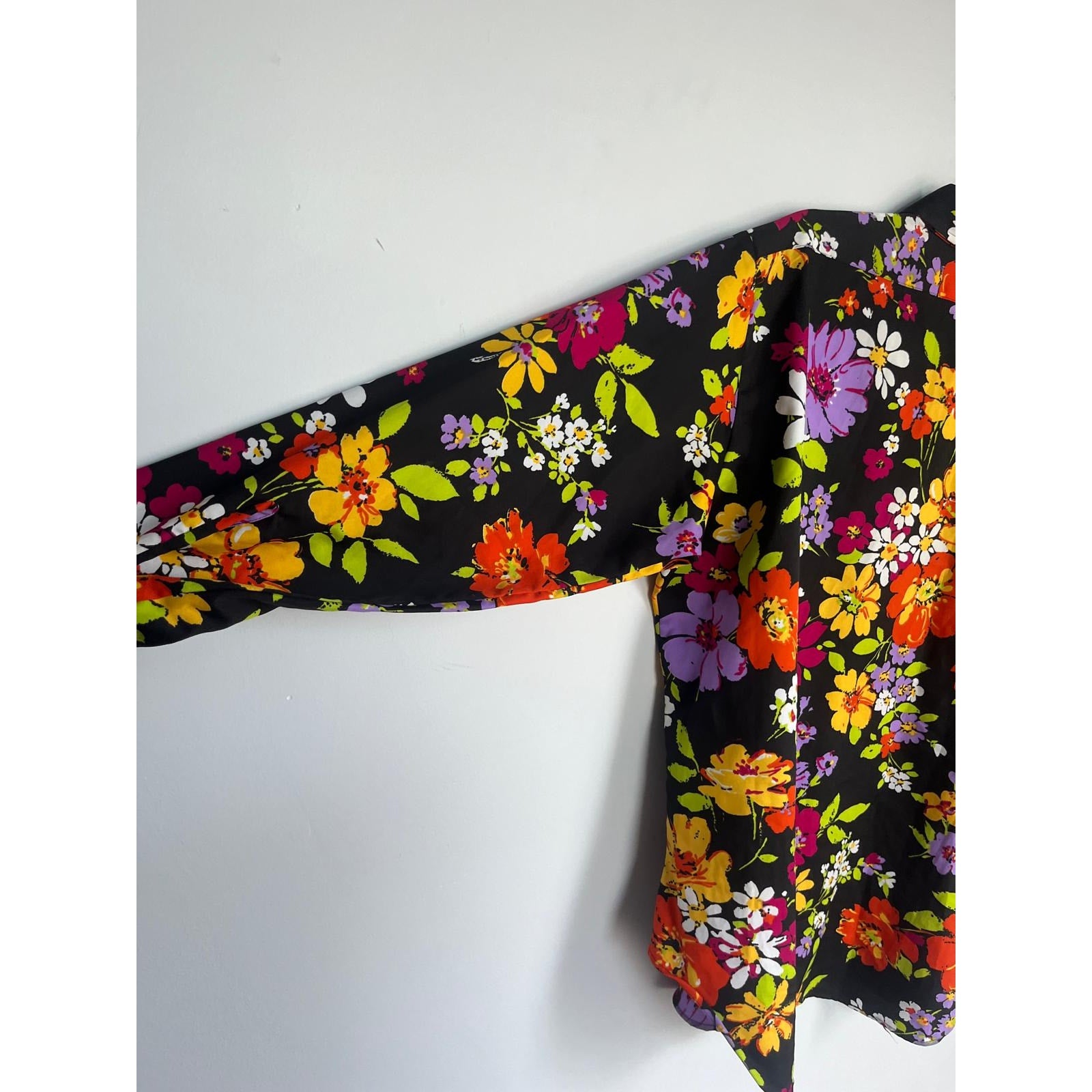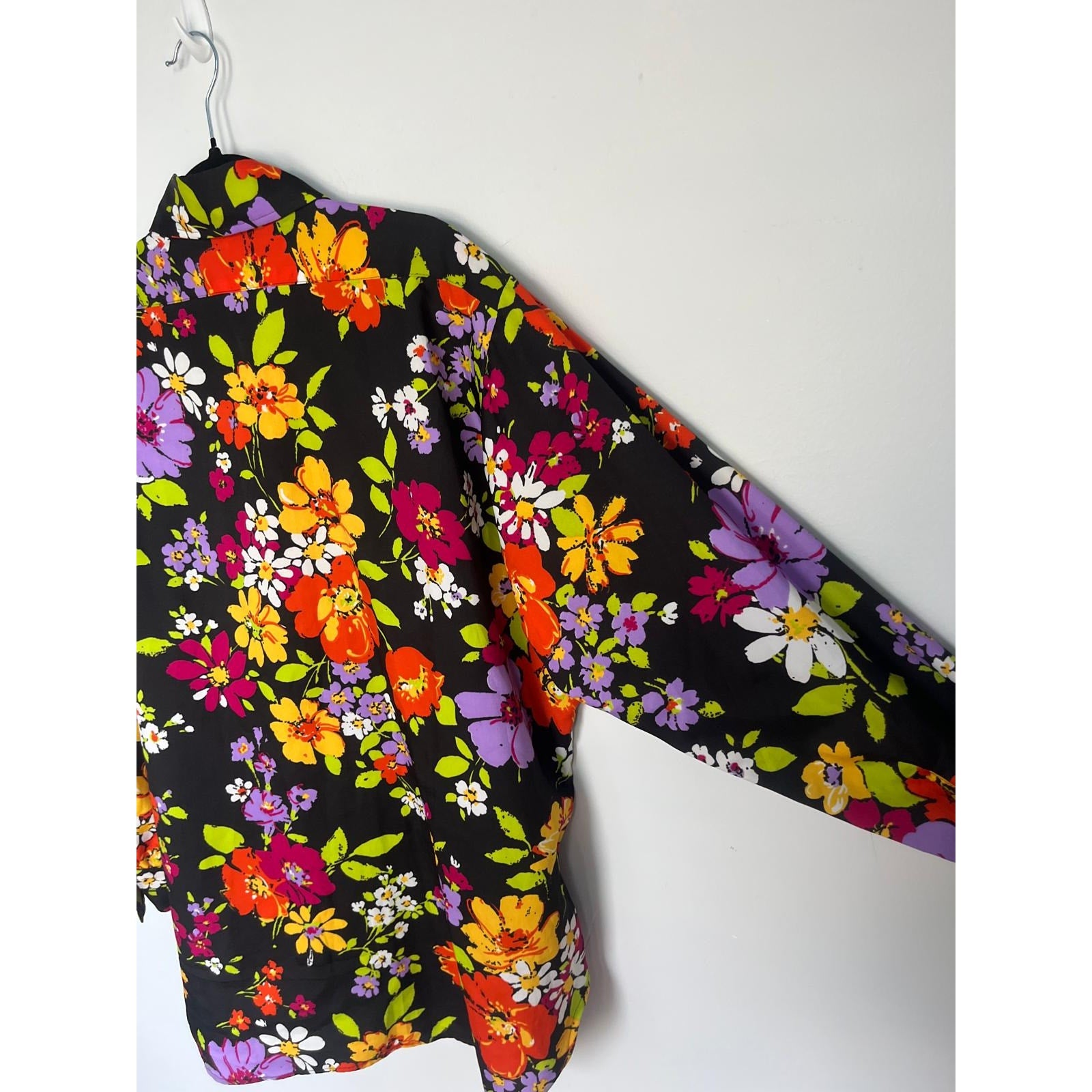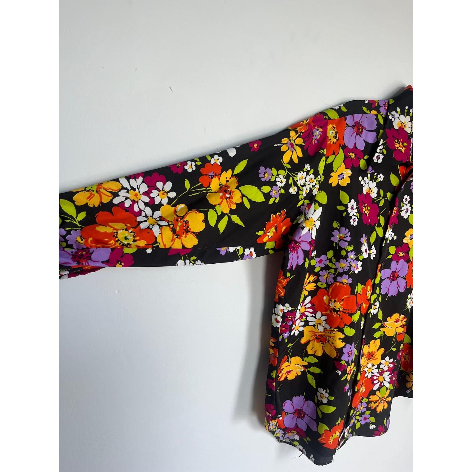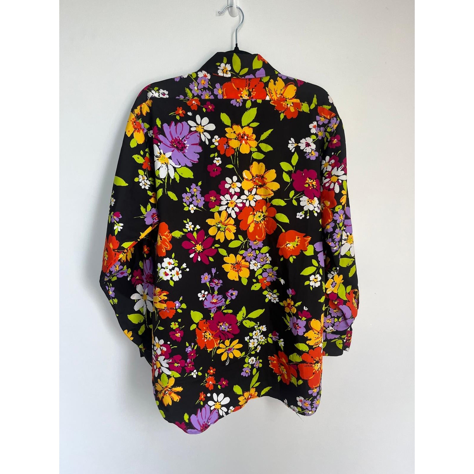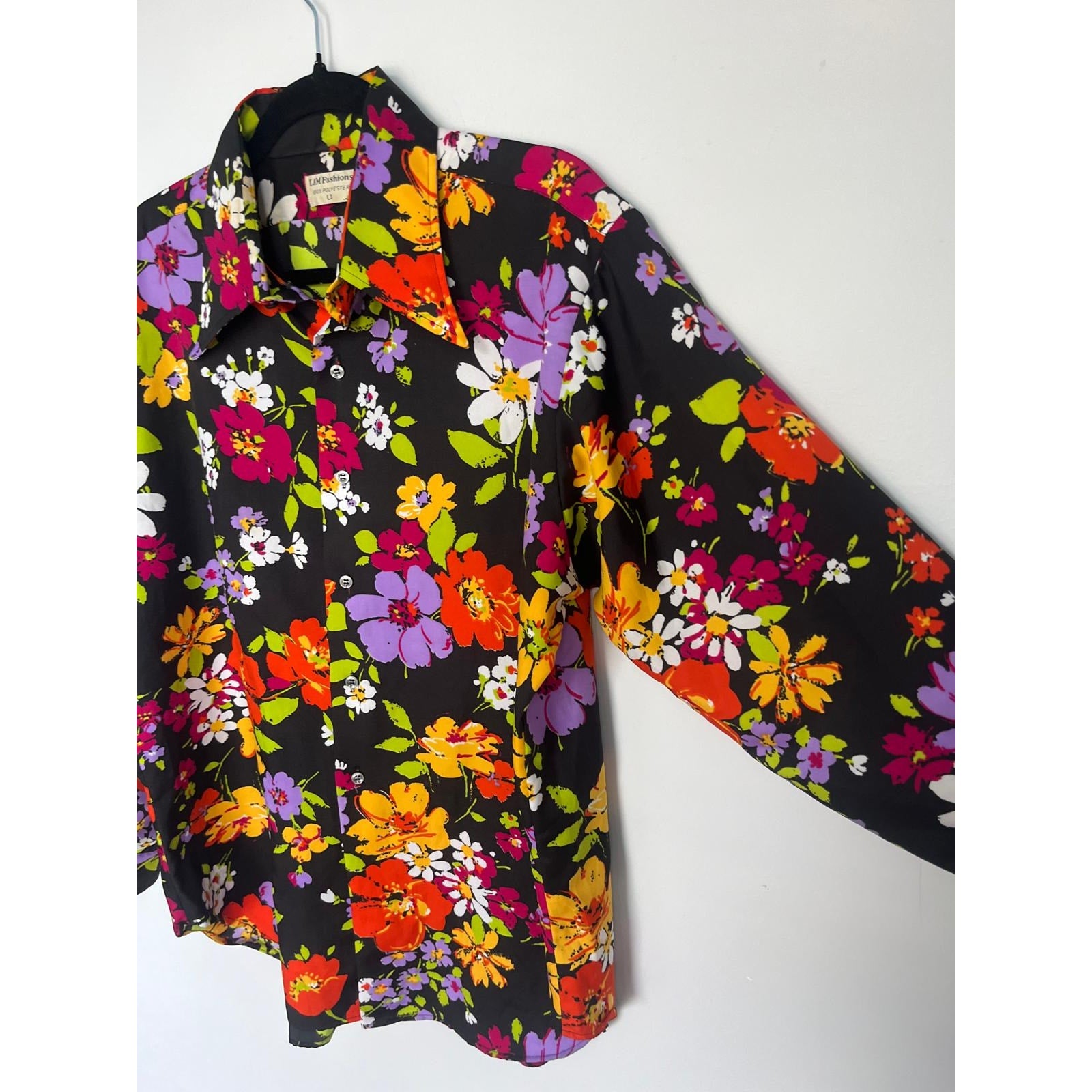 Bold floral button-up blouse in vibrant multicolor print on a black base. Features a pointed collar, long sleeves, and a lightweight polyester fabric with a retro 70s vibe.