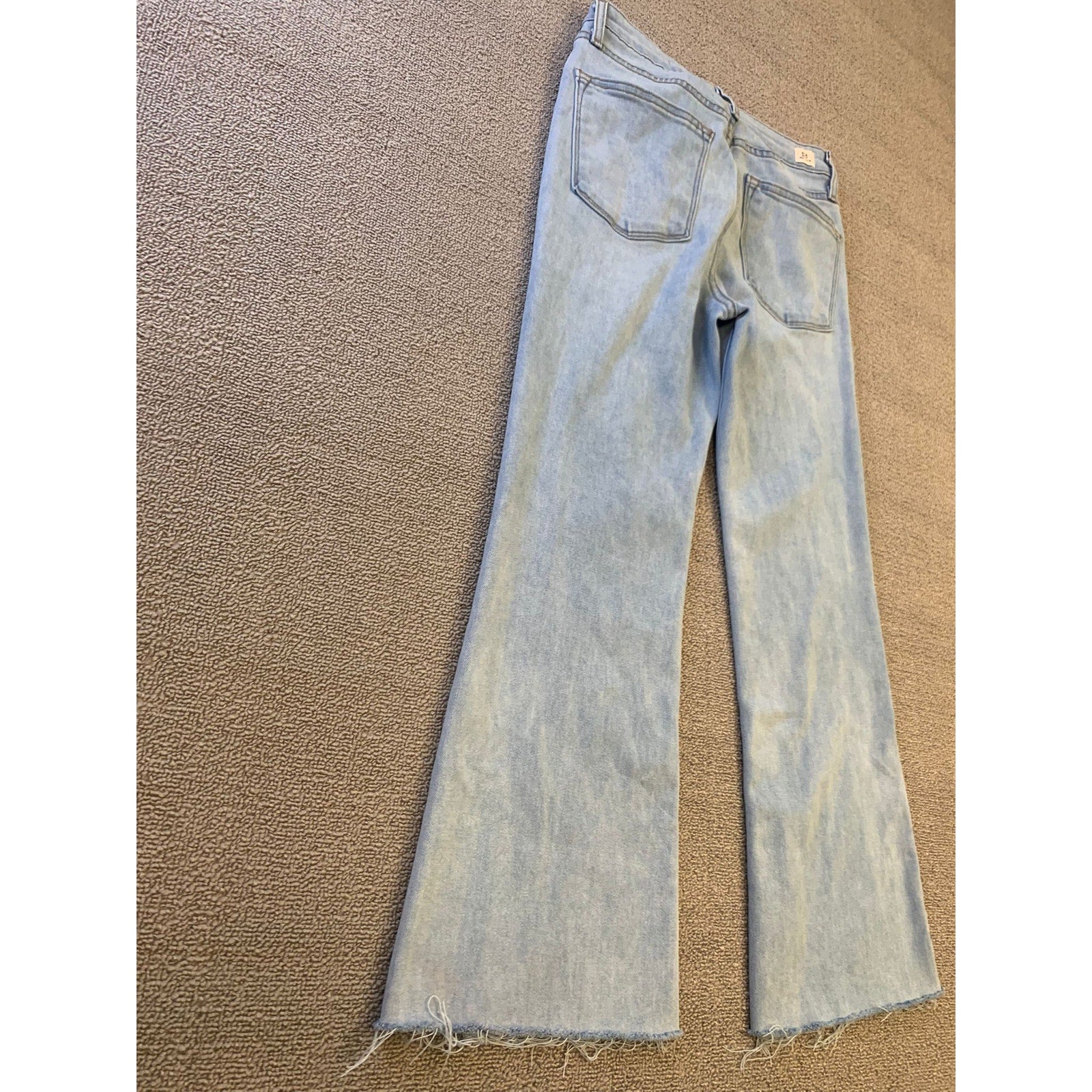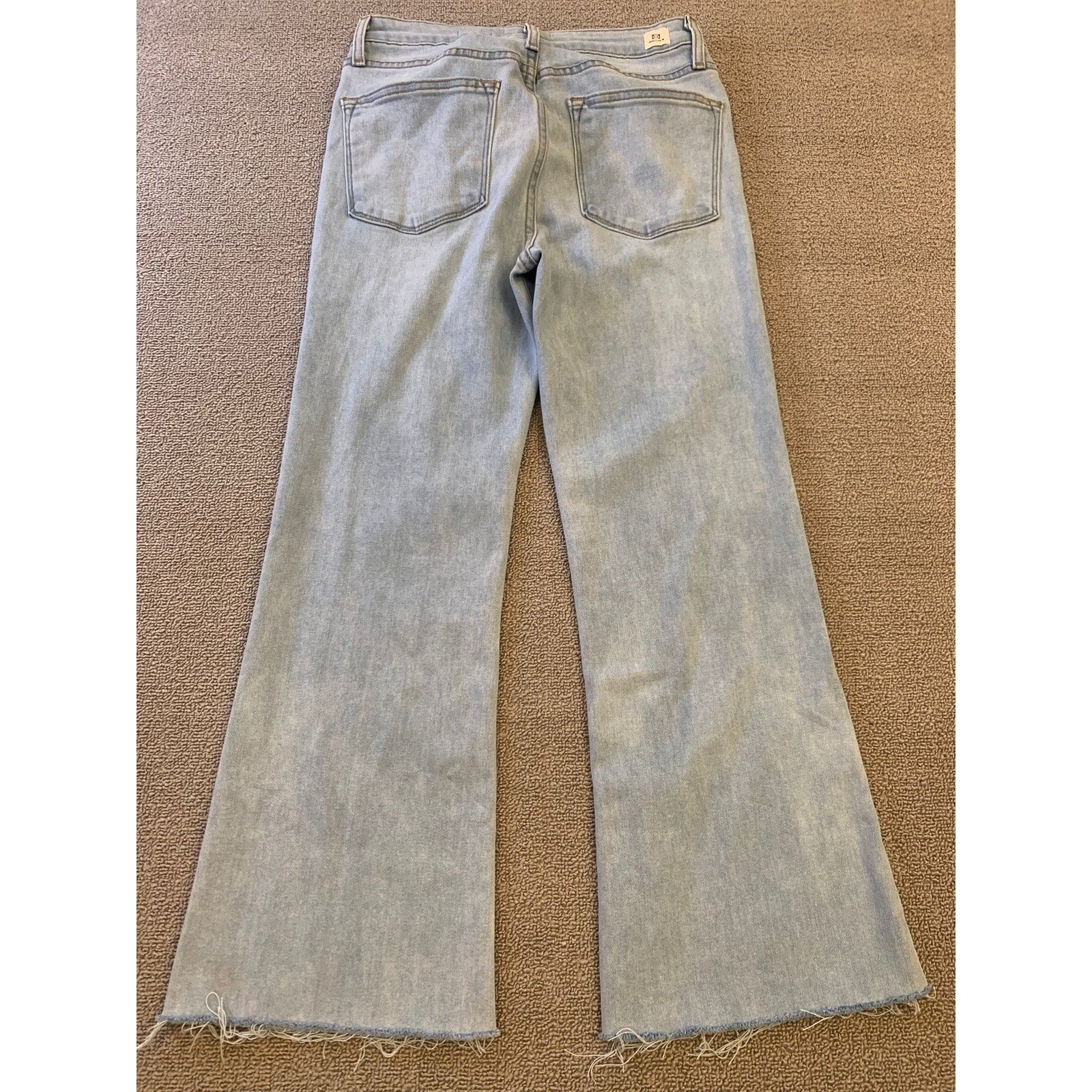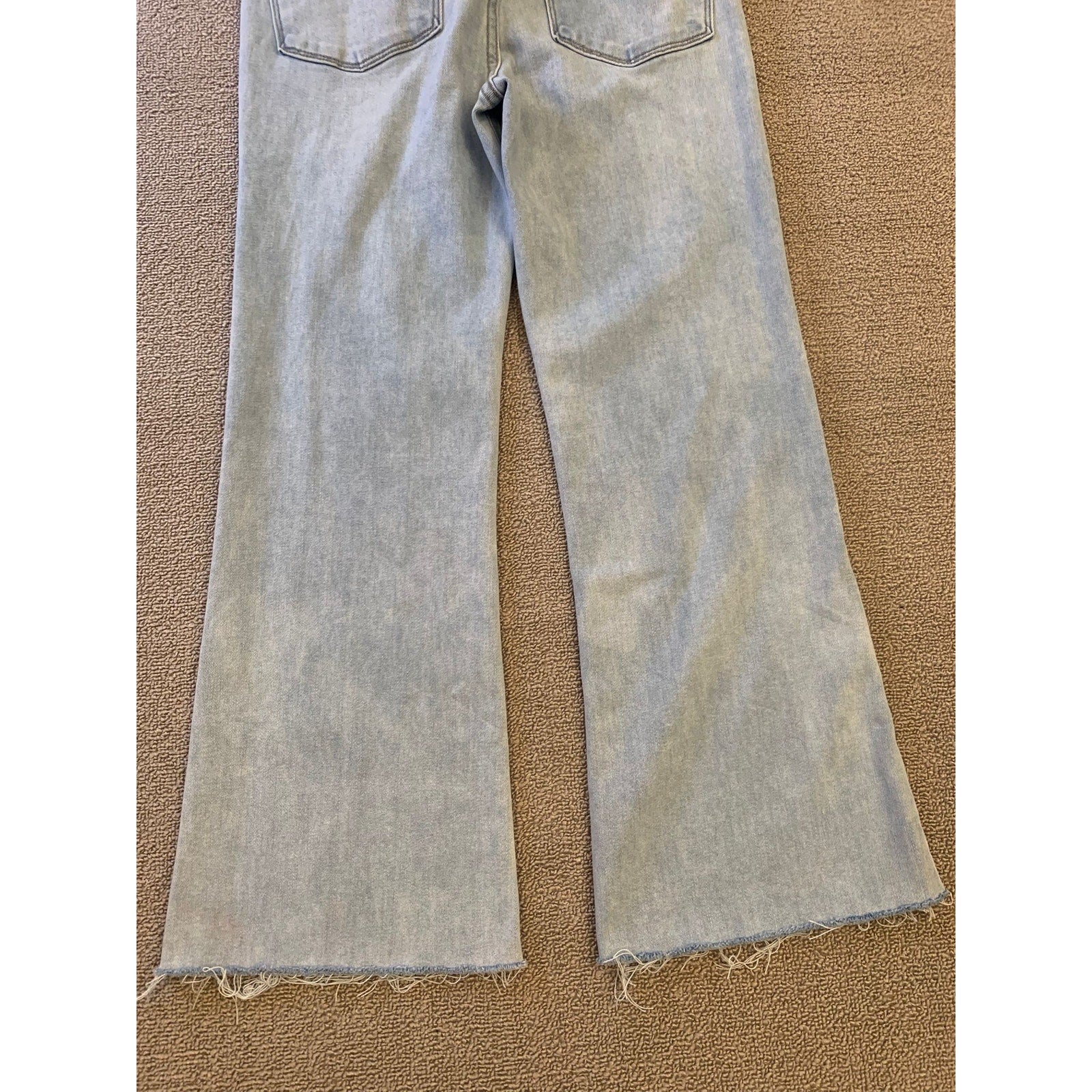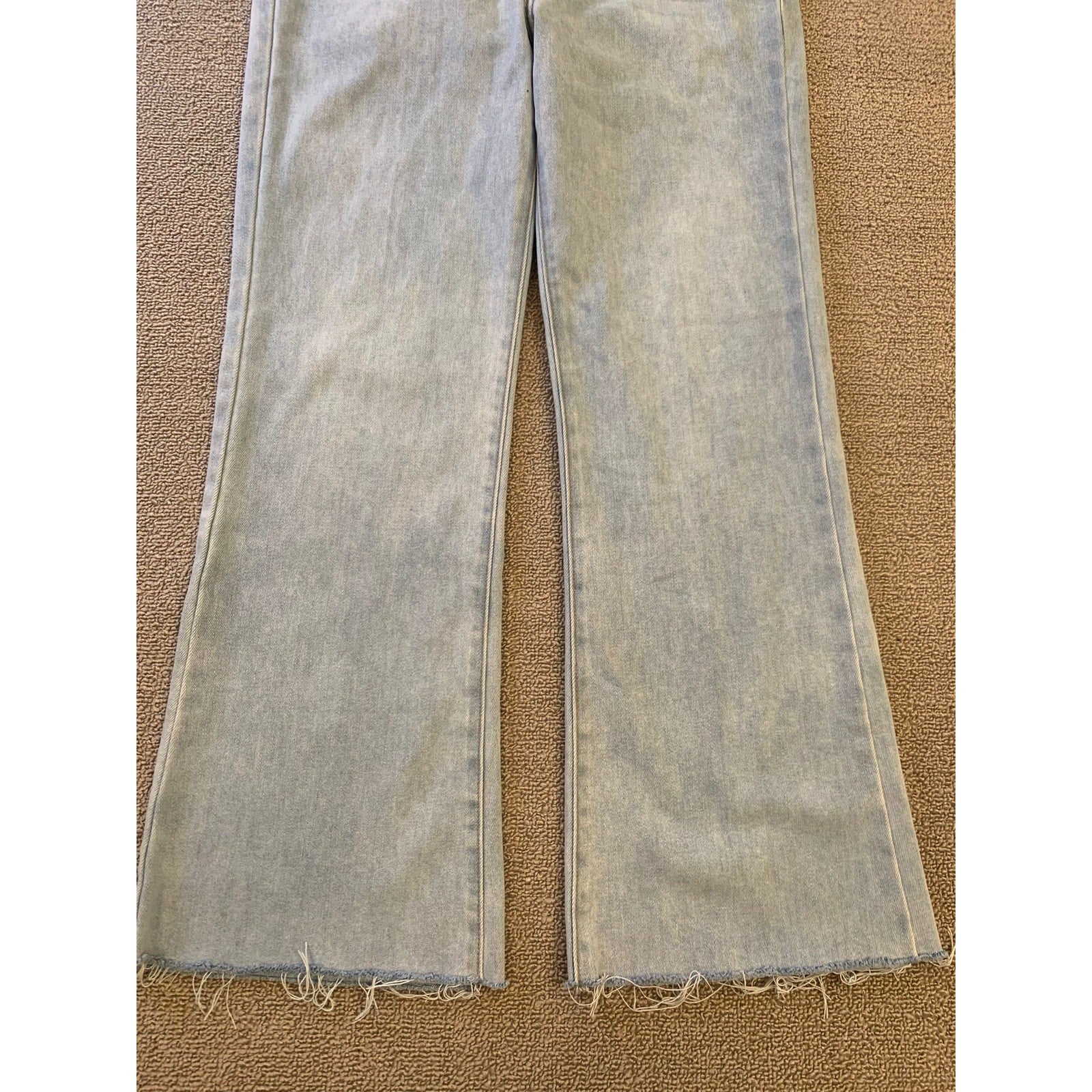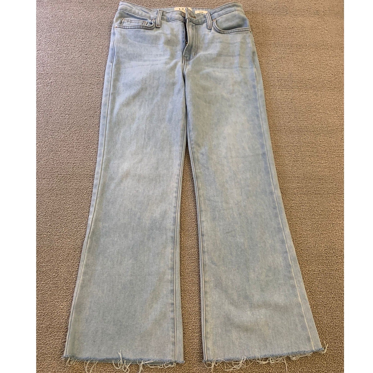 Light‑wash LTJ Denim (Letters to Juliet) flared-leg jeans featuring a raw, frayed hem and high-rise fit—American‑made in Los Angeles—perfect for vintage‑inspired or Y2K styling.