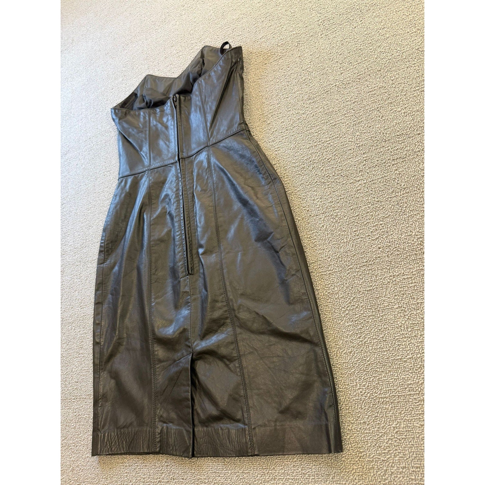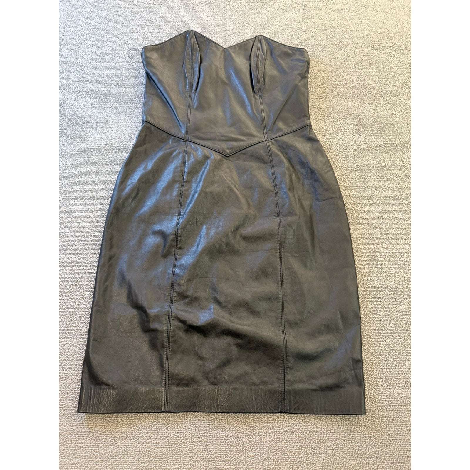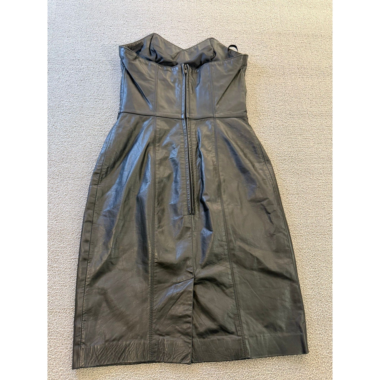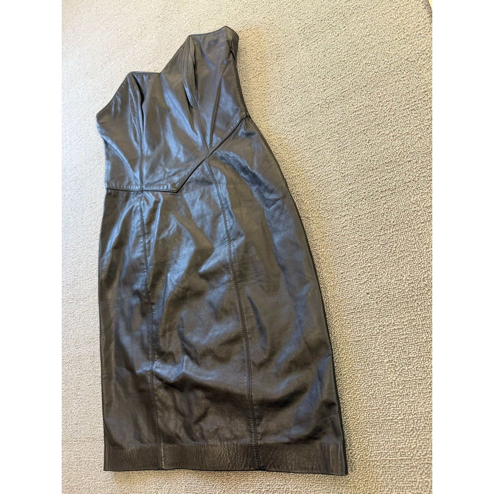 A sleek vintage strapless sheath dress by Laurice, crafted in rich black genuine leather. The structured corset bodice features defined seams and sculpted paneling for a flattering fit. The skirt falls to midi length with a subtle tailored silhouette—ideal for edgy evening wear or retro-inspired styling.