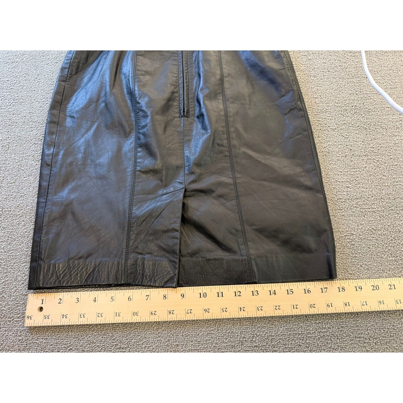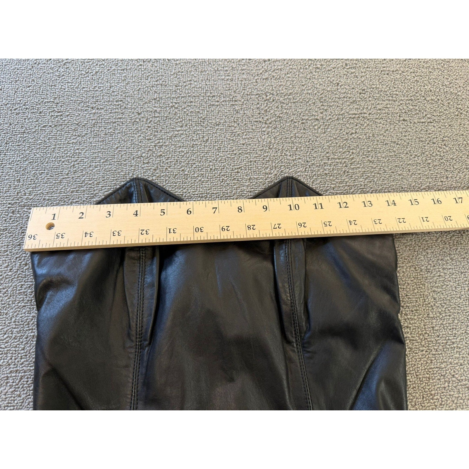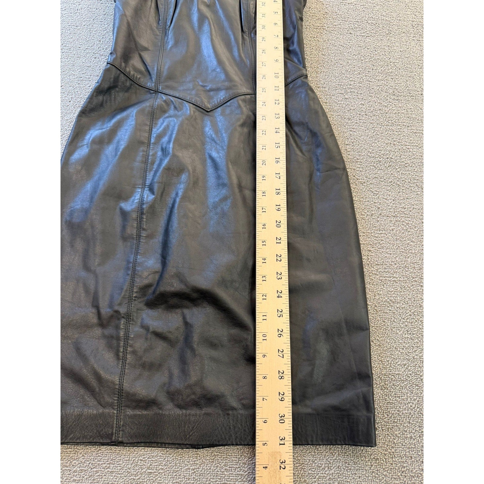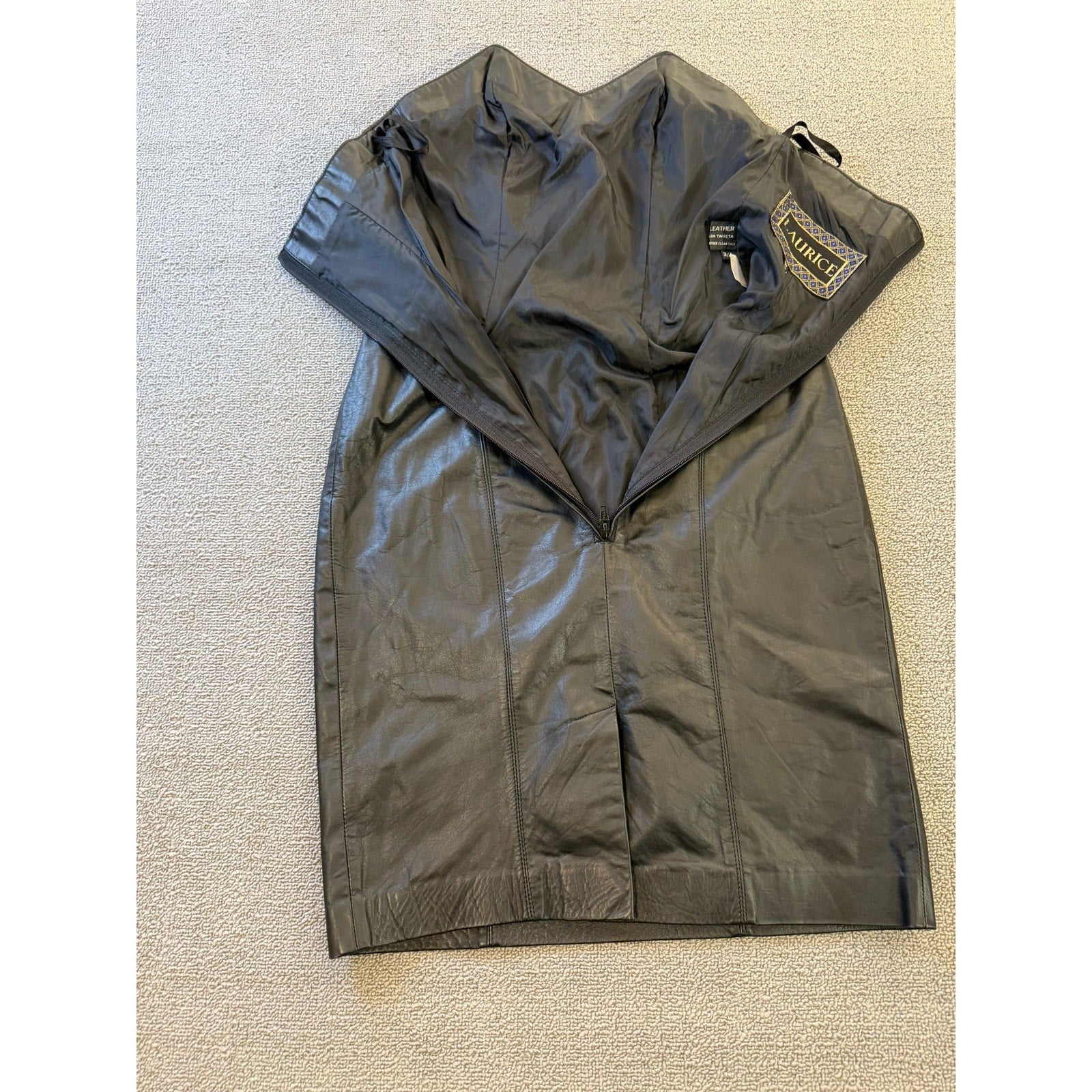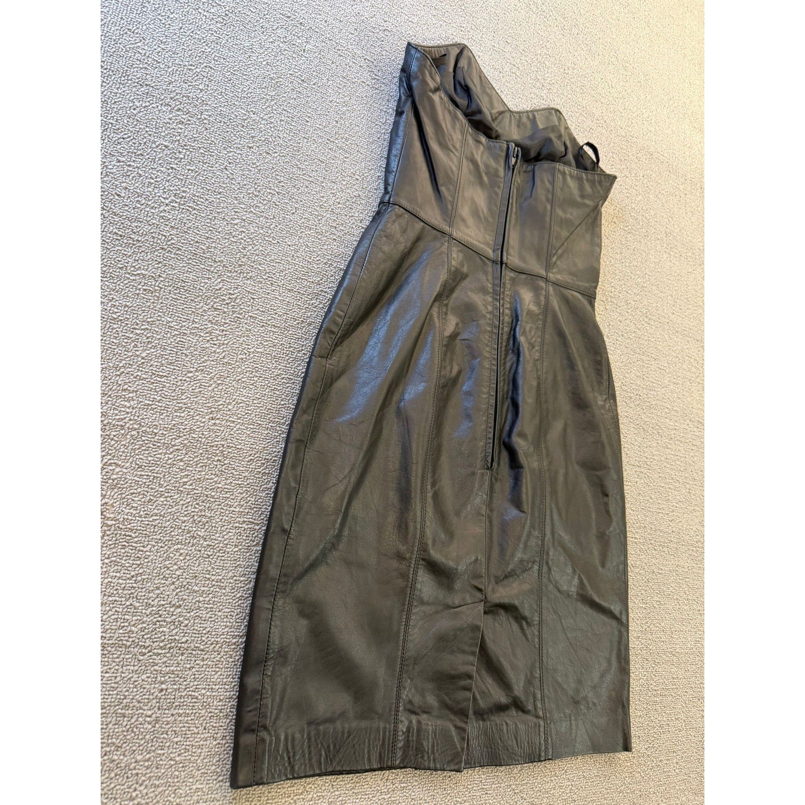A sleek vintage strapless sheath dress by Laurice, crafted in rich black genuine leather. The structured corset bodice features defined seams and sculpted paneling for a flattering fit. The skirt falls to midi length with a subtle tailored silhouette—ideal for edgy evening wear or retro-inspired styling.