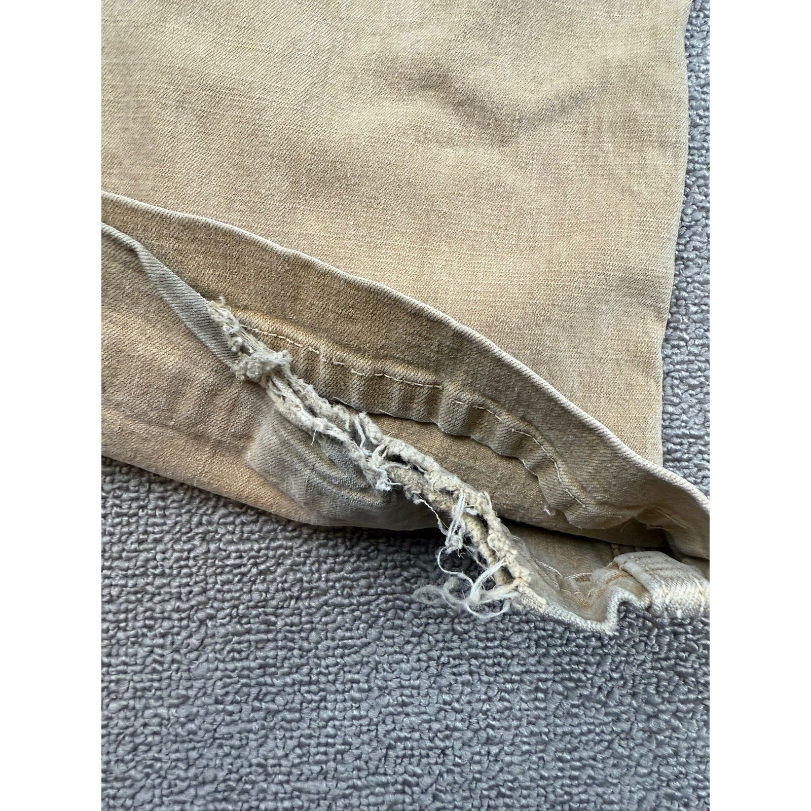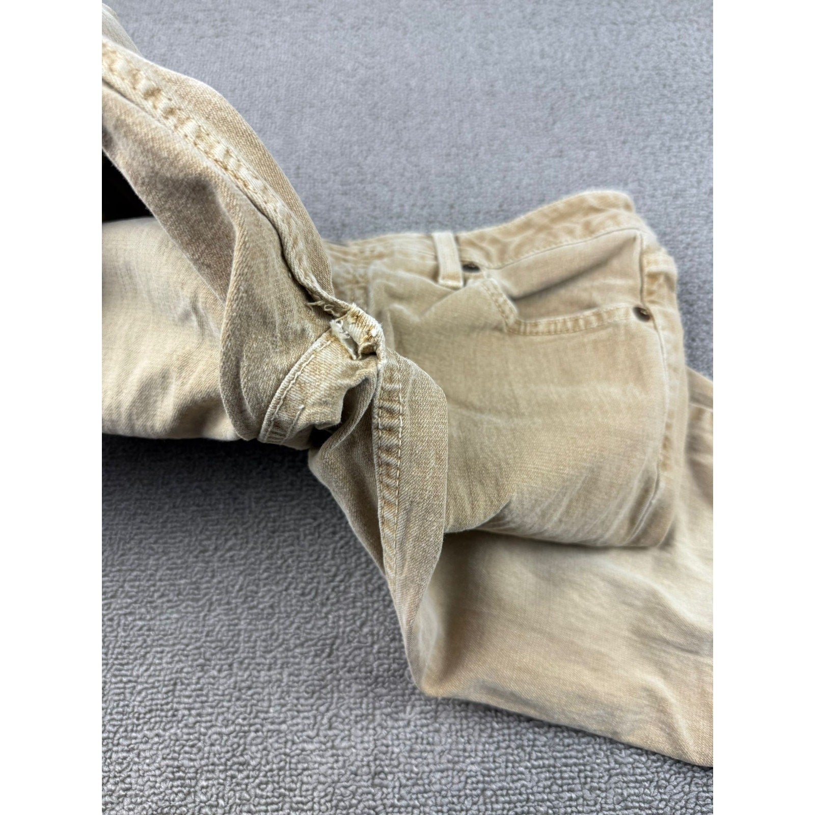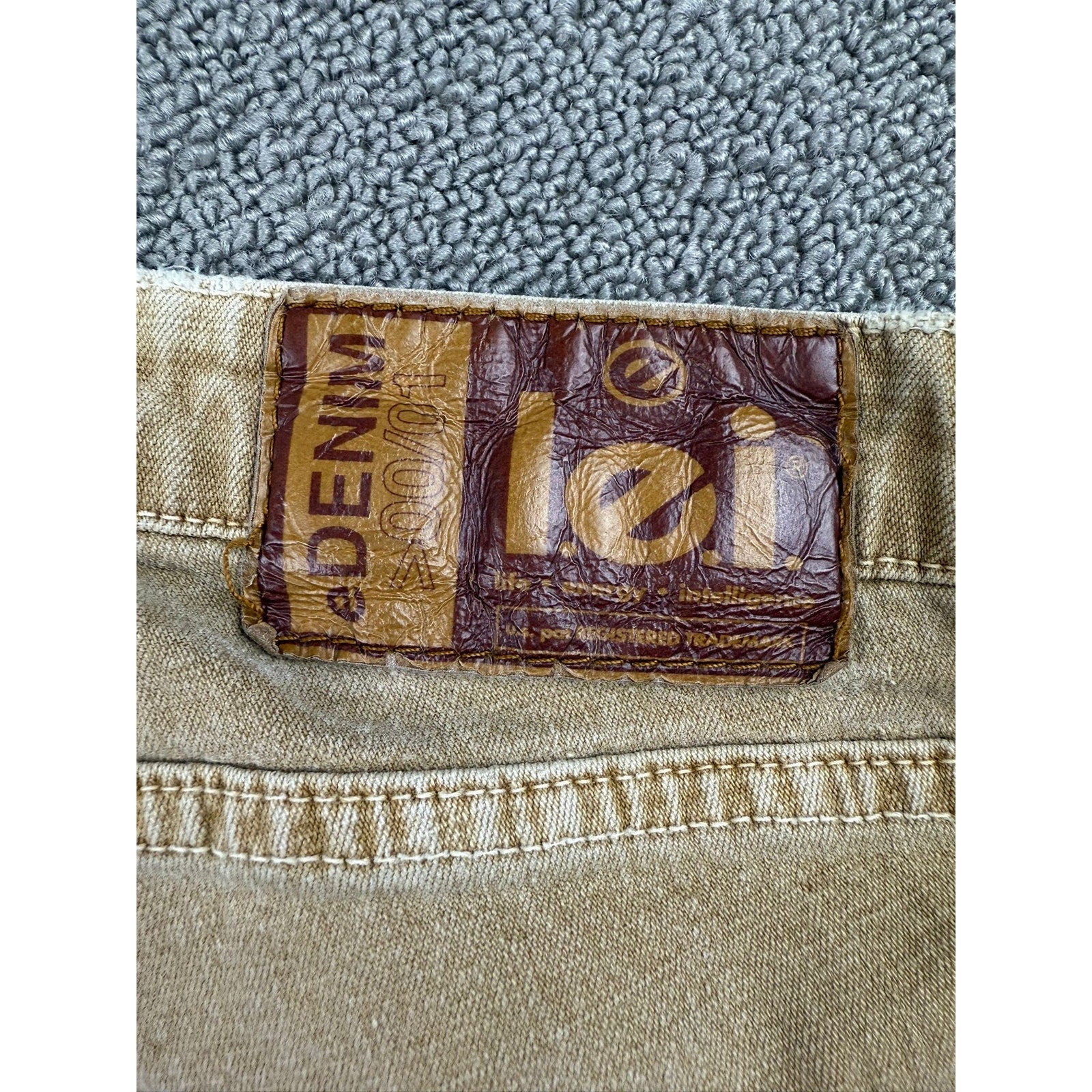 A pair of vintage Lei tan Jeans featuring a classic bootcut leg, traditional five-pocket styling with metal rivets, and the waistband patch. The light tan tone and worn-in patina add authentic vintage character.