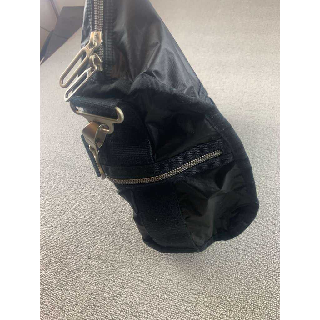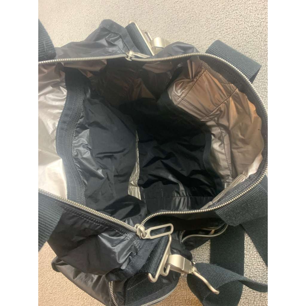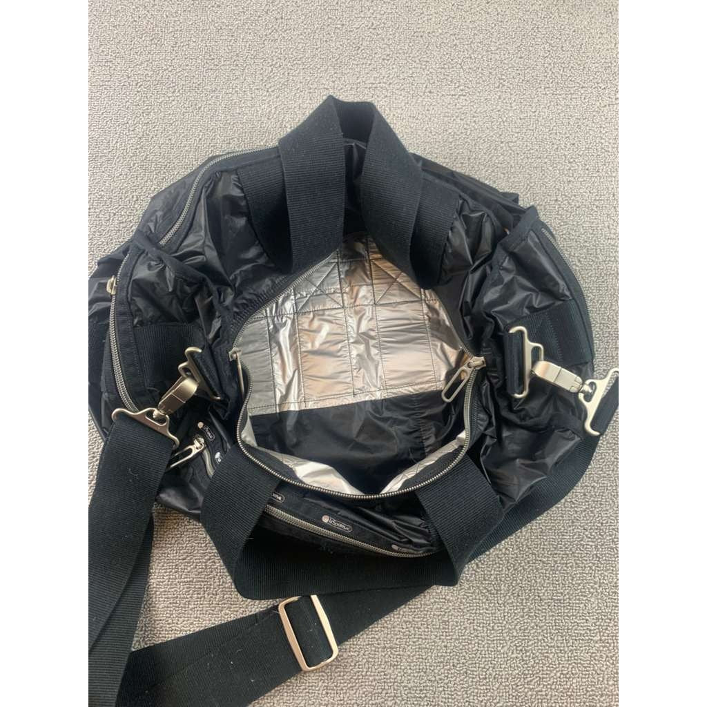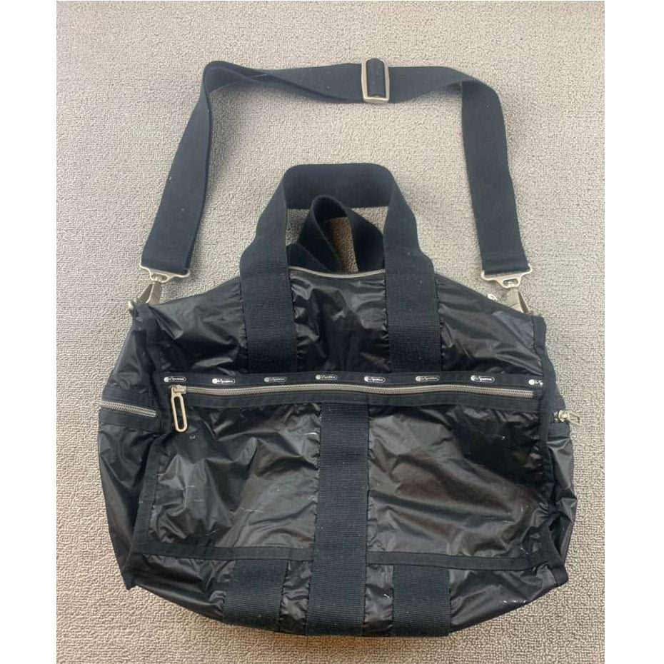 Lightweight black ripstop nylon weekender with dual top handles and detachable adjustable shoulder strap. Exterior zip pocket with LeSportsac logo tape; soft-structure packable design—great as carry-on or gym/overnight bag.