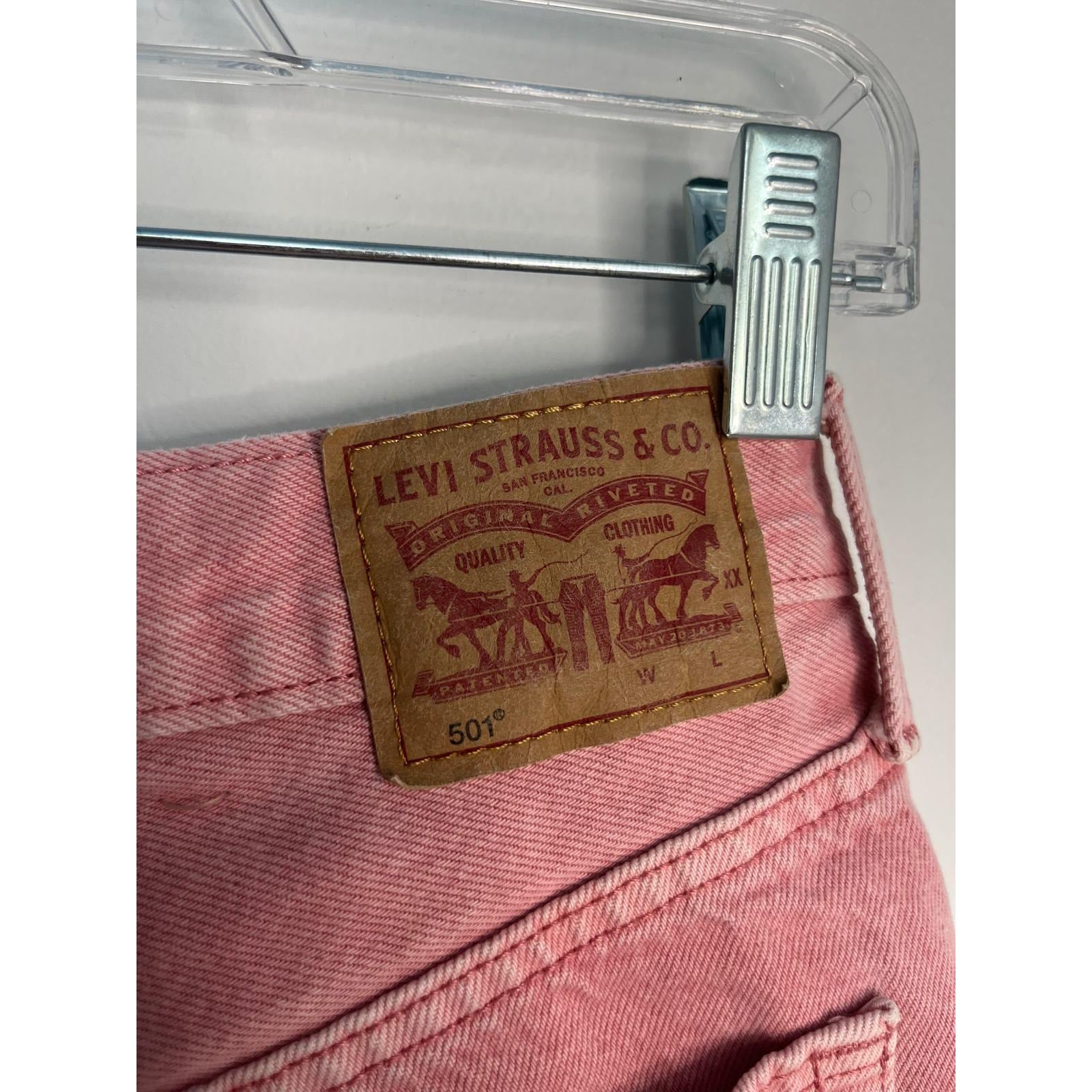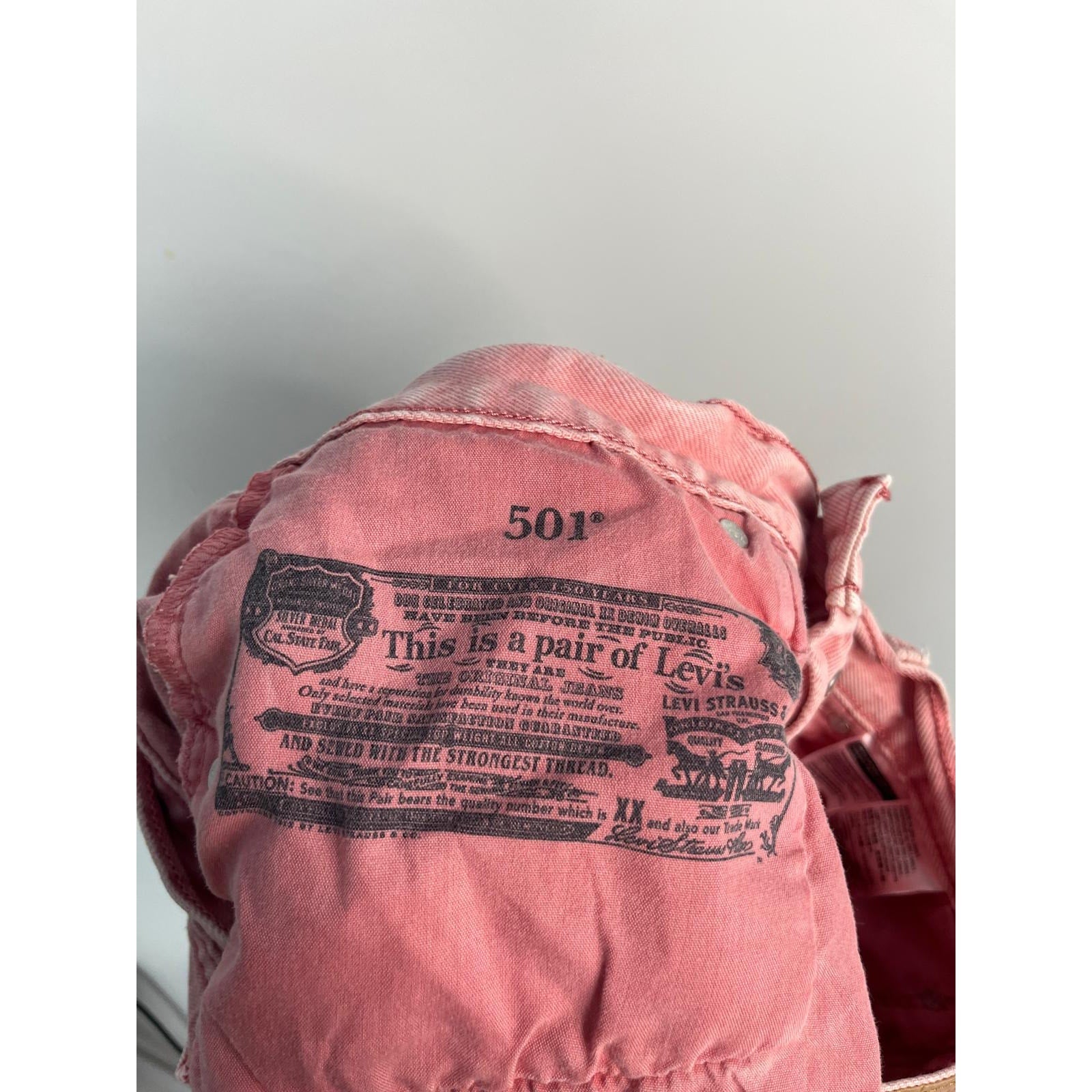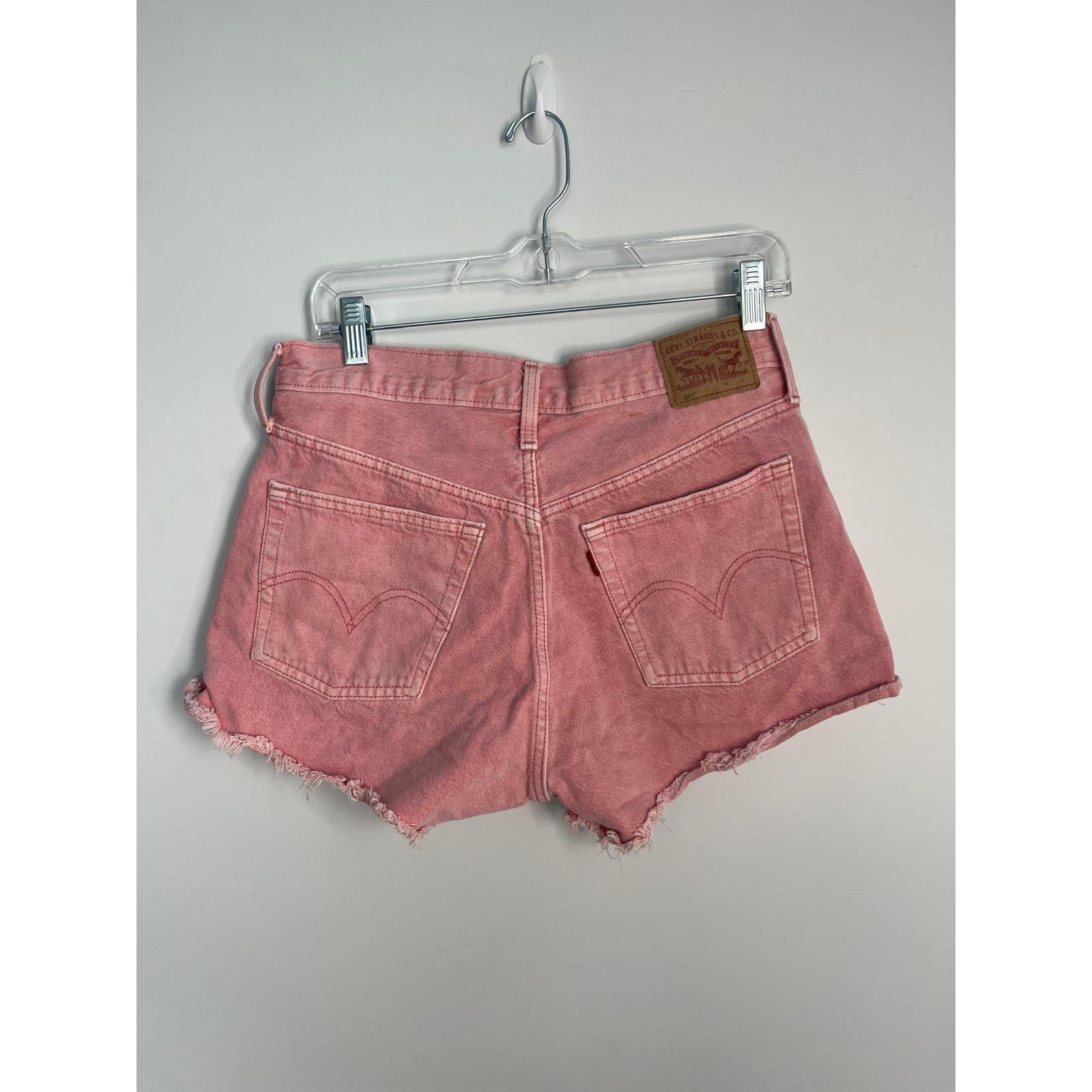 Classic Levi’s 501 button-fly cutoff denim shorts in a pink wash with a frayed hem. High-rise fit with traditional 5-pocket styling and distressed edges.