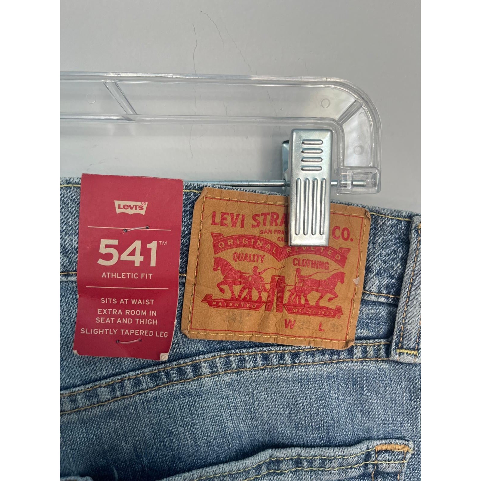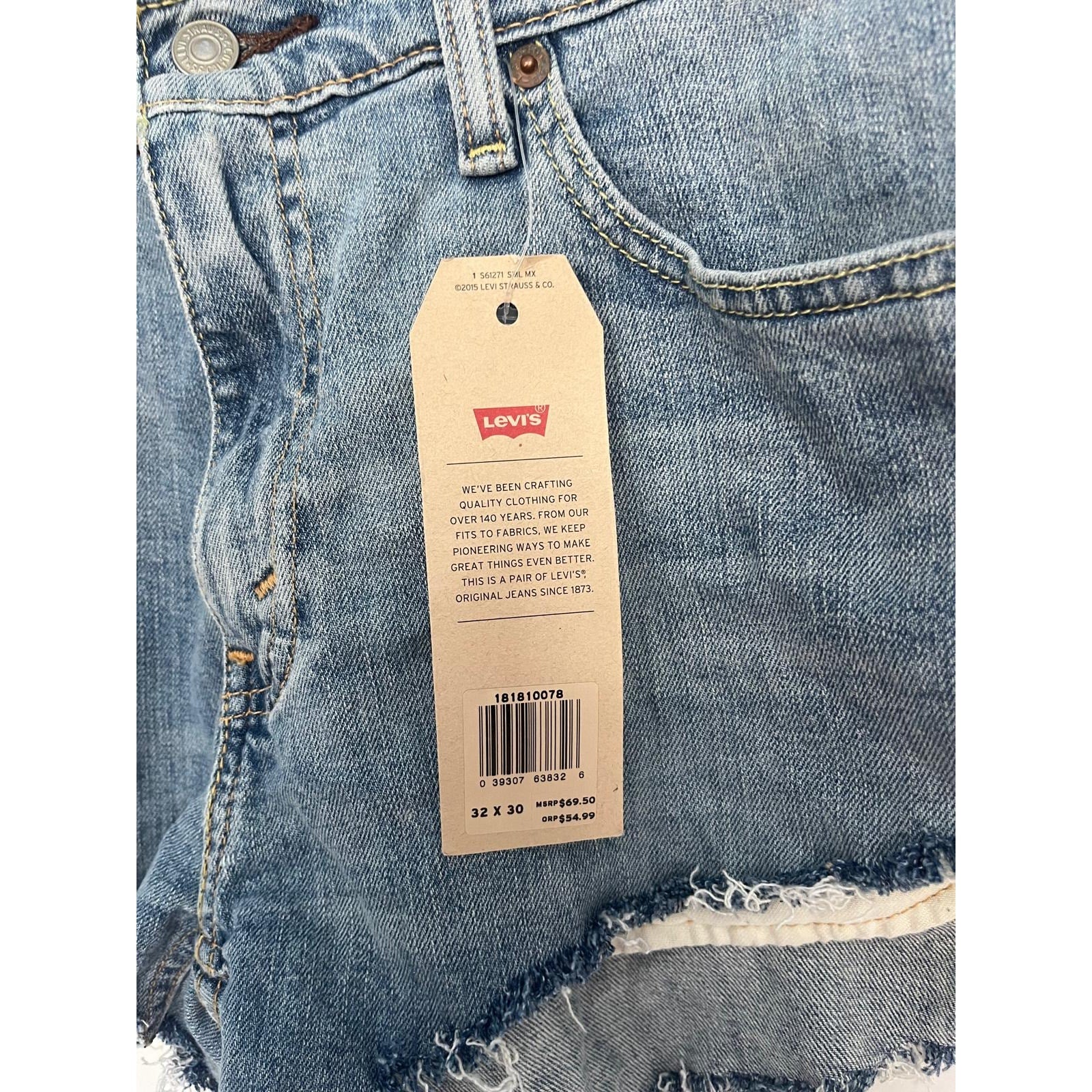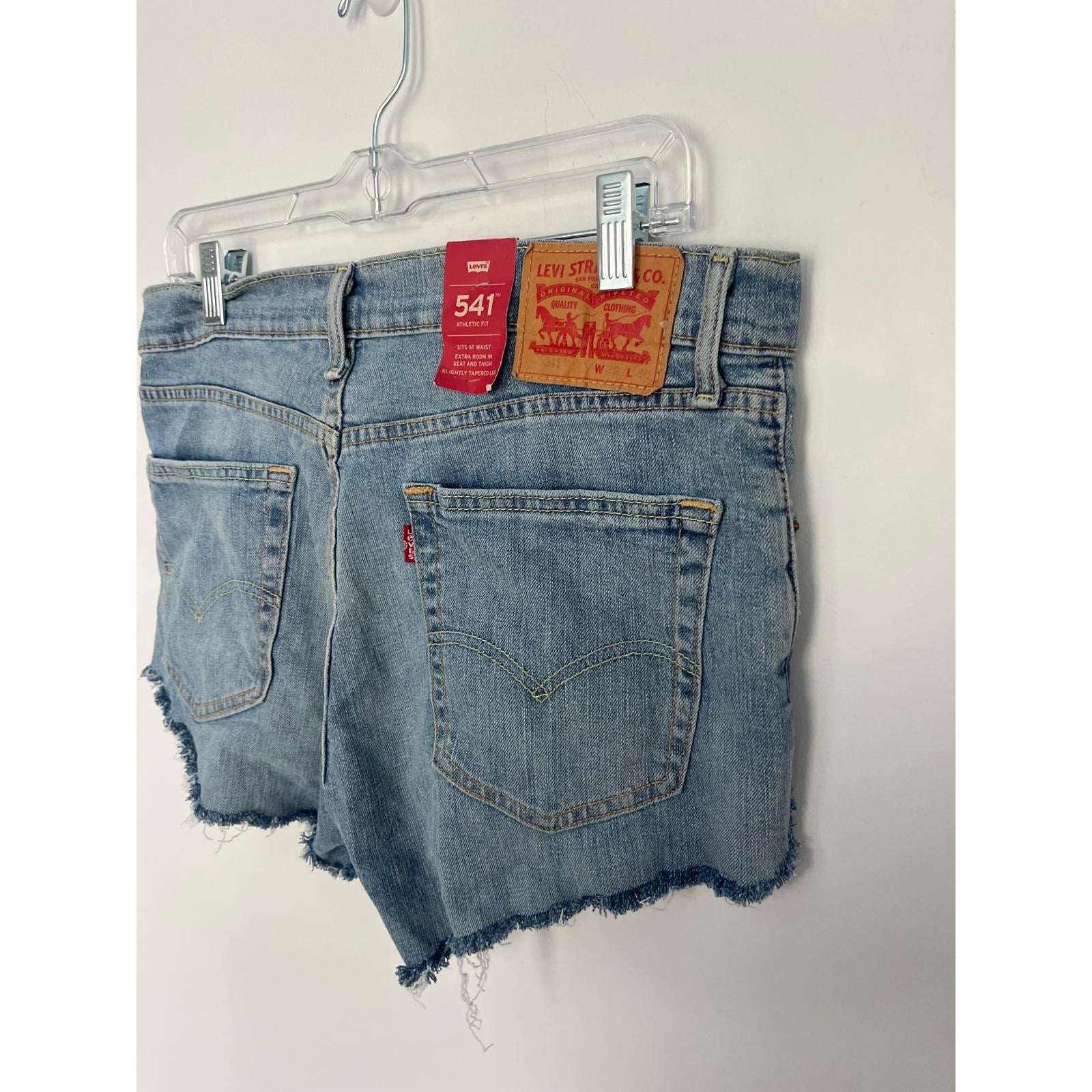 Levi's 541 denim cutoff shorts featuring a high rise and raw frayed hem. Slightly tapered with extra room in the seat and thigh. Classic five-pocket design with Levi's branded button and back patch.