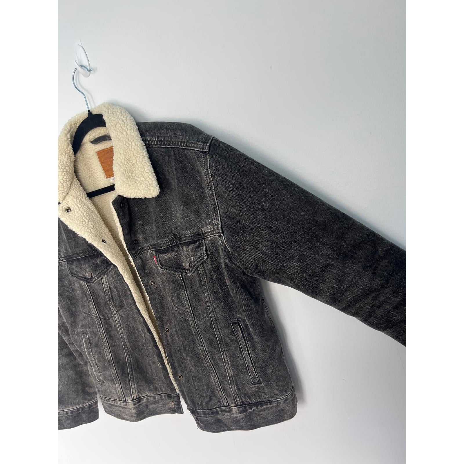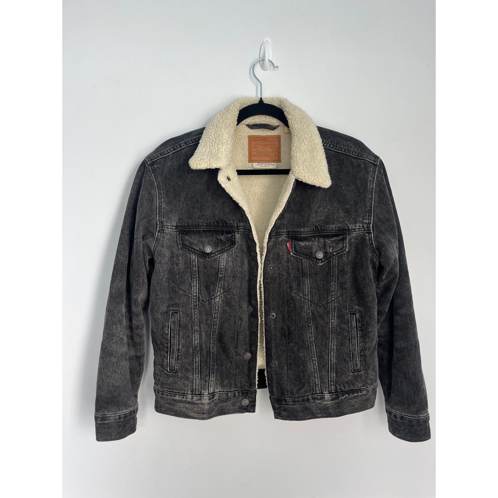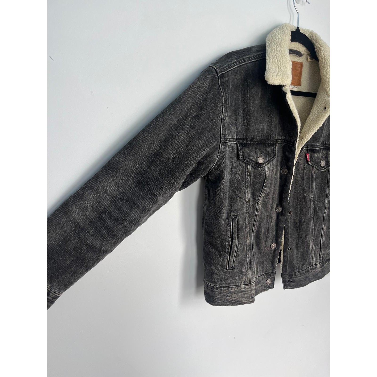 Classic Levi’s Premium trucker jacket in black faded denim with sherpa fleece lining. Button-up front, dual chest pockets, and side slit pockets. Warm and rugged—perfect for fall and winter layering.