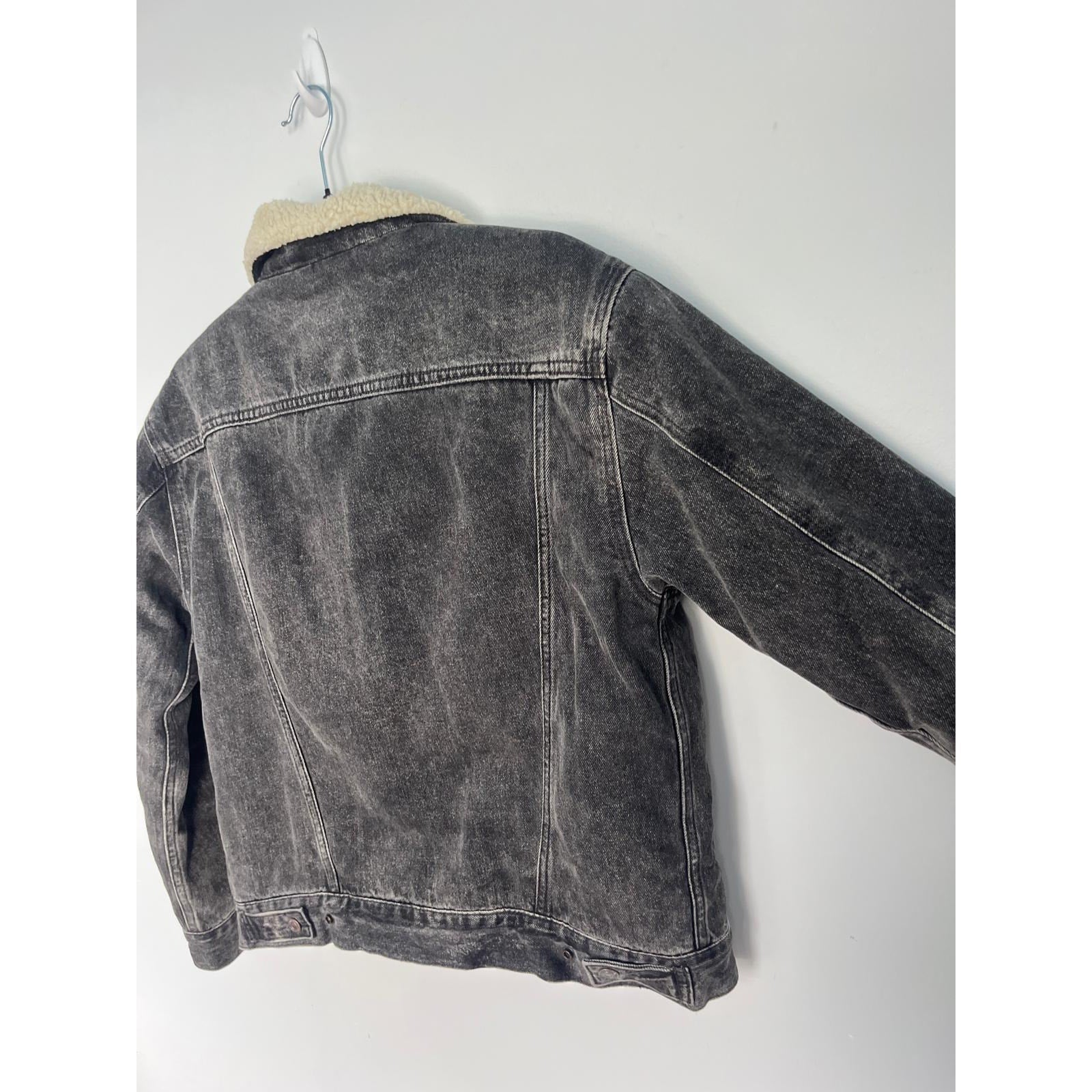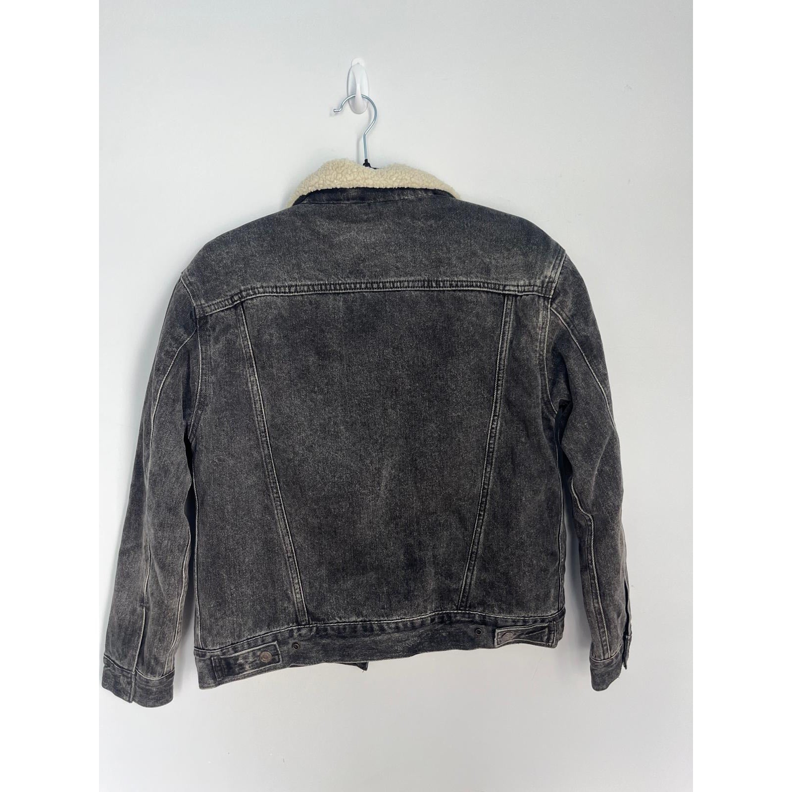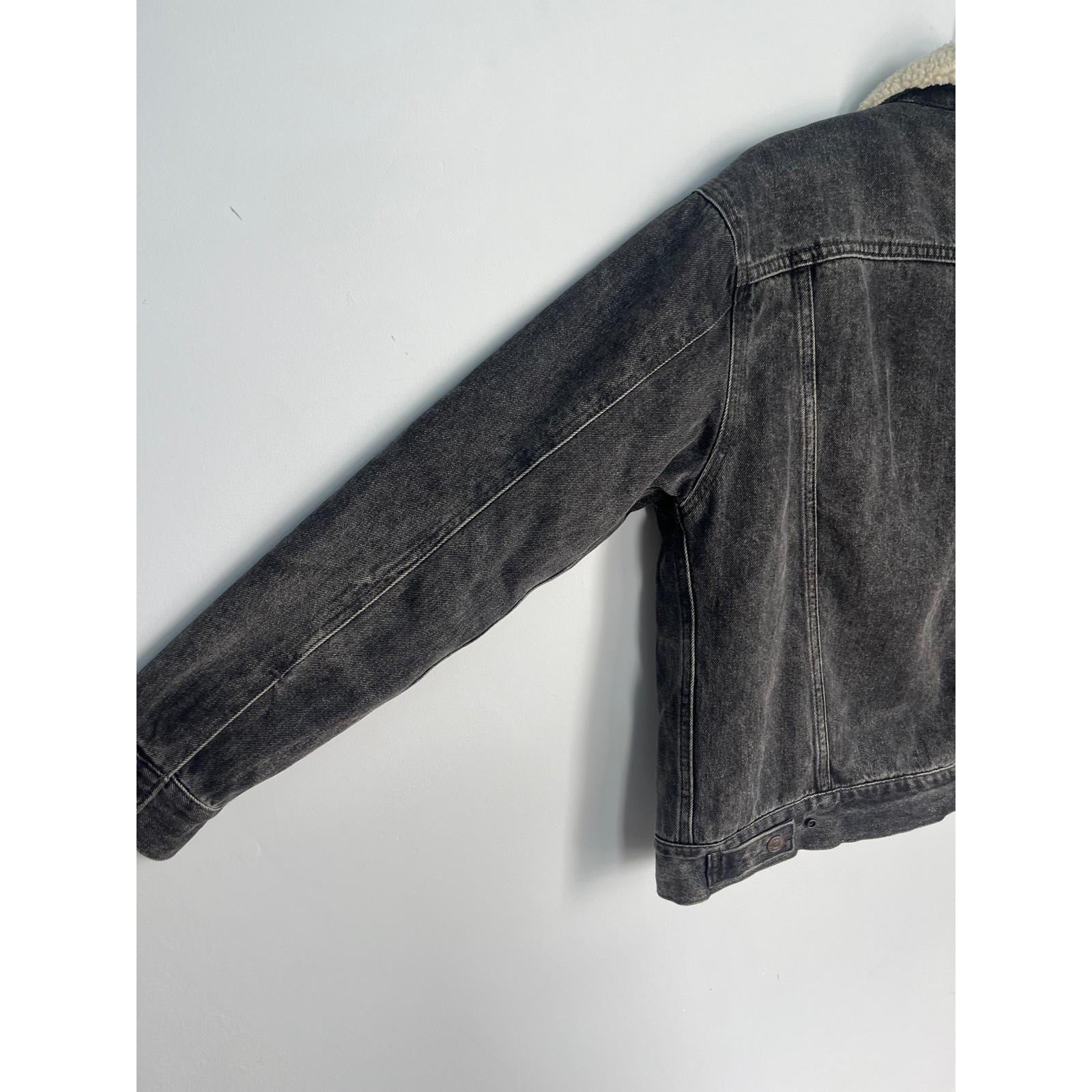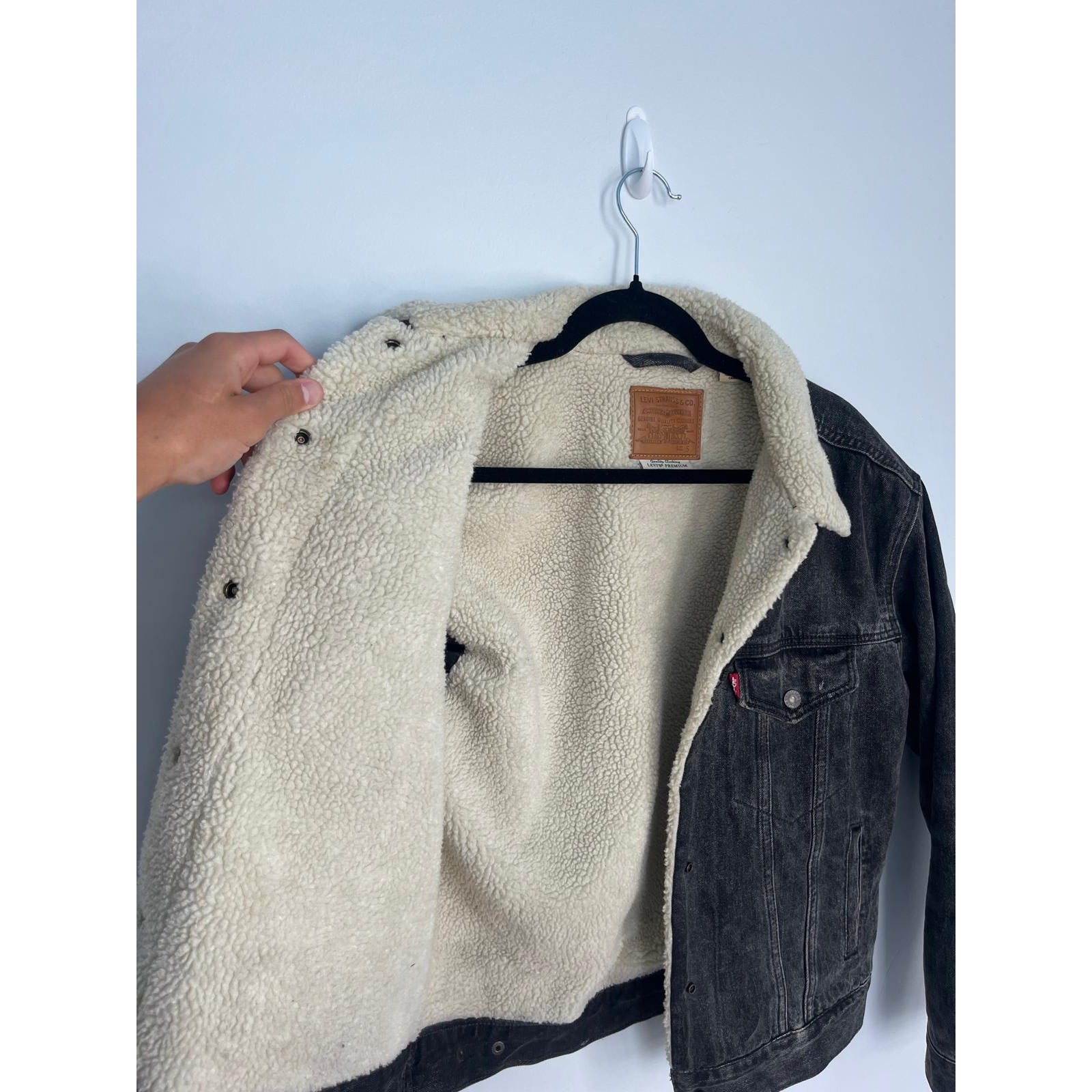 Classic Levi’s Premium trucker jacket in black faded denim with sherpa fleece lining. Button-up front, dual chest pockets, and side slit pockets. Warm and rugged—perfect for fall and winter layering.