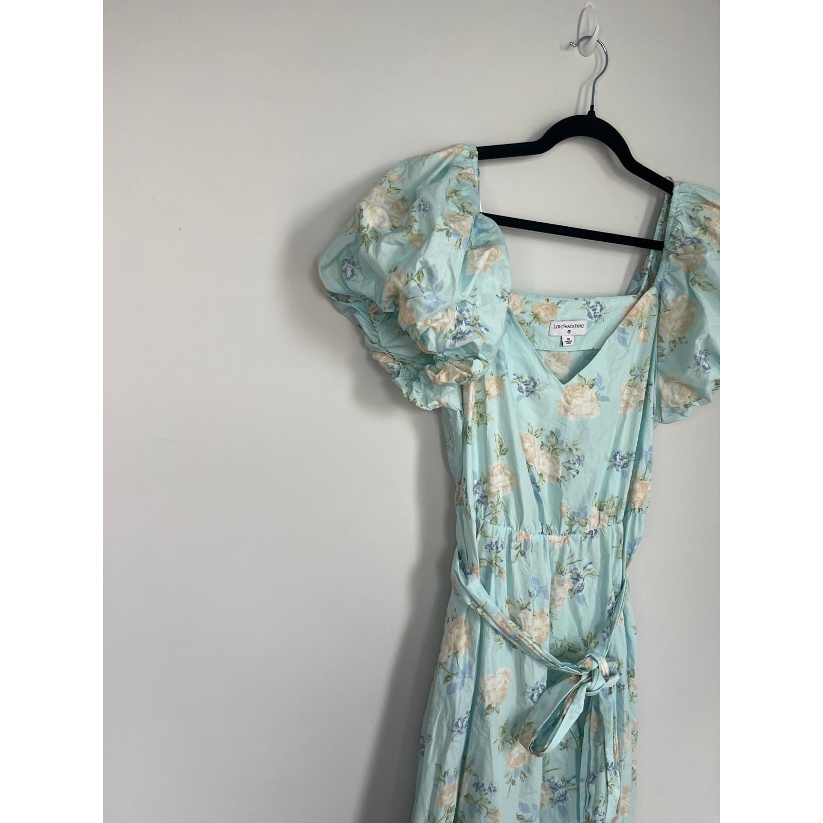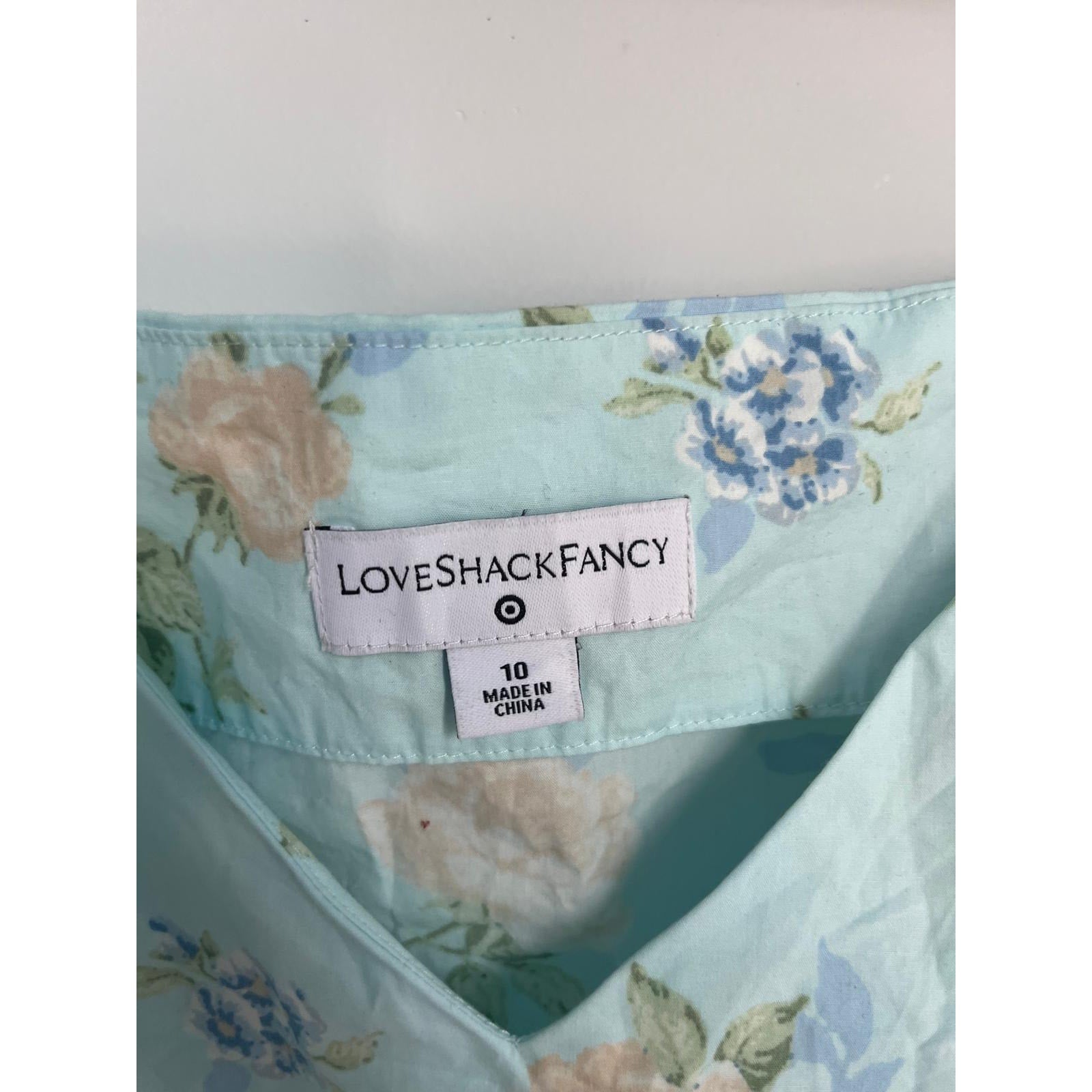 Floral puff sleeve midi dress with a feminine silhouette and ruffled hem, designed in collaboration between LoveShackFancy and Target. Features a belted waist and pastel floral print.