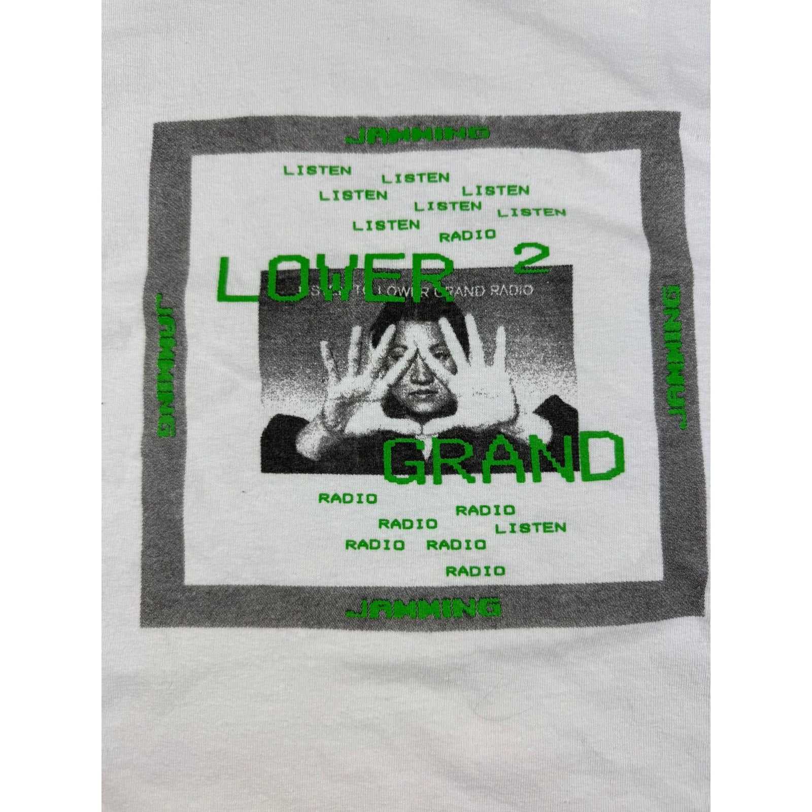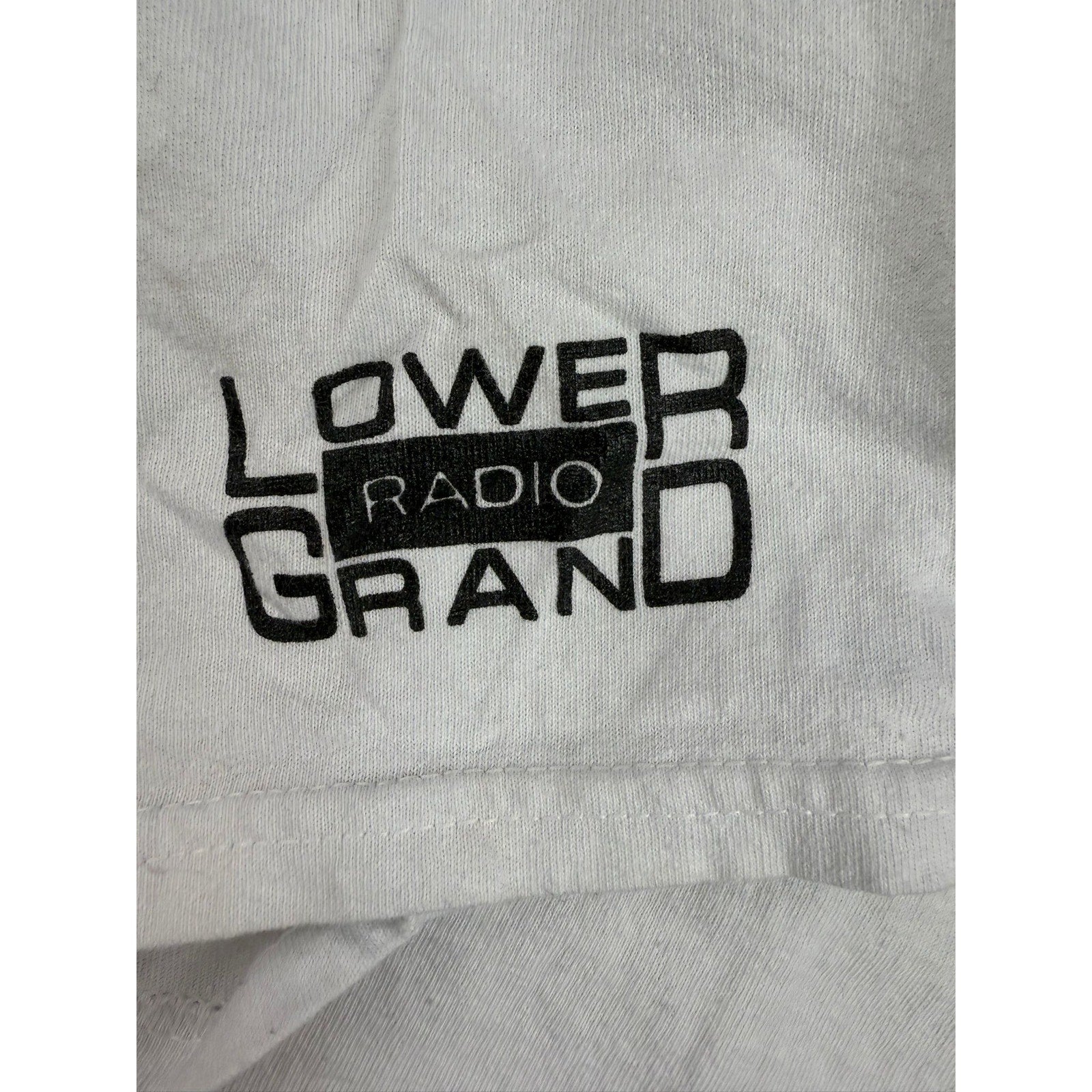 Authentic Lower Grand Radio (LGR) station T-shirt featuring a bold front graphic rectangle with a grayscale image and green text overlay reading “Lower Grand Radio” and additional “radio” motifs in repeating pattern. Designed to represent the Oakland-based independent radio station’s brand—ideal for fans, collectors, or music culture enthusiasts.